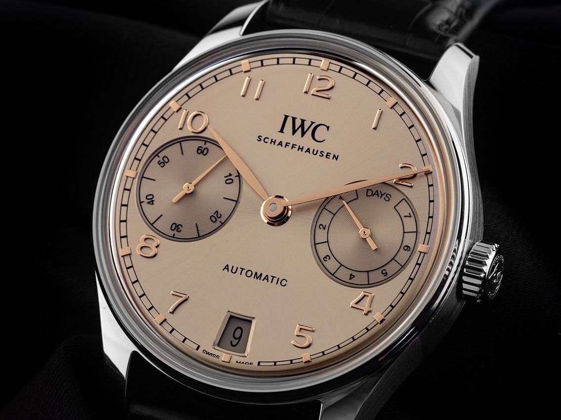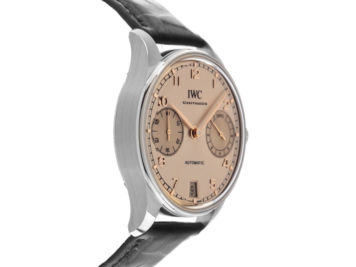 IWC Portugieser 7 Tage Gangreserve Stahl Automatik Armband Leder FaltschließeGehäuse Edelstahl poliert und satiniert, Gehäusedurchmesser ohne Krone 42,3mm, Gehäusehöhe 13,1mm. IWC Armband Krokoleder schwarz mit Ziernaht. Anstoßbreite 22mm, IWC Sicherheitsfaltschließe Edelstahl mit Hersteller-Logo. Zifferblatt champagnerfarben mit aufgesetzten roségoldenen arabischen Ziffern und roségoldenen Zeigern. Uhrwerk Automatik, Kaliber 52010 mit 31 Edelsteinen, 7 Tage Gangreserve. Anzeige von Stunde und Minute über Zeiger aus der Mitte, kleine Sekunde mit Sekundenstopp zur sekundengenauen Einstellung der Uhrzeit bei 9 Uhr, Datumsanzeige mit Schnellverstellung bei 6 Uhr, Gangreserveanzeige bei 3 Uhr. Saphirglas kratzfest. Krone mit Hersteller-Logo. Boden Edelstahl 4-Fach verschraubt mit Saphirglas Sichtfenster. Gewicht der Uhr inklusive Armband 101g. Wasserdicht bis 3 ATM. Referenznummer: IW501705, ID: ST1160199920825H-14000, Artikelnummer: 10000081935. Original IWC Box mit Umkarton und Garantie Papiere von August 2025 sowie Beschreibung, Full Set. Ungetragen. Lieferzeit sofort.