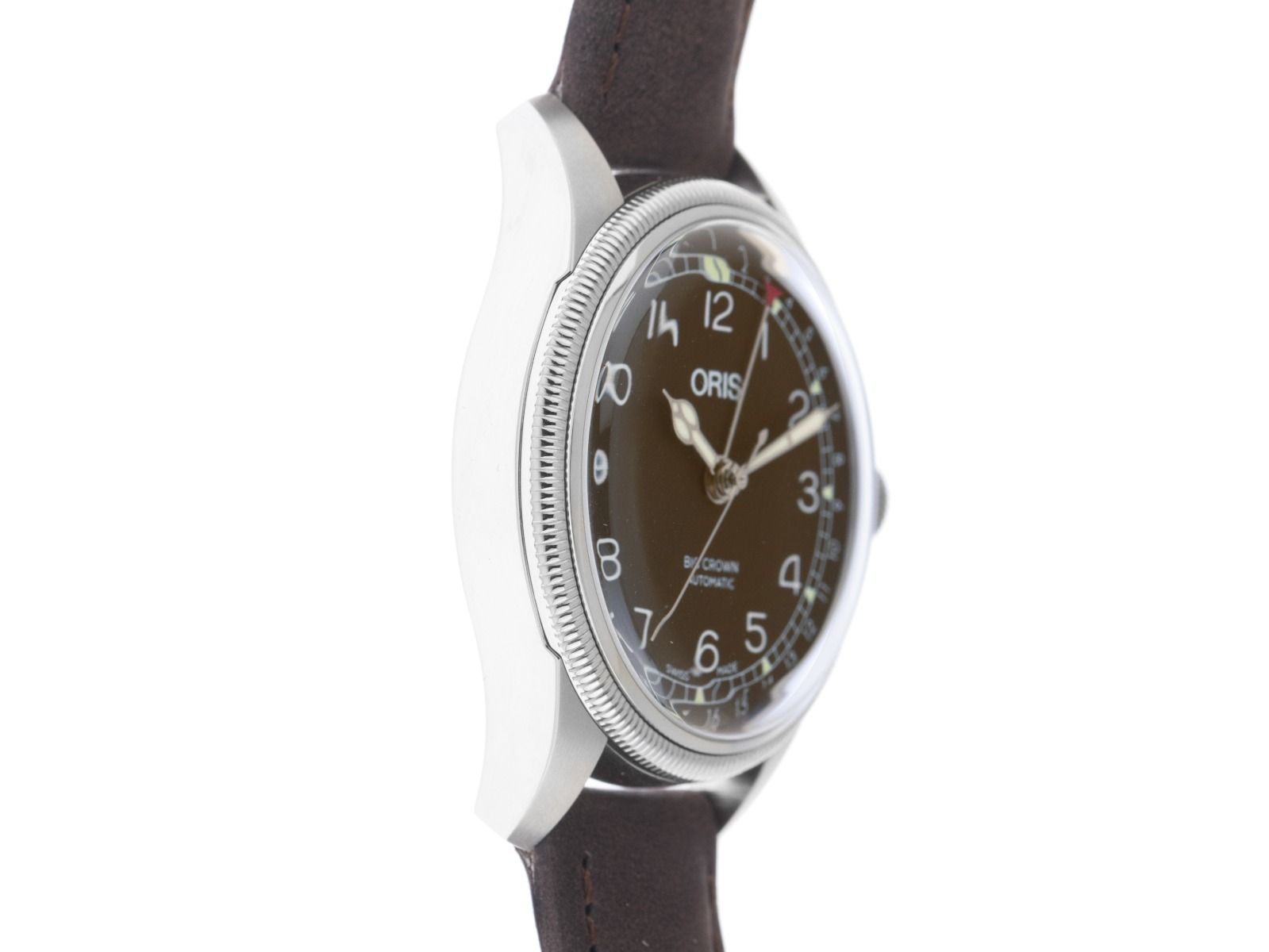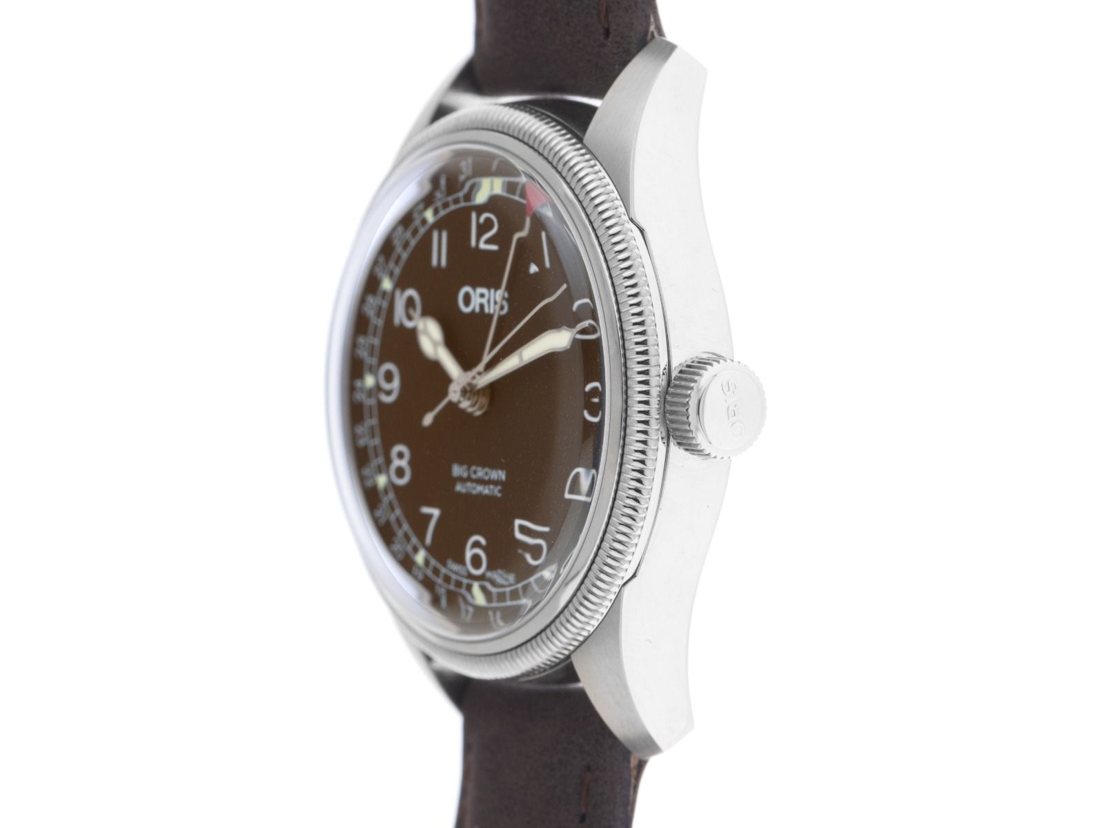 Oris Big Crown Stahl Automatik Armband LederGehäuse Edelstahl poliert und satiniert, Gehäusedurchmesser ohne Krone 36mm, Gehäusehöhe 12,4mm. Lünette Edelstahl gerädelt. Armband Leder braun mit Ziernaht, Anstoßbreite 17mm, Stiftschließe Edelstahl mit Hersteller-Logo. Zifferblatt braun mit arabischen Ziffern und Edelstahl Leuchtzeigern. Uhrwerk Automatik, Kaliber Oris 754 mit 26 Edelsteinen, Gangreserve ca. 38 Stunden. Anzeige von Stunde, Minute und Sekunde über Zeiger aus der Mitte mit Sekundenstopp zur sekundengenauen Einstellung der Uhrzeit, Datumsanzeige mit Schnellverstellung über Zeiger aus der Mitte. Saphirglas kratzfest und gewölbt. Krone verschraubbar mit Hersteller-Logo. Boden Edelstahl verschraubt und graviert mit Mineralglas Sichtfenster. Gewicht der Uhr inklusive Armband 56g. Wasserdicht bis 20 ATM. Referenznummer: 01 733 7795 4054, ID: P134118000825H-2250, Artikelnummer: 10000081825. Original Oris Box mit Umkarton und Garantie Papiere von Januar 2025 sowie Beschreibung und Watchregister Auszug von August 2025, The Watch Register Zertifikat / ohne Eintrag (Internationale Datenbank für verlorene oder gestohlene Uhren), Full Set. Ungetragen. Lieferzeit sofort.