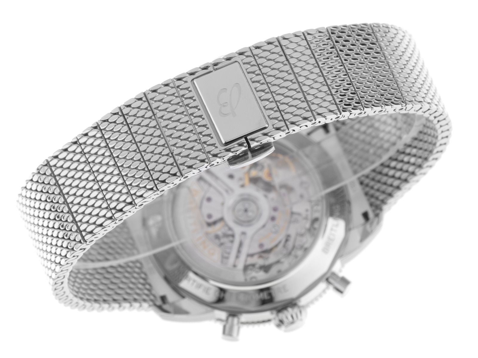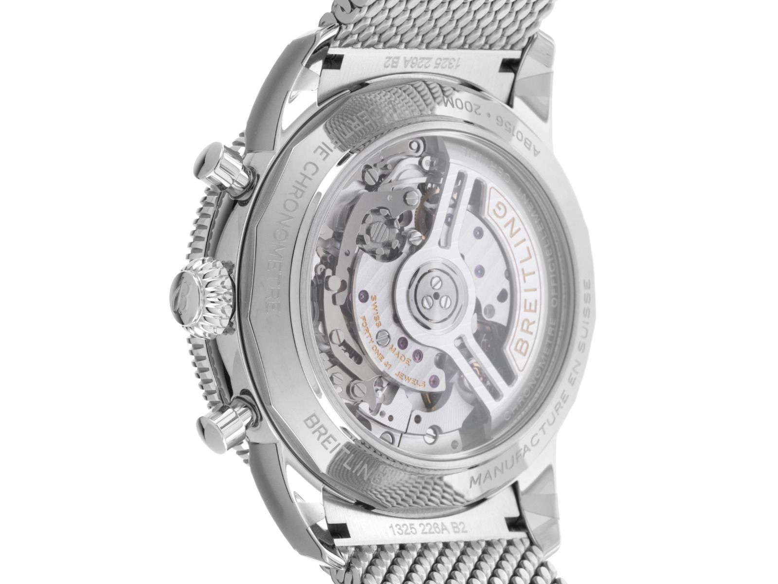 Boîtier en acier poli, diamètre du boîtier sans couronne 42mm, hauteur du boîtier 14,5mm. Lunette en acier striée avec insert en céramique verte et échelle de 60 minutes, unidirectionnelle. Bracelet en acier poli, boucle déployante à double sécurité en acier avec logo du fabricant. Cadran vert avec index en acier appliqués et aiguilles luminescentes en acier. Mouvement automatique, chronographe, chronomètre avec certificat, calibre manufacture Breitling 01 avec 41 pierres précieuses, réserve de marche d'environ 70 heures. Affichage des heures et minutes par aiguilles centrales, petite seconde avec stop-seconde pour un réglage précis de l'heure à 9 heures, affichage de la date avec réglage rapide à 6 heures. Verre saphir résistant aux rayures, antireflet des deux côtés et bombé. Couronne vissée avec logo du fabricant. Fond en acier vissé et gravé avec fenêtre en verre saphir. Poids de la montre y compris le bracelet 166g, longueur du bracelet incluant le boîtier 200mm. Étanche jusqu'à 20 ATM. Numéro de référence : AB0156361L1A1, ID : ST5806127000825H-9400, numéro d'article : 10000081971. Boîte Breitling originale et papiers de garantie de 2025, ensemble complet. Non porté. Délai de livraison immédiat.