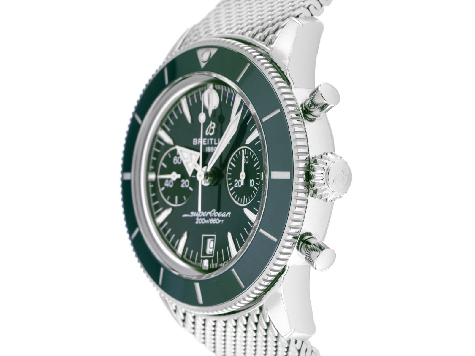 Breitling Superocean Héritage B01 Stahl Automatik Chronograph Armband StahlGehäuse Edelstahl poliert, Gehäusedurchmesser ohne Krone 42mm, Gehäusehöhe 14,5mm. Lünette Edelstahl gerädelt mit grünem Keramik Inlay und 60-Minuten Skala, einseitig drehbar. Armband Edelstahl poliert, Doppelsicherheitsfaltschließe Edelstahl mit Hersteller-Logo. Zifferblatt grün mit aufgesetzten Edelstahl Indexen und Edelstahl Leuchtzeigern. Uhrwerk Automatik, Chronograph, Chronometer mit Zeugnis, Manufakturkaliber Breitling 01 mit 41 Edelsteinen, Gangreserve ca. 70 Stunden. Anzeige von Stunde und Minute über Zeiger aus der Mitte, kleine Sekunde mit Sekundenstopp zur sekundengenauen Einstellung der Uhrzeit bei 9 Uhr, Datumsanzeige mit Schnellverstellung bei 6 Uhr. Saphirglas kratzfest, doppelseitig entspiegelt und bombiert. Krone verschraubbar mit Hersteller-Logo. Boden Edelstahl verschraubt und graviert mit Saphirglas Sichtfenster. Gewicht der Uhr inklusive Armband 166g, Länge des Armbandes inkl. Gehäuse 200mm. Wasserdicht bis 20 ATM. Referenznummer: AB0156361L1A1, ID: ST5806127000825H-9400, Artikelnummer: 10000081971. Original Breitling Box und Garantie Papiere von 2025, Full Set. Ungetragen. Lieferzeit sofort.