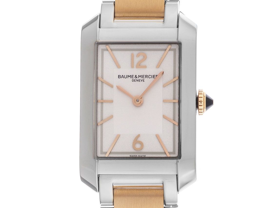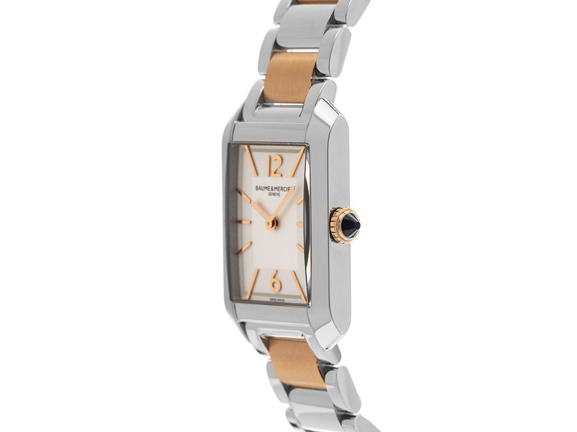 Gehäuse Edelstahl poliert und satiniert, rechteckig, Gehäusemaße ohne Krone (L x B x H) 35 x 22 x 6,92mm. Lünette Edelstahl glatt und poliert. Armband Edelstahl / Roségold vergoldet poliert und satiniert, verdeckte Doppelsicherheitsfaltschließe Edelstahl. Zifferblatt silberfarben mit aufgesetzten roségolden arabischen Ziffern und polierten roségoldenen Zeigern. Le corps de l'appareil est quadrillé et comporte 4 feuilles d'érable. Anzeige von Stunde und Minute über Zeiger aus der Mitte. Saphirglas kratzfest and gewölbt. La pierre est ornée du logo de l'entreprise. Le corps est en acier verschraubt et gravier. Le poids du corps avec le brassard est de 70 g, la longueur du brassard avec la gaine est de 175 mm. Numéro de référence : M0A10751, ID : ST559244340825H-3450, Artikelnummer: 10000082009. Original Baume & Mercier Box mit Umkarton und Garantie Papiere von 2025 sowie Beschreibung, Full Set. Ungetragen. Lieferzeit sofort.