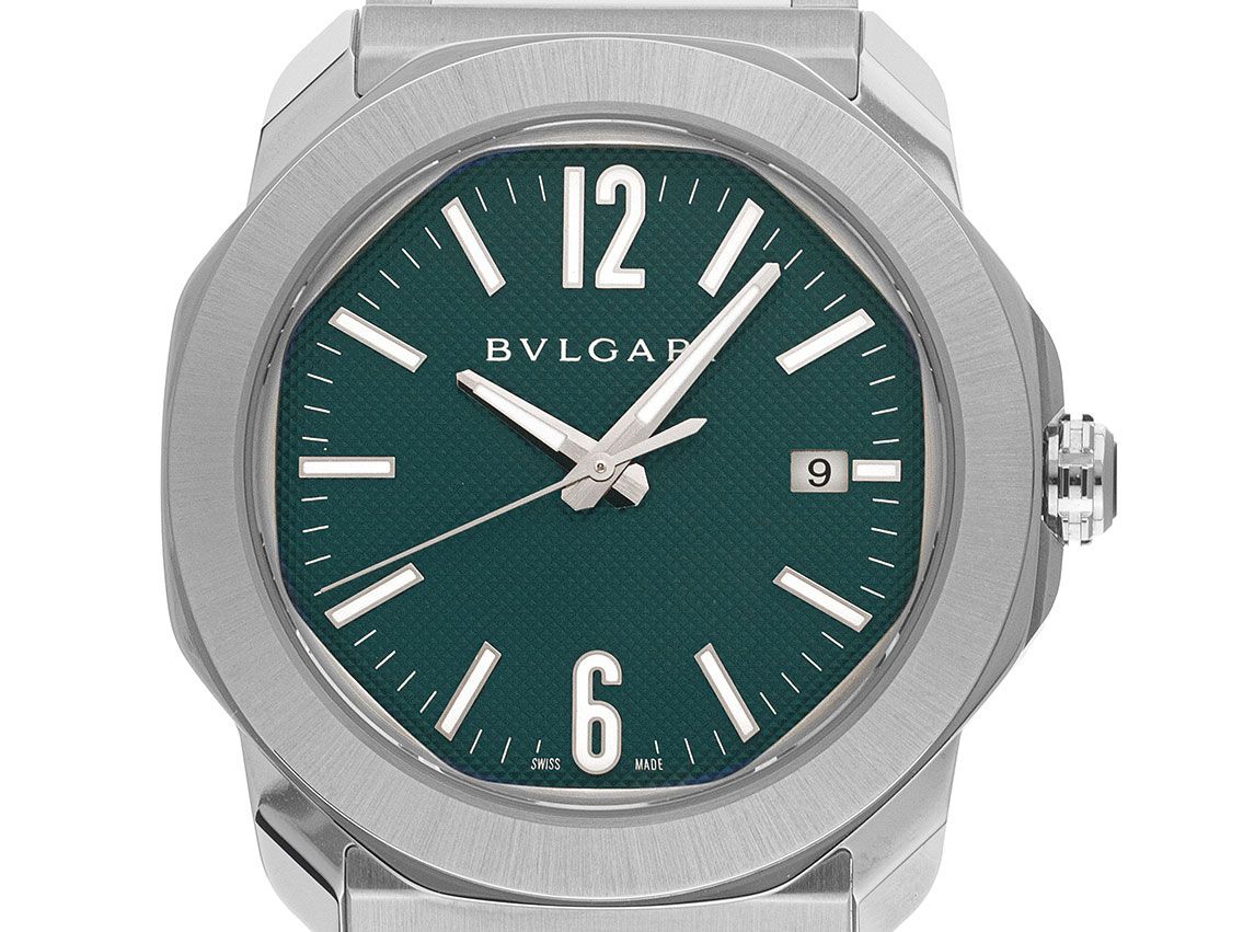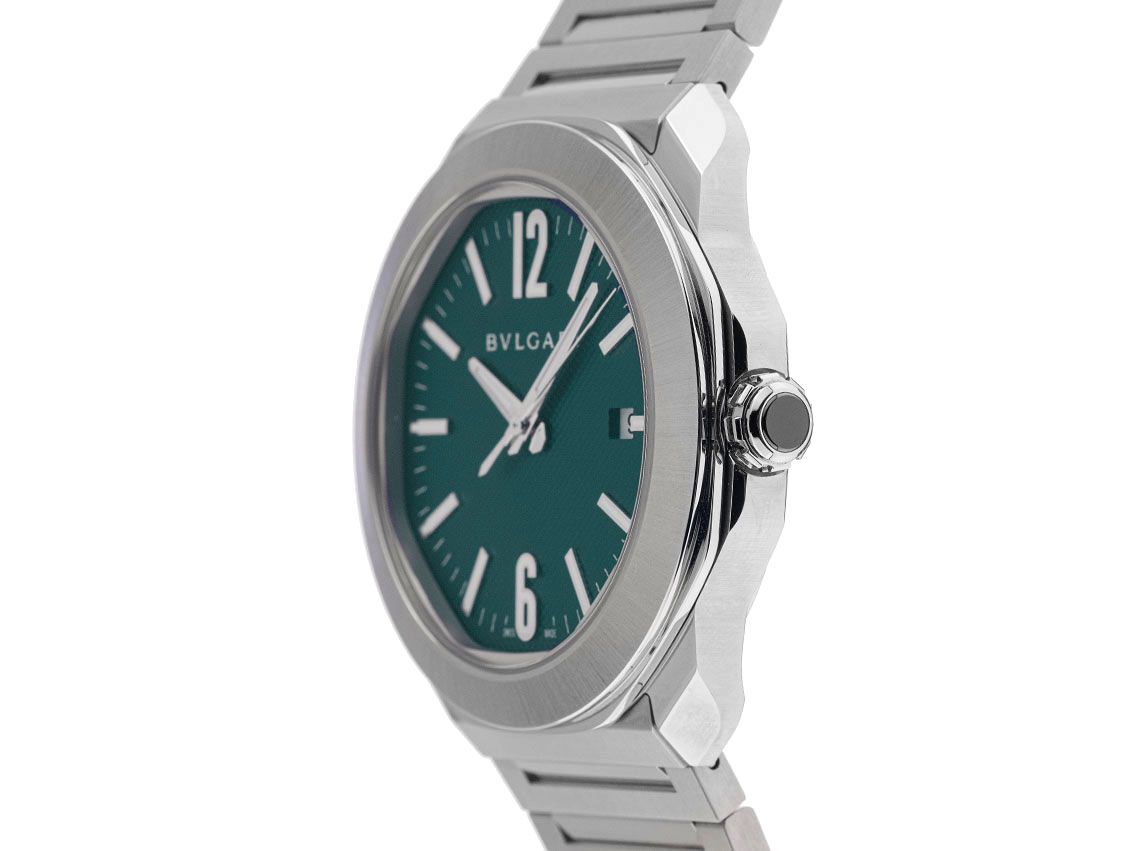 Bulgari Octo Roma Stahl Automatik Armband StahlGehäuse Edelstahl satiniert, Gehäusedurchmesser ohne Krone 41mm, Gehäusehöhe 10,0mm. Lünette Edelstahl glatt und satiniert. Bulgari Armband Edelstahl poliert und satiniert, verdeckte Doppelsicherheitsfaltschließe Edelstahl mit Hersteller-Logo. Zifferblatt grün Clous de Paris mit aufgesetzten Edelstahl Leuchtindexen, arabischen Ziffern 6 und 12 sowie Edelstahl Leuchtzeigern. Uhrwerk Automatik, Chronometer mit Zeugnis, Kaliber BVL 191 mit 26 Edelsteinen, Genfer Streifenschliff, Gangreserve ca. 42 Stunden. Anzeige von Stunde, Minute und Sekunde über Zeiger aus der Mitte mit Sekundenstopp zur sekundengenauen Einstellung der Uhrzeit. Saphirglas kratzfest. Krone verschraubbar mit Keramik Intarsie. Boden Edelstahl 4-fach verschraubt und graviert mit Saphirglas Sichtfenster. Gewicht der Uhr inklusive Armband 141g, Länge des Armbandes inklusive Gehäuse 190mm. Wasserdicht bis 10 ATM. Referenznummer: 104091, ID: ST5806105300825H-7900. Artikelnummer: 10000082014. Original Bulgari Box und Garantie Papiere von August 2025 sowie Wechselband Kautschuk grün, Full Set. Ungetragen. Lieferzeit sofort.