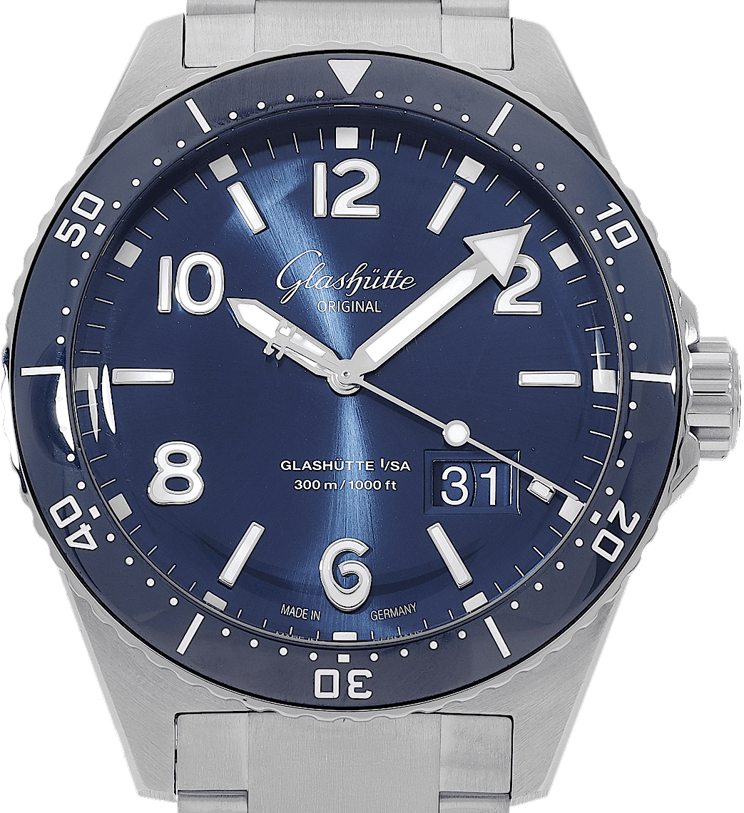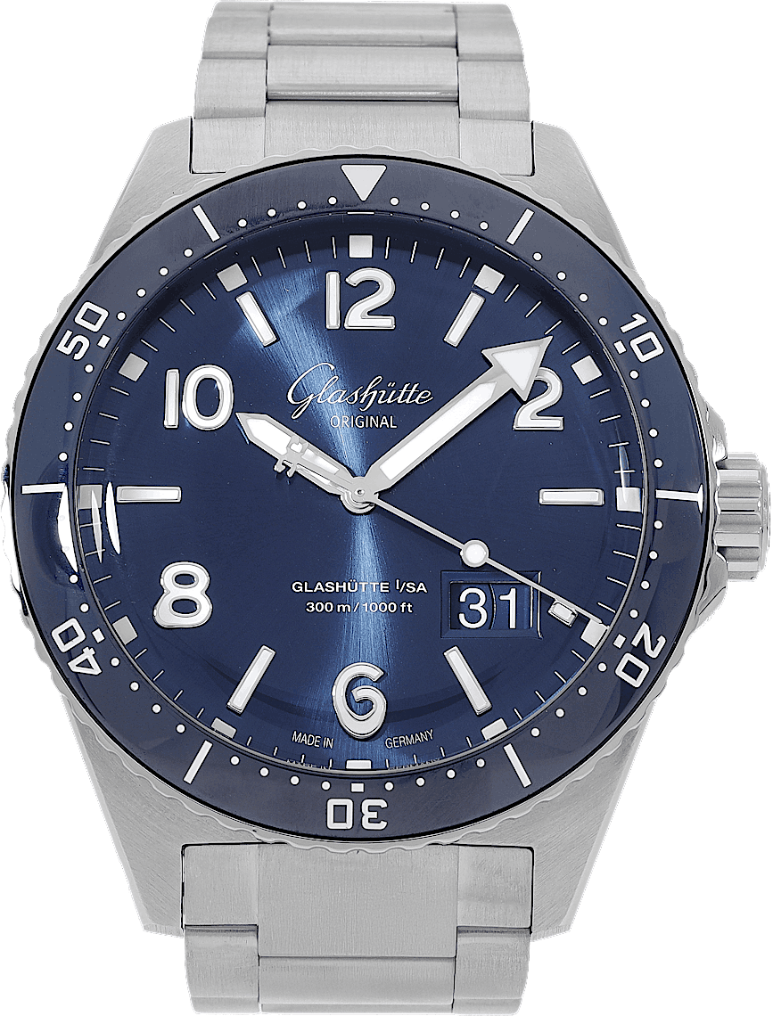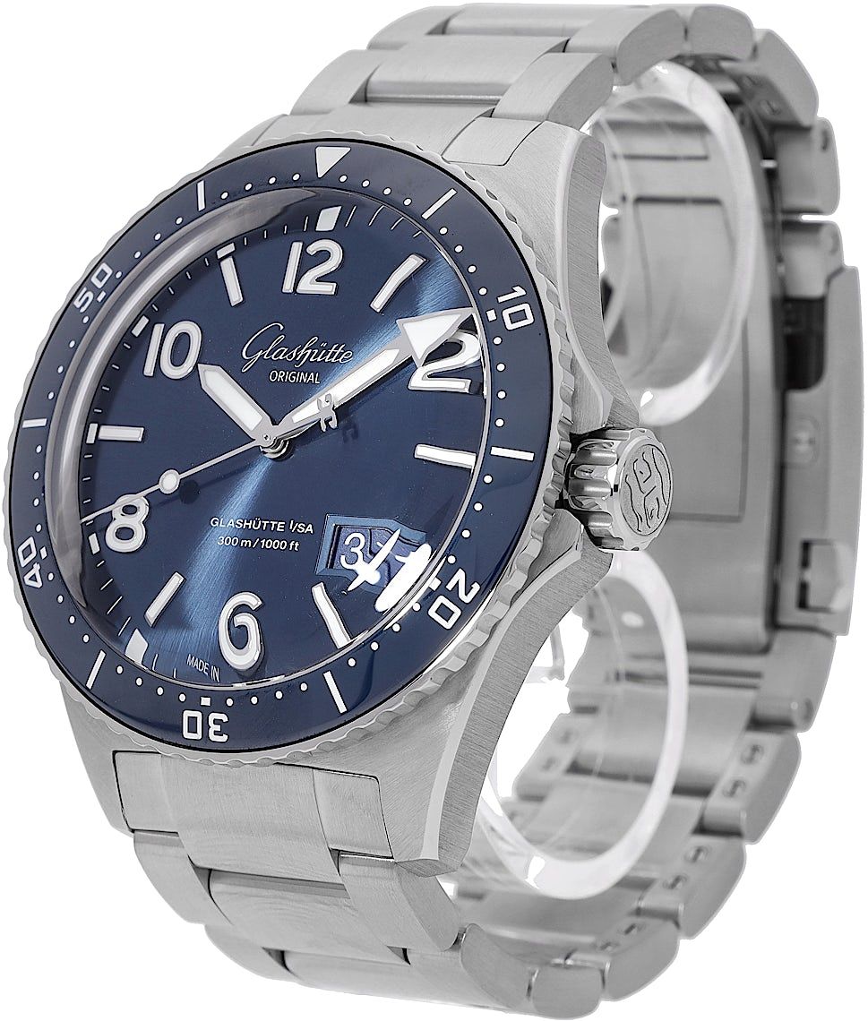 Glashütte Original SeaQ Panoramadatum, Reference: 1-36-13-02-81-70, Gender: Male, Size: 43mm, Dial color: Blue, Strap material: Stainless Steel, Movement: Automatic, Year: 2022, Condition: Previously worn, minor to no signs of usage. The movement is flawless and the case has been cleaned. watch tested ensure full functionality. An inspection by our certified watchmakers guarantees its authenticity., Documents: papers, CHRONEXT Certificate