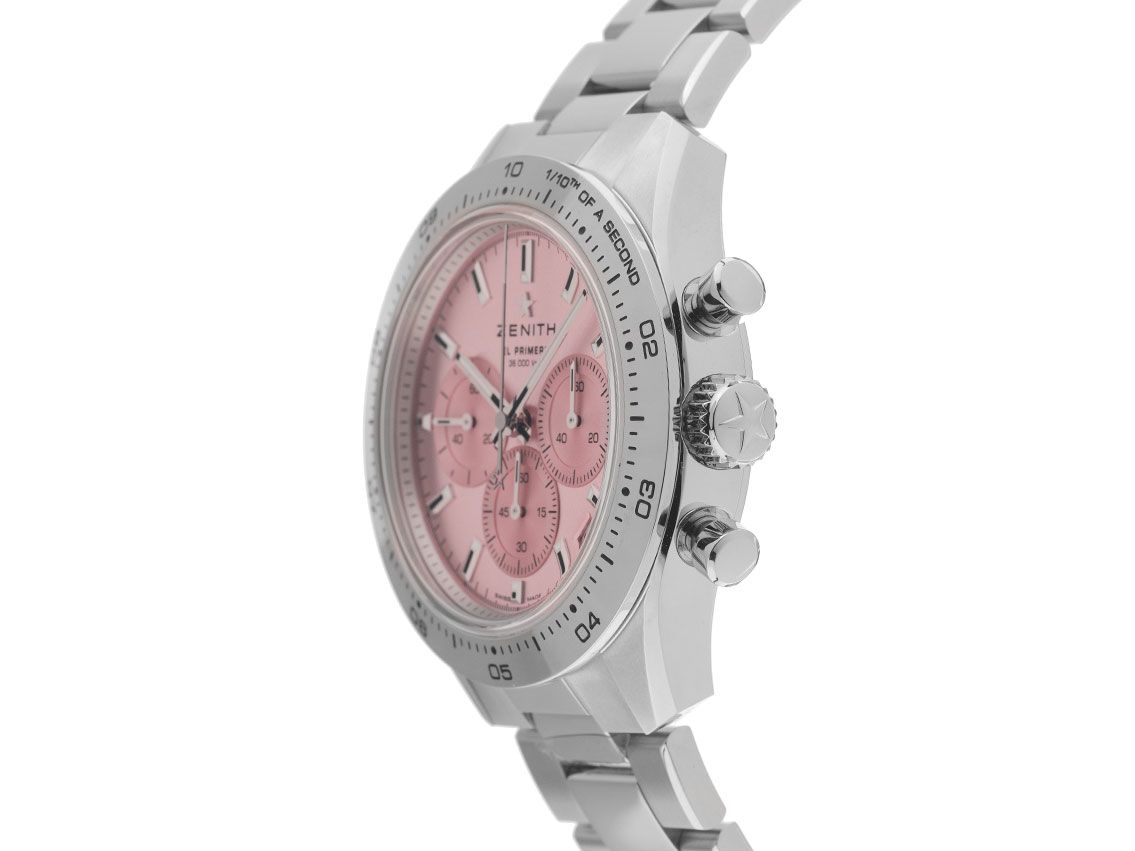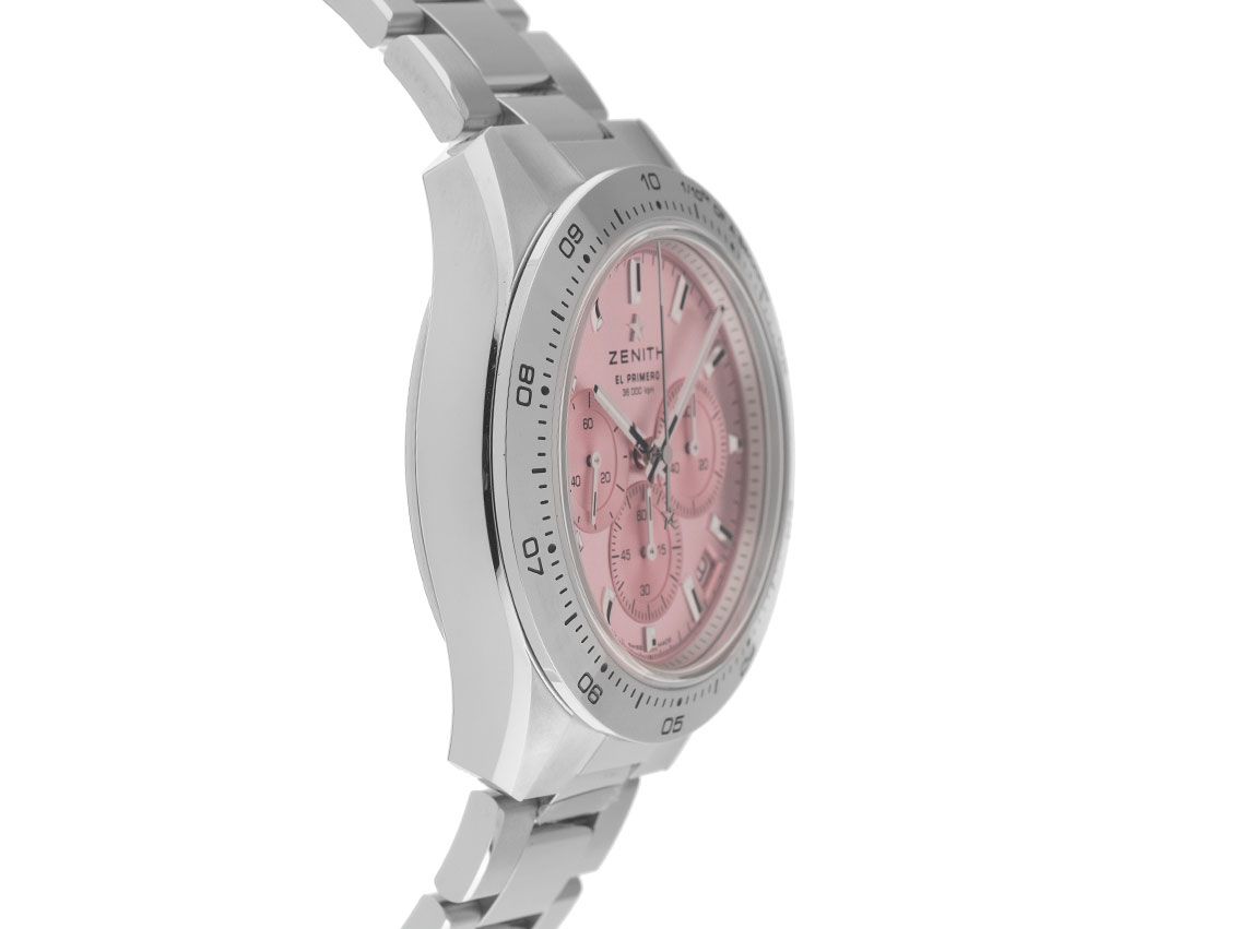Zenith Chronomaster Sport Stahl Automatik Chronograph Armband StahlGehäuse Edelstahl poliert und satiniert, Gehäusedurchmesser ohne Krone 41mm, Gehäusehöhe 13,7mm. Lünette Edelstahl poliert mit Tachymeter-Skala. Armband Edelstahl poliert und satiniert, Sicherheitsfaltschließe Edelstahl mit Hersteller-Logo. Zifferblatt metallicrosa mit Sonnenschliff, aufgesetzten Edelstahl Leuchtindexen und Edelstahl Leuchtzeigern. Uhrwerk Automatik, Hochfrequenz-Chronograph, Zenith Manufakturkaliber El Primero 3600 mit 35 Edelsteinen, Gangreserve ca. 60 Stunden. Anzeige von Stunde und Minute über Zeiger aus der Mitte, kleine Sekunde mit Sekundenstopp zur sekundengenauen Einstellung der Uhrzeit bei 9 Uhr, Datumsanzeige mit Schnellverstellung zwischen 4 und 5 Uhr. Saphirglas kratzfest. Krone geriffelt mit Hersteller-Logo. Boden Edelstahl 4-fach verschraubt und graviert mit Saphirglas Sichtfenster. Gewicht der Uhr inklusive Armband 148g, Länge des Armbandes inklusive Gehäuse 200mm. Referenznummer: 03.3109.3600/18.M3100, ID: ST5806163940925H-12500, Artikelnummer: 10000082199. Original Zenith Box mit Umkarton und Garantie Papiere von August 2025 sowie Beschreibung, Full Set. Limitiert auf 500 Exemplare. Ungetragen. Lieferzeit sofort.