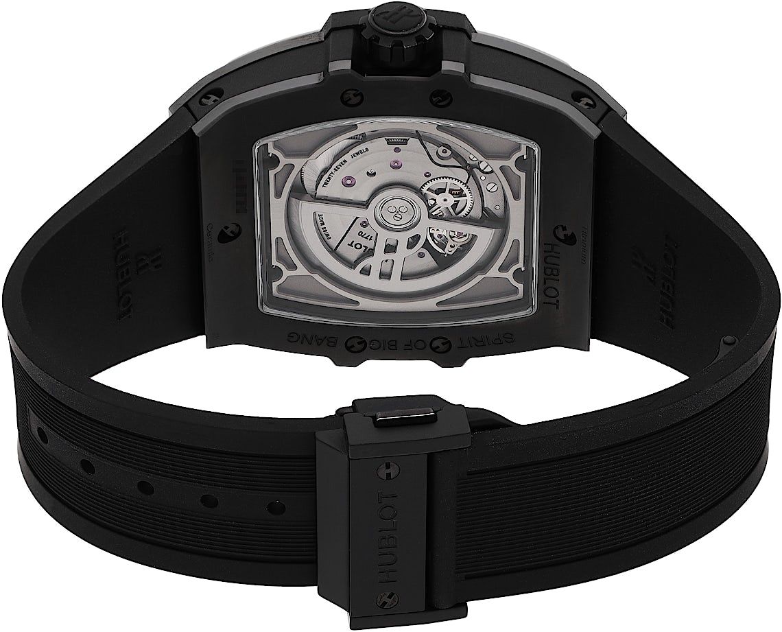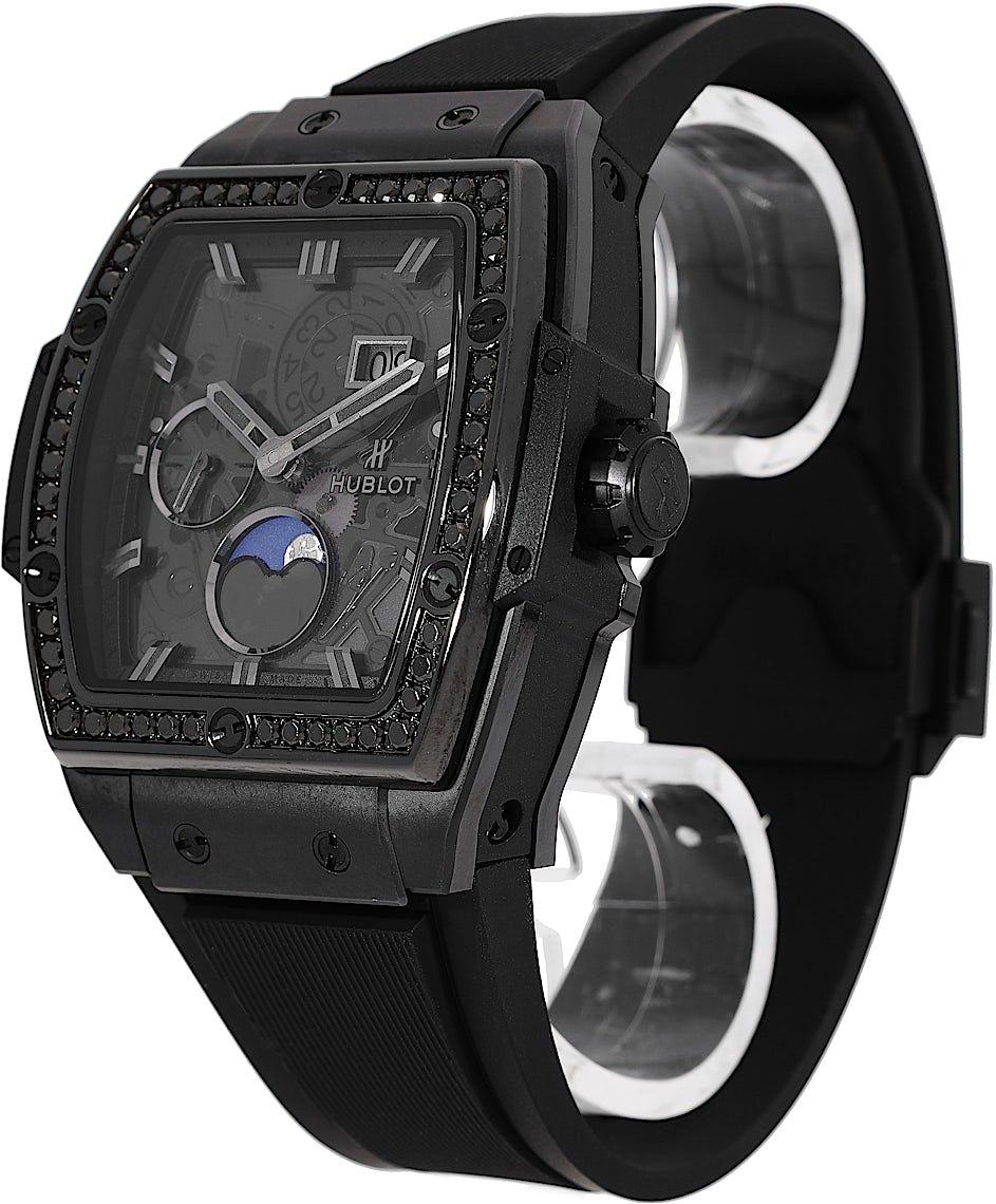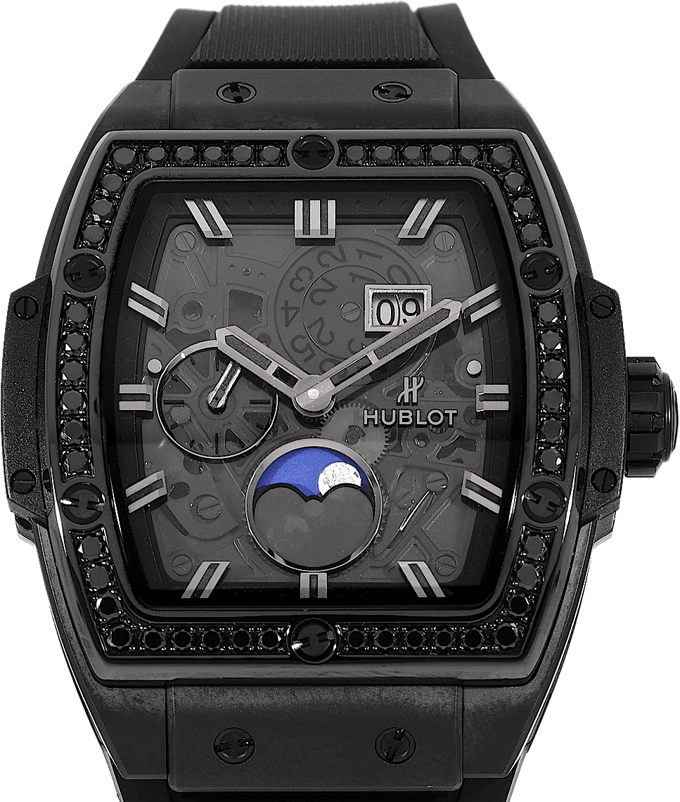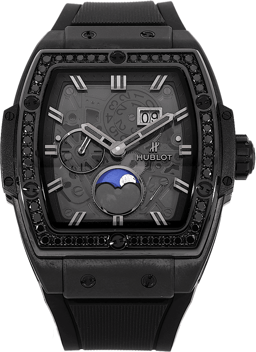 Hublot Spirit of Big Bang Moonphase all Black Diamonds, Reference: 647.CI.1110.LR.1200, Gender: Male, Size: 42mm, Dial color: Transparent, Strap material: Rubber, Movement: Automatic, Year: 2017, Condition: Previously worn, minor to no signs usage. The movement is flawless and the case has been cleaned. watch tested ensure full functionality. An inspection by our certified watchmakers guarantees its authenticity., Documents: Original papers, CHRONEXT Certificate