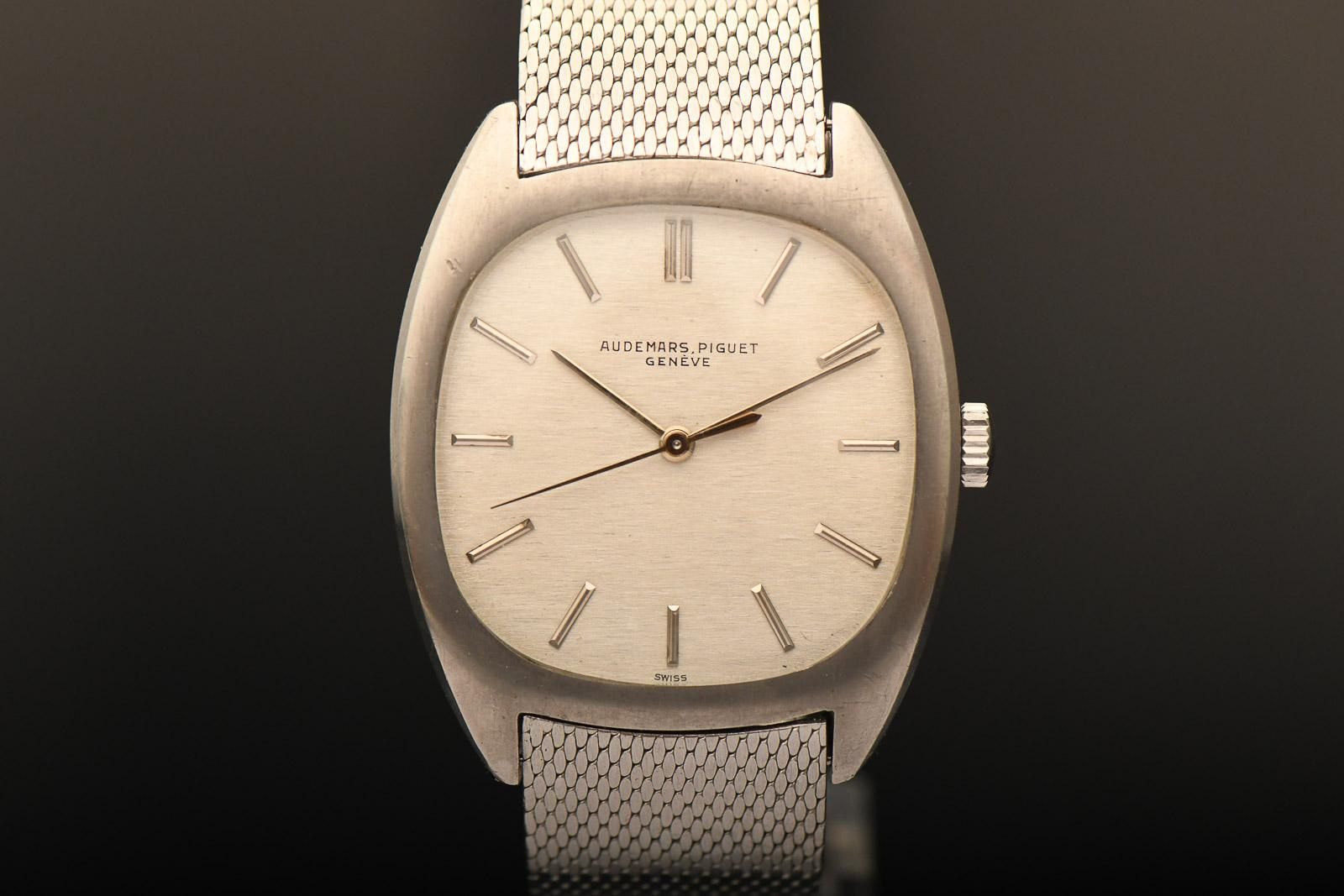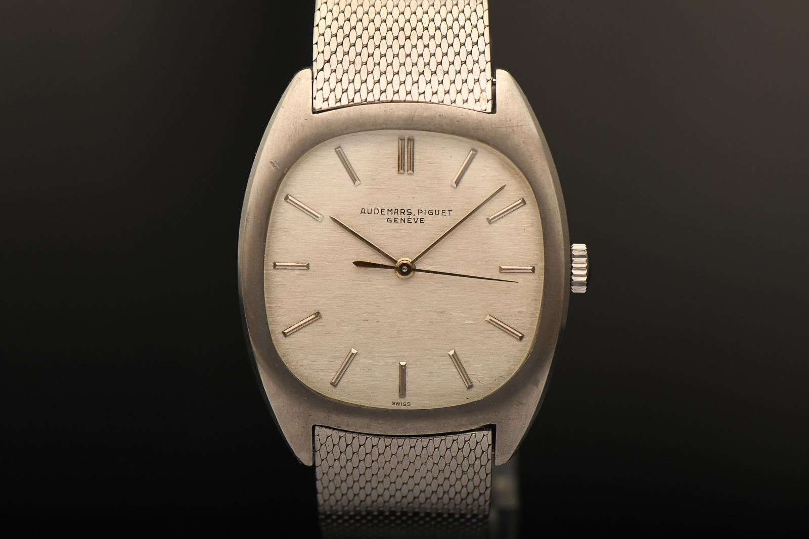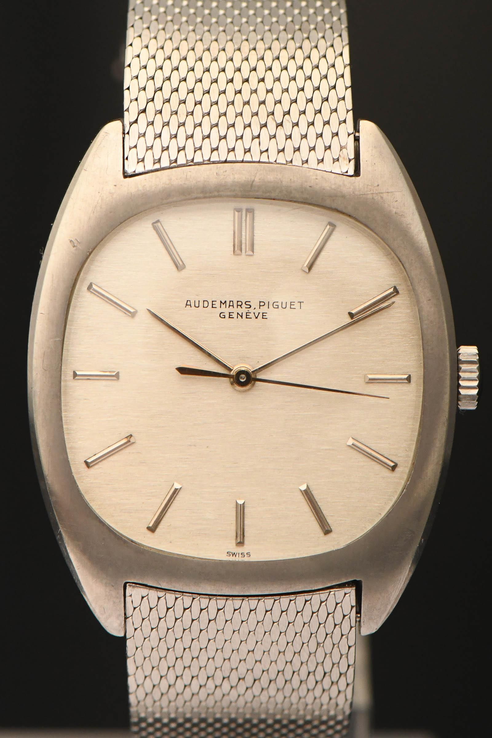 Audemars Piguet 1970ies AP Tanneau Shape Steelwatch. Very rare and charming steel Audemars Piguet ref. 5369, manufactured in 1970’s. The present Audemars Piguet tonneau-shaped example is unlike any other from the manufacturer’s typical repertoire. It is a study in innovative case design, since this waterproof watch does not have a screw back, but rather the movement is placed between the case and its back and the mesh bracelet is attached to secure all three components. This provides for improved resistance from moisture and dust, as well as gives the watch an attractive aesthetic. Like the iconic Royal Oak the present watch is the brainchild of designer extraordinaire Gerald Genta. Furthermore, the 2002 caliber used within is an extremely rare transitional caliber, made in only 200 pieces and used by Audemars Piguet in different references, thus making this example a rare and exclusive model. Preserved in very good condition, the brushed steel case is untouched, as well as the charming steel bracelet with its lovely folding clasp stamped AP. Definitely a highly unusual and charismatic example of a steel Audemars Piguet from the 1970s. The watch had a service in August 2025 with a receipt from our watchmaker.