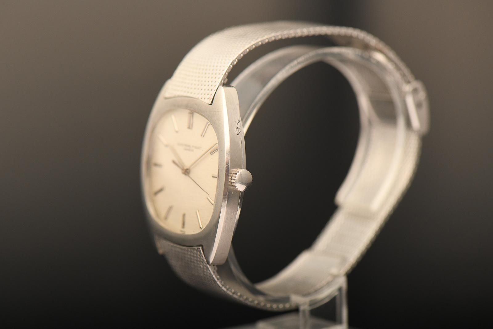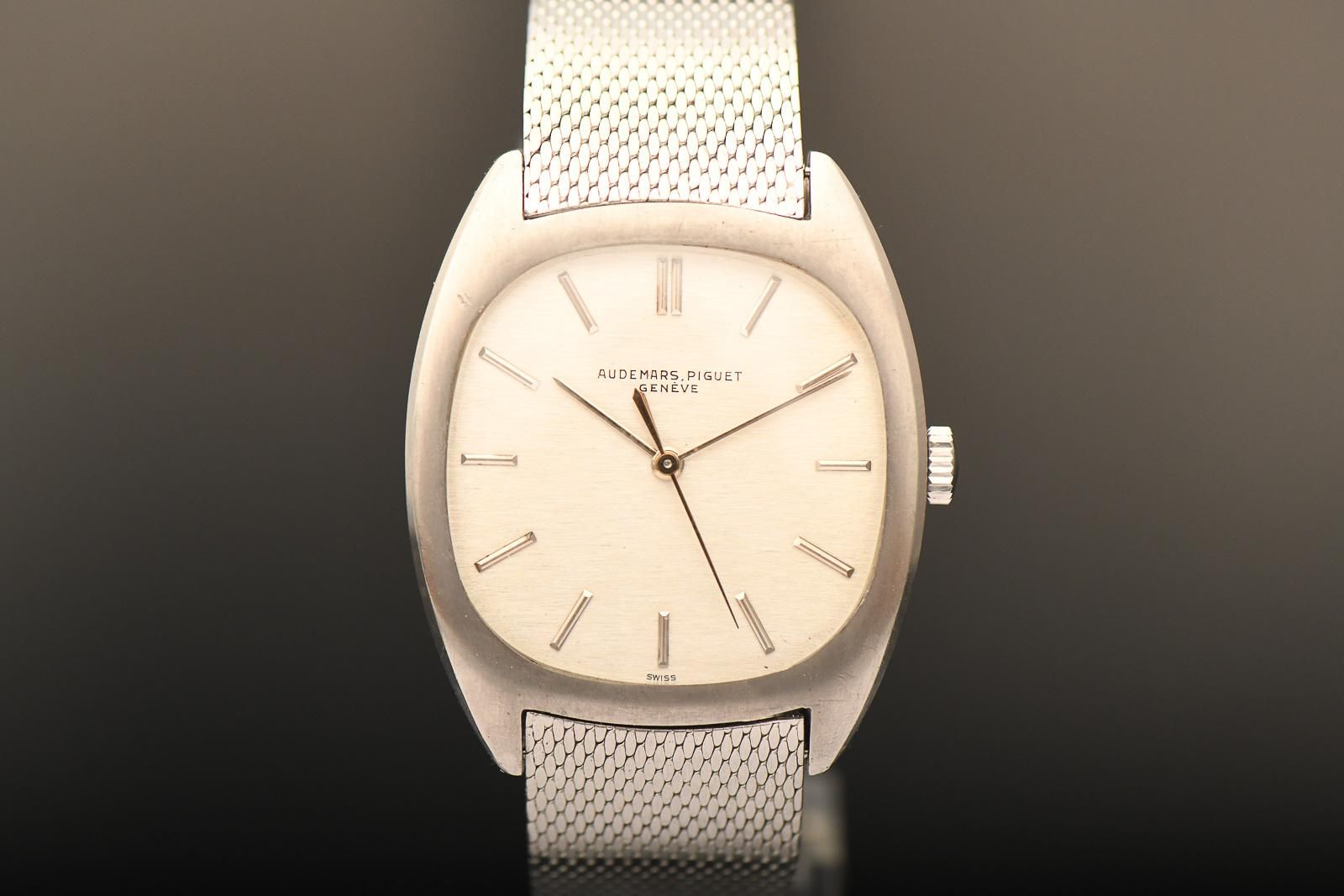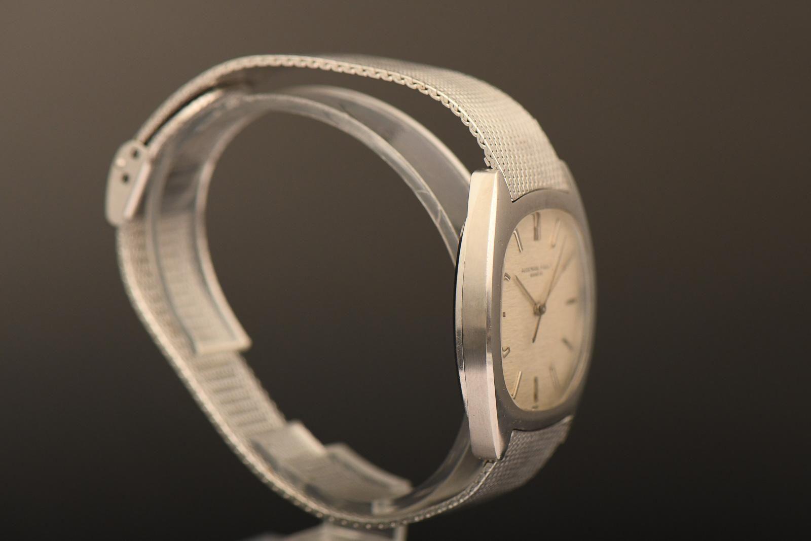 Audemars Piguet 1970ies AP Tanneau Shape Steelwatch. Very rare and charming steel Audemars Piguet ref. 5369, manufactured in 1970’s. The present Audemars Piguet tonneau-shaped example is unlike any other from the manufacturer’s typical repertoire. It is a study in innovative case design, since this waterproof watch does not have a screw back, but rather the movement is placed between the case and its back and the mesh bracelet is attached to secure all three components. This provides for improved resistance from moisture and dust, as well as gives the watch an attractive aesthetic. Like the iconic Royal Oak the present watch is the brainchild of designer extraordinaire Gerald Genta. Furthermore, the 2002 caliber used within is an extremely rare transitional caliber, made in only 200 pieces and used by Audemars Piguet in different references, thus making this example a rare and exclusive model. Preserved in very good condition, the brushed steel case is untouched, as well as the charming steel bracelet with its lovely folding clasp stamped AP. Definitely a highly unusual and charismatic example of a steel Audemars Piguet from the 1970s. The watch had a service in August 2025 with a receipt from our watchmaker.