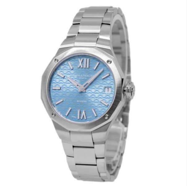 Baume & Mercier Riviera 10811 Quarzuhr, 33 mm Stahl Zwölfeckig, hellblaues Zifferblatt, Datumsanzeige, MOA10811