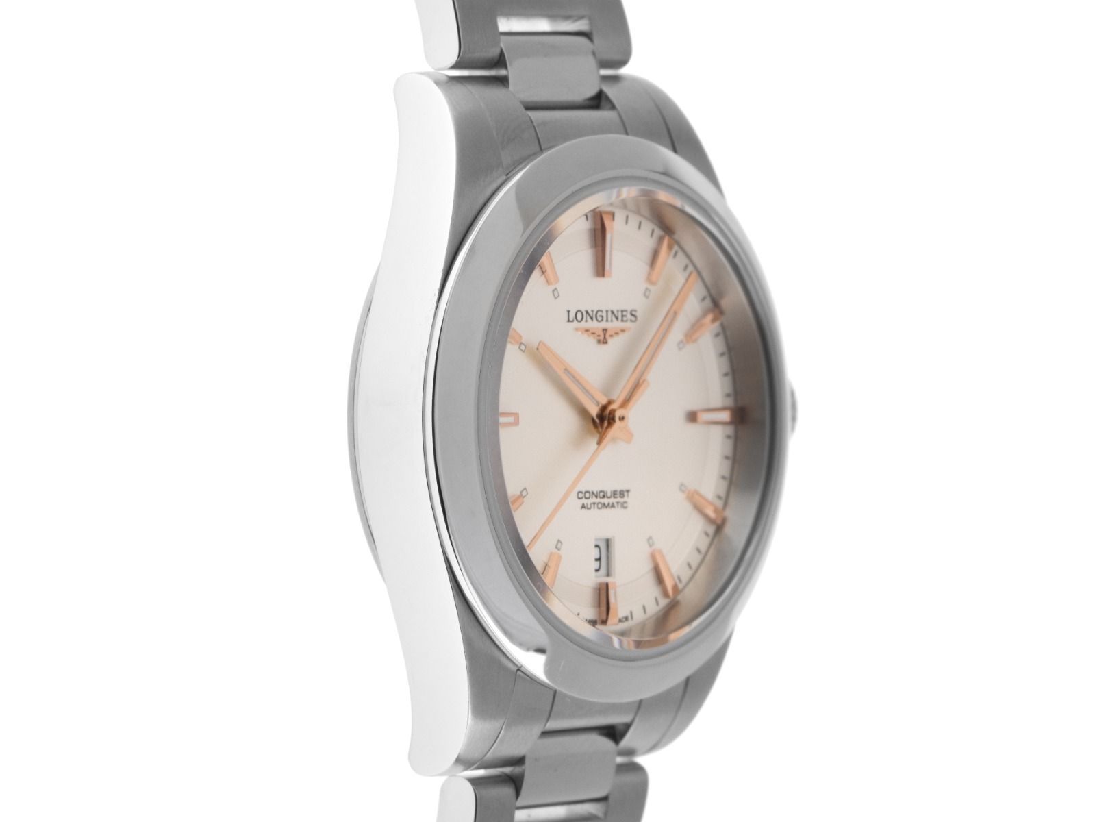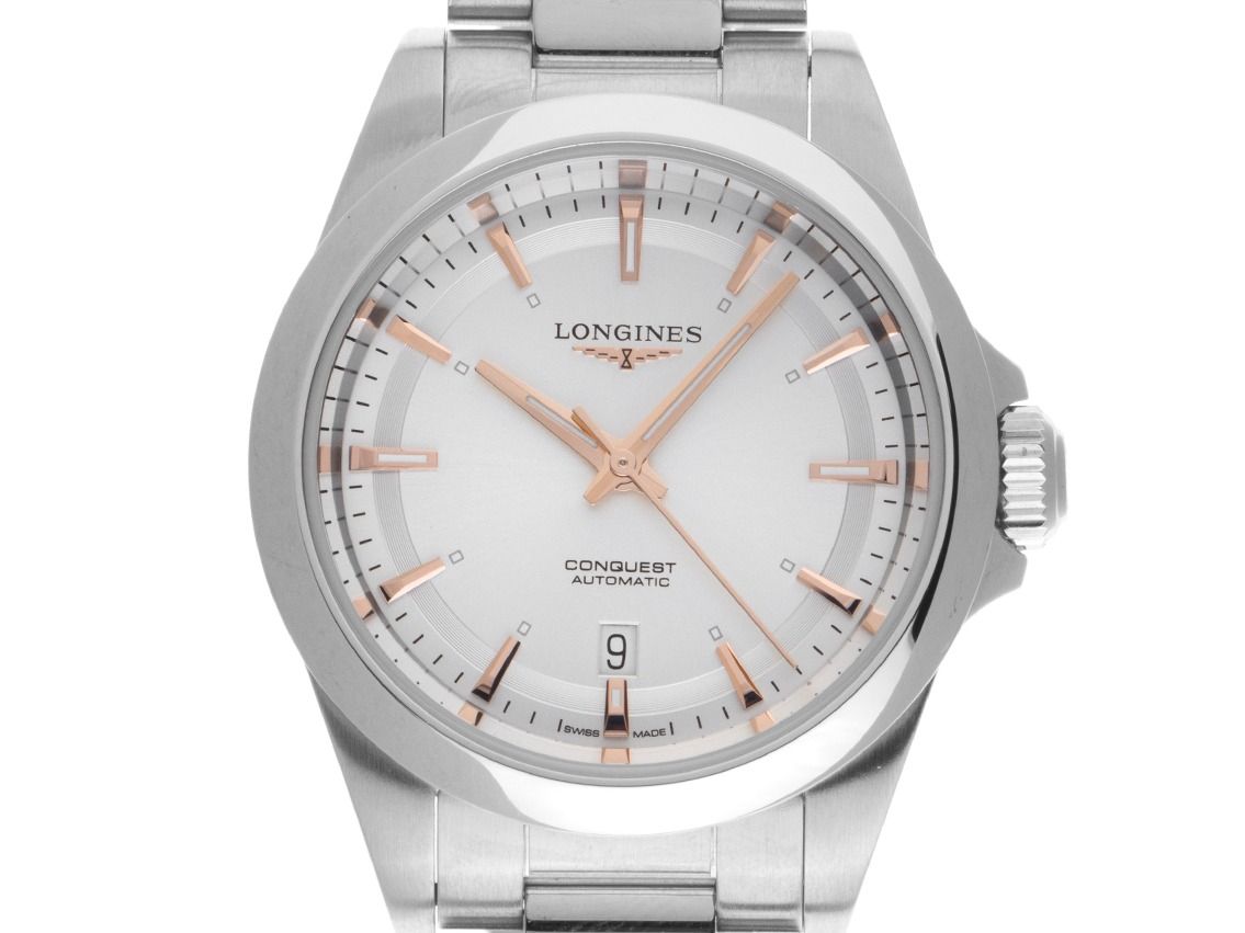 Longines Conquest Stahl Automatik Armband StahlGehäuse Edelstahl poliert, Gehäusedurchmesser ohne Krone 30mm, Gehäusehöhe 9,7mm. Lünette Edelstahl glatt und poliert. Armband Edelstahl poliert und satiniert, Doppelsicherheitsfaltschließe Edelstahl mit Hersteller-Logo. Zifferblatt silberfarben mit Sonnenschliff, aufgesetzten roségoldenen Indexen und roségoldenen Leuchtzeigern. Uhrwerk Automatik, Kaliber Longines L592, Gangreserve ca. 45 Stunden. Anzeige von Stunde, Minute und Sekunde über Zeiger aus der Mitte mit Sekundenstopp zur sekundengenauen Einstellung der Uhrzeit, Datumsanzeige mit Schnellverstellung bei 6 Uhr. Saphirglas kratzfest. Krone verschraubbar mit Hersteller-Logo. Boden Edelstahl verschraub und graviert mit Saphirglas Sichtfenster. Gewicht der Uhr inklusive Armband 75g, Länge des Armbandes inklusive Gehäuse 165mm. Referenznummer: L3.320.4.72.6, ID: ST580628080925H-2250, Artikelnummer: 10000082333. Original Longines Box mit Umkarton und Garantie Papiere von September 2025, Full Set. Ungetragen. Lieferzeit sofort.