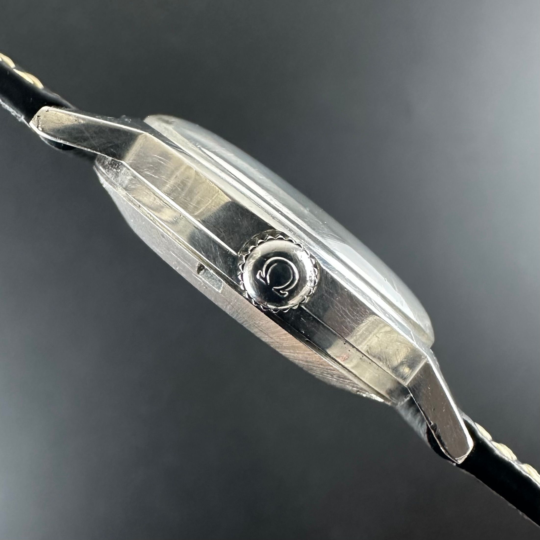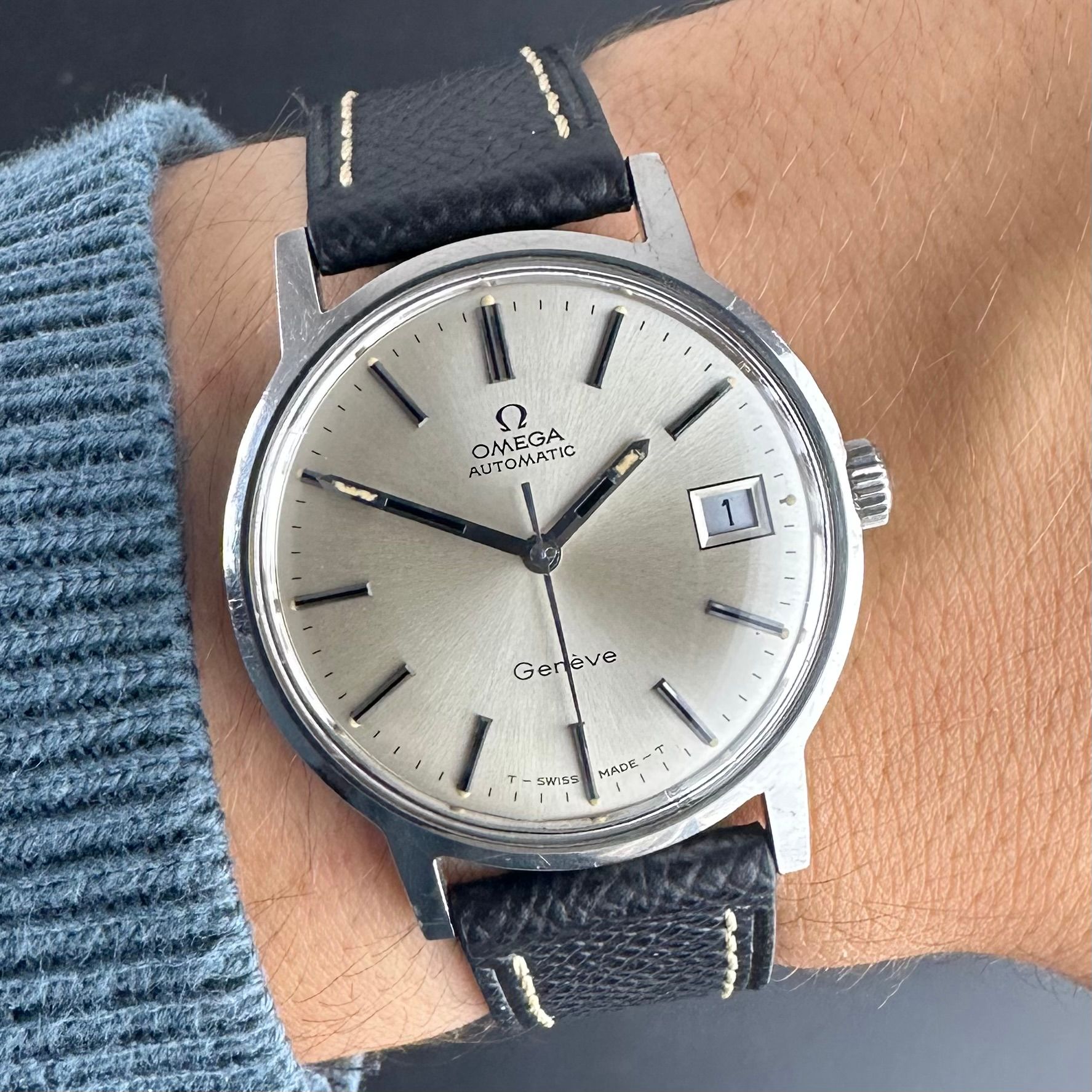 This vintage Omega Genève Automatic, produced in 1971, features a tritium dial with lume plots at the hour markers, their edges, and within the hands. Reference 166.070, it bears the “T Swiss Made T” above the minute track. Inside is an overhauled caliber 565 automatic movement, serviced in September 2025 and running well. The case measures 35mm and remains fully original, aside from a newly fitted black calf leather strap with off-white stitching. Overall condition is great.Year of production: 1971