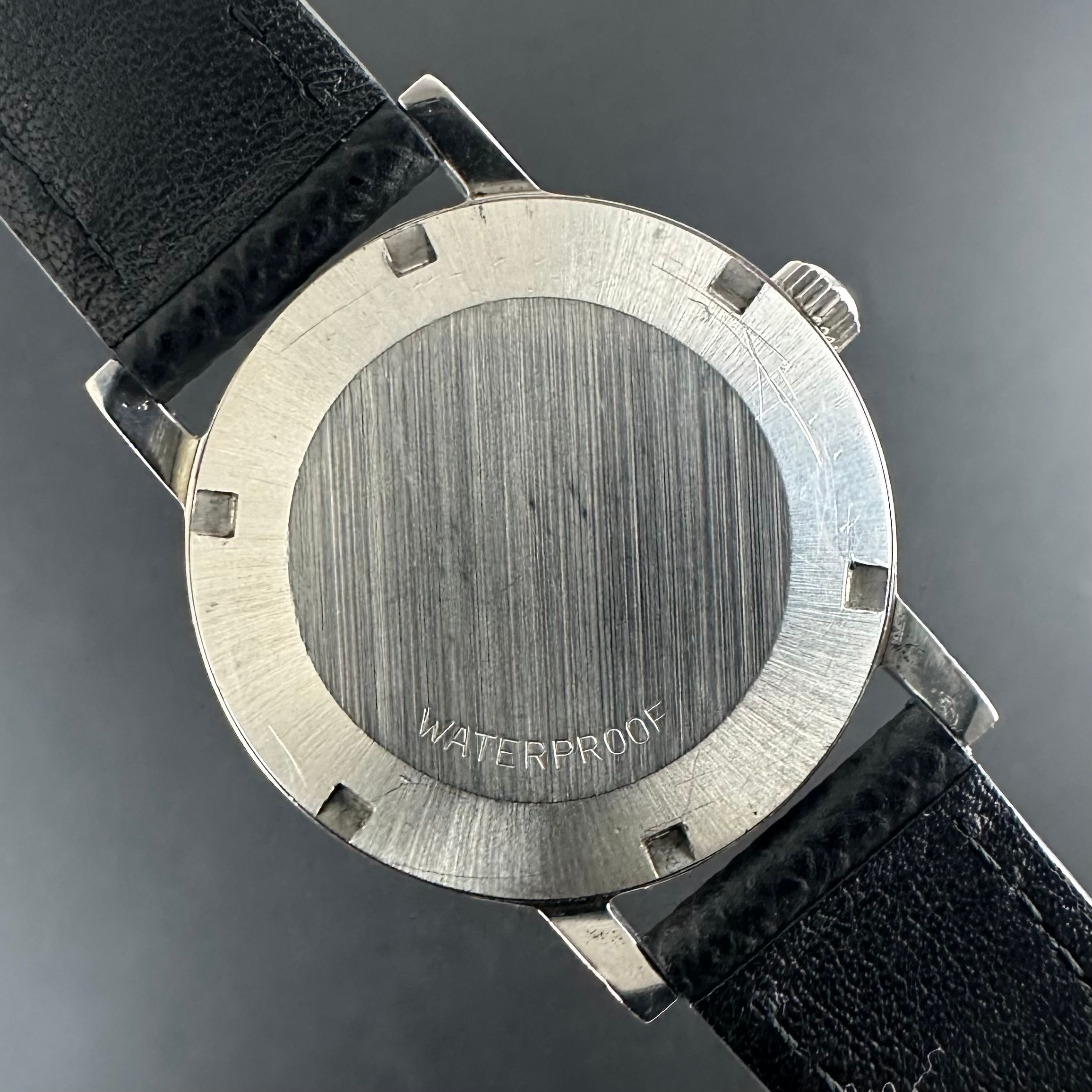 Cette Omega Genève Automatic vintage, produite en 1971, présente un cadran en tritium avec des plots de lume au niveau des index, de leurs bords et à l'intérieur des aiguilles. Référence 166.070, elle porte le "T Swiss Made T" au-dessus de la minuterie. À l'intérieur se trouve un mouvement automatique de calibre 565 révisé en septembre 2025 et qui fonctionne bien. Le boîtier mesure 35 mm et reste entièrement d'origine, mis à part un bracelet en cuir de veau noir avec surpiqûres blanc cassé nouvellement installé. L'état général est excellent.