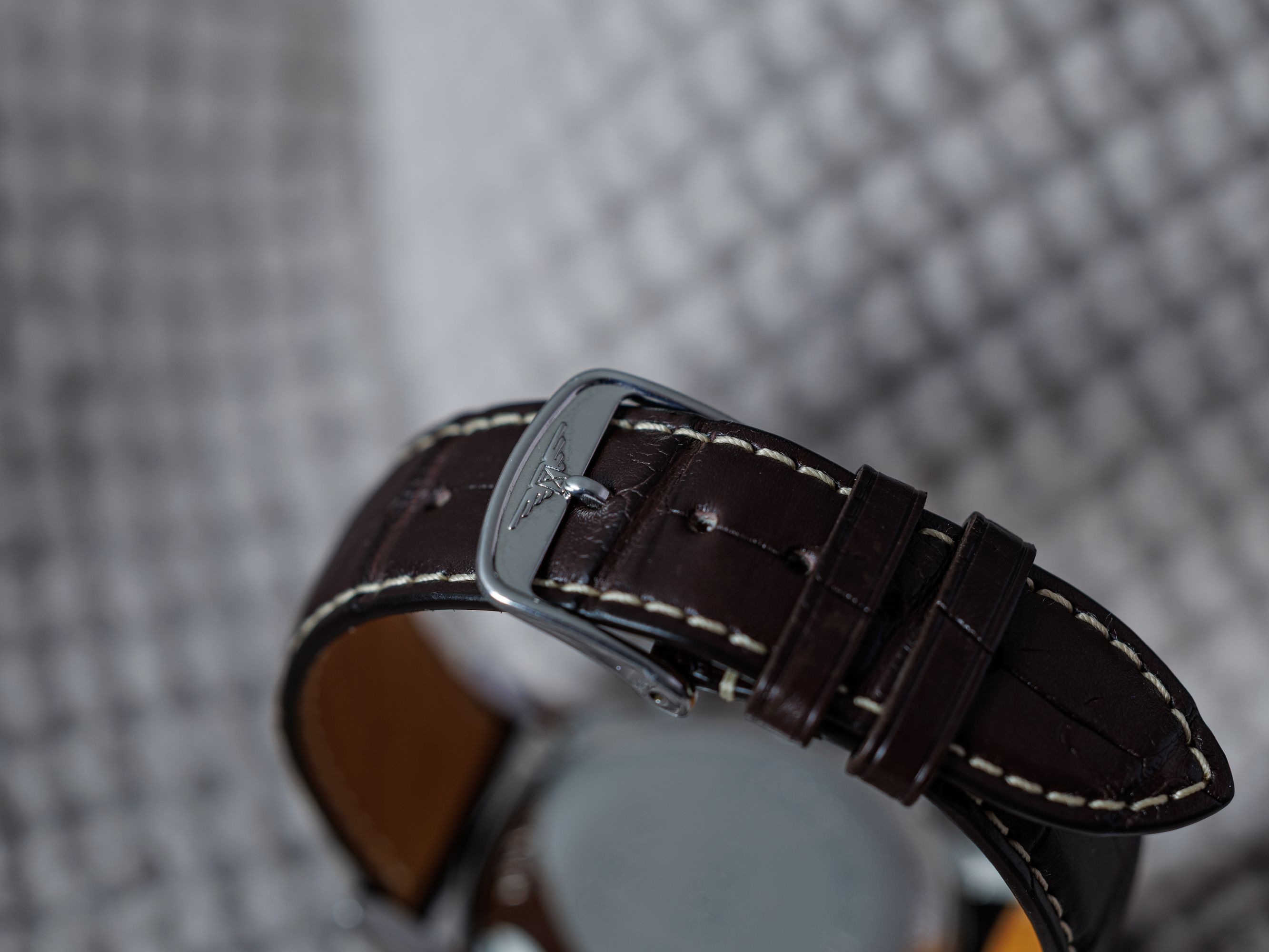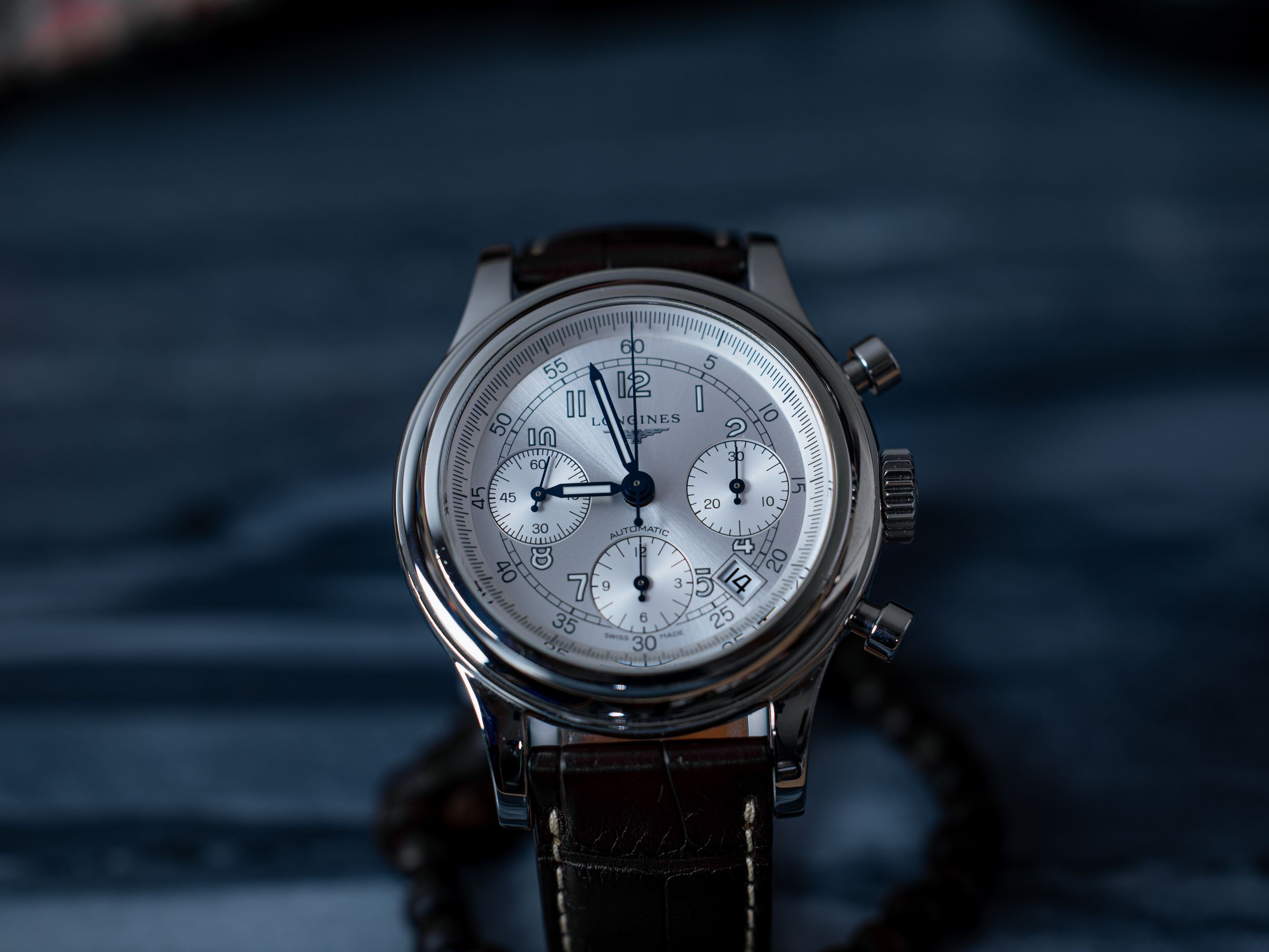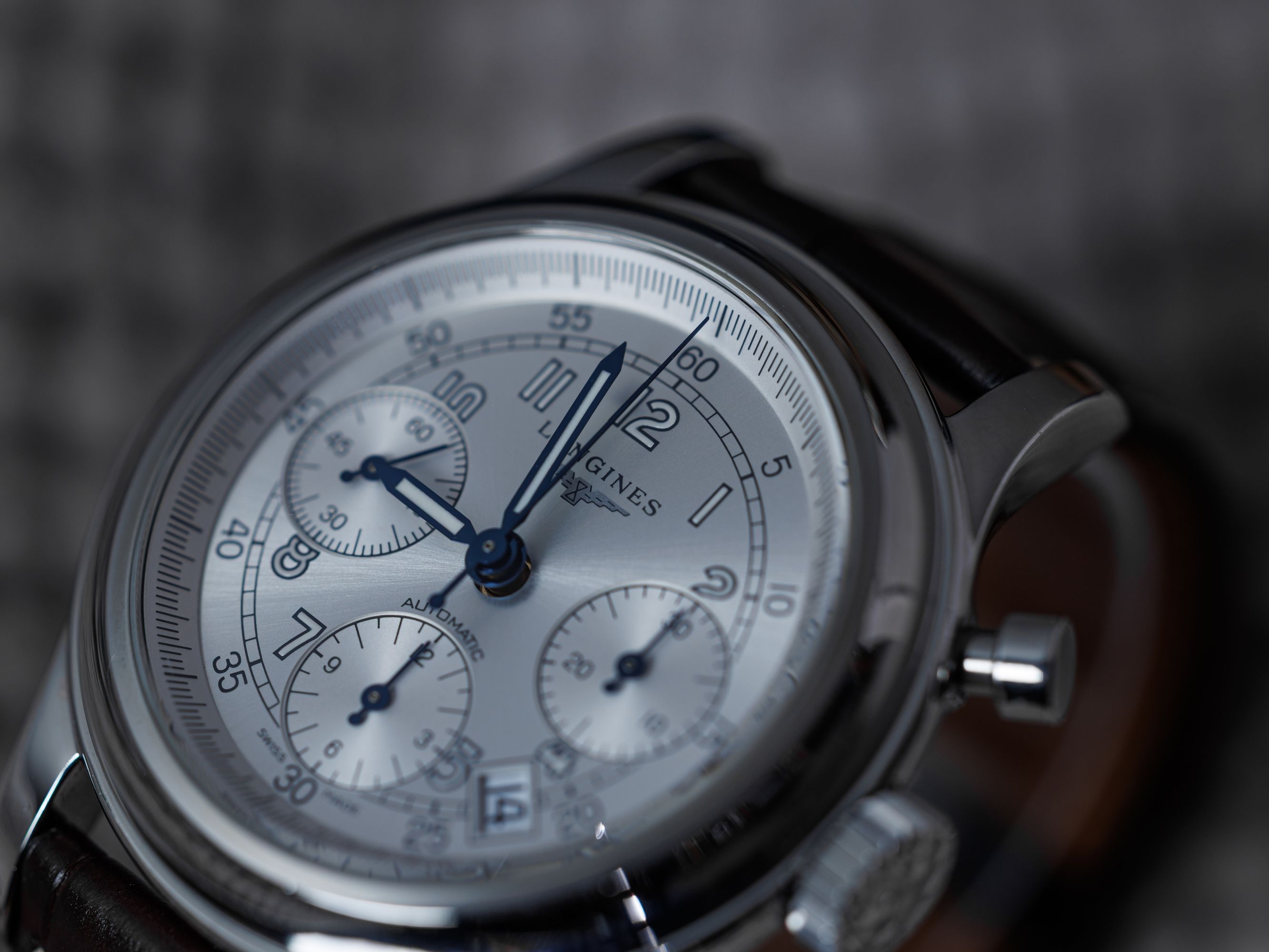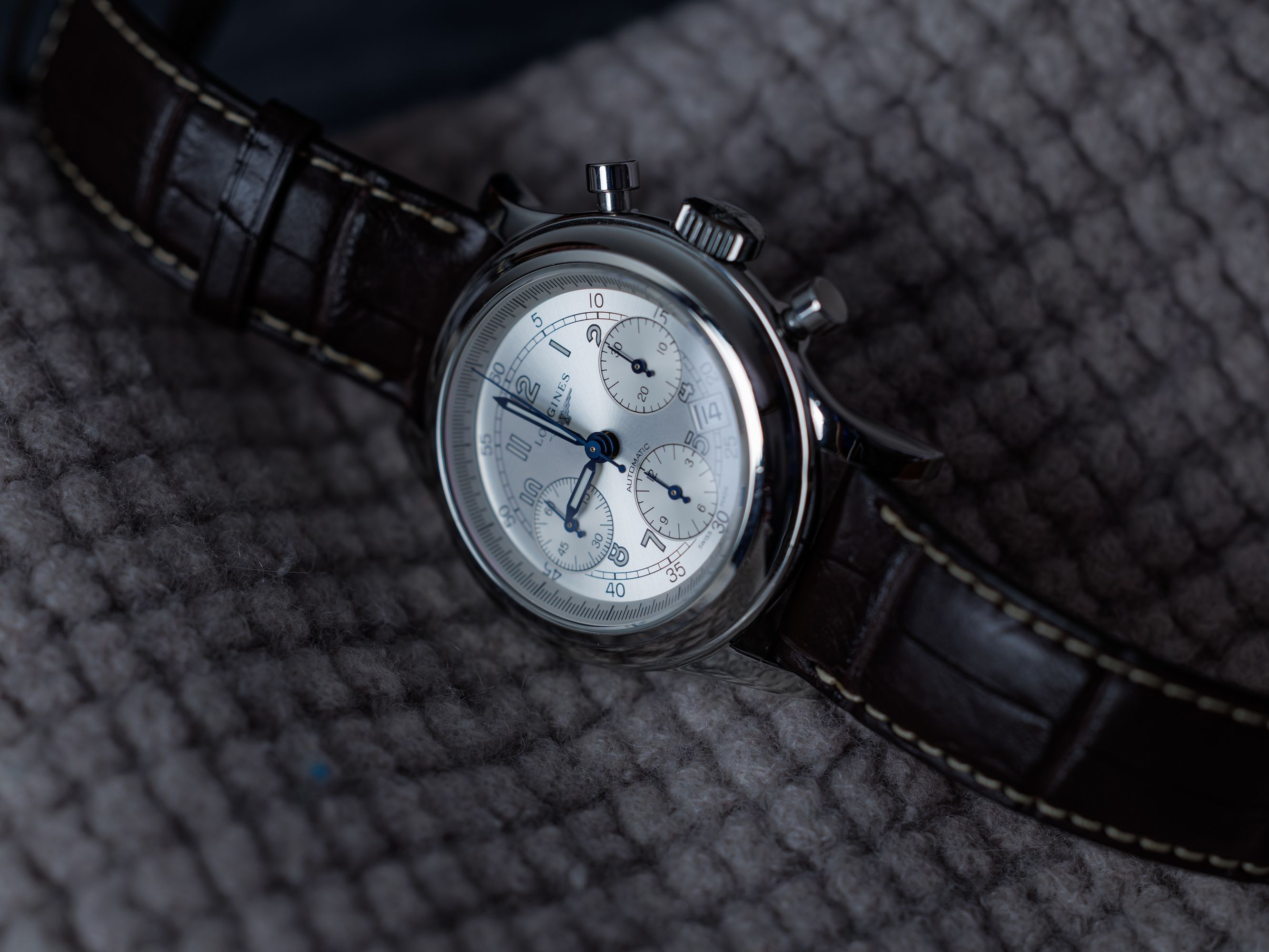Magnifique chronographe Longines – cadran argenté avec aiguilles bleues.