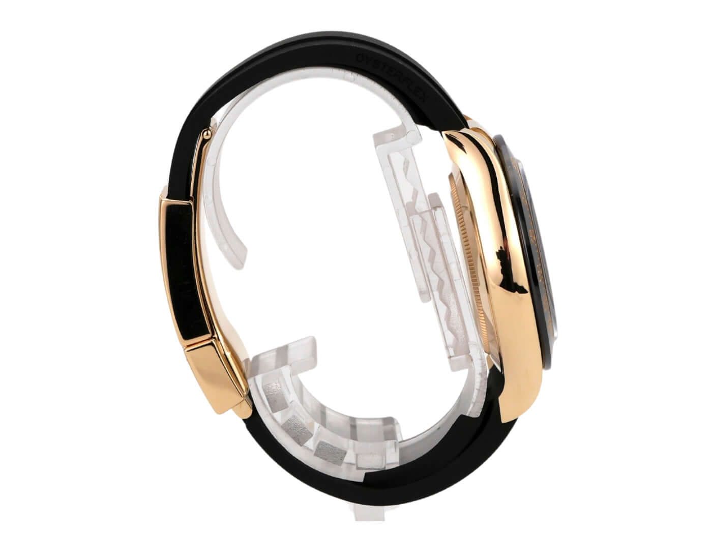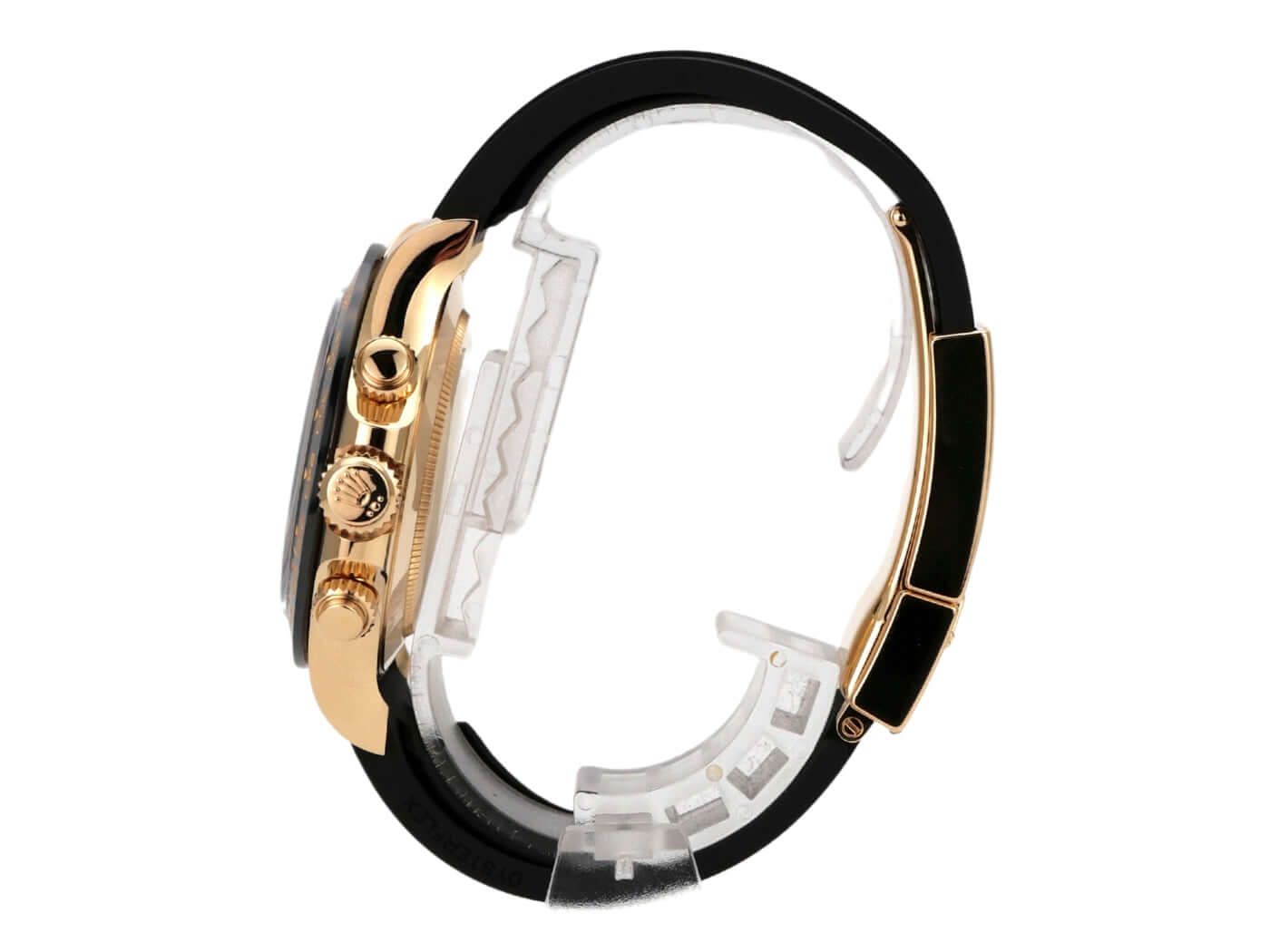 Rolex Daytona 116518LN yellow gold Oysterflex champagne-colored from 2020Case made of polished and satin-finished 18 kt yellow gold, case diameter 40 mm, case height 12.4 mm, ceramic bezel with tachymetric scale, black Oysterflex strap with 18 kt yellow gold folding clasp, champagne-colored dial with applied luminous indices, luminous hands, black subdials, automatic movement, Rolex manufacture caliber 4130 with 44 jewels, frequency 28,800 A/h, power reserve of about 72 hours, chronograph, chronometer, scratch-resistant sapphire crystal, screw-down crown made of 18 kt yellow gold with protection, screw-down case back made of 18 kt yellow gold, water-resistant up to 10 bar.