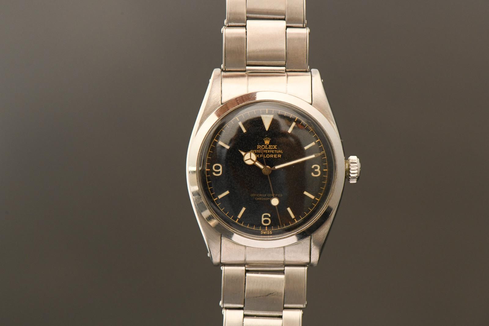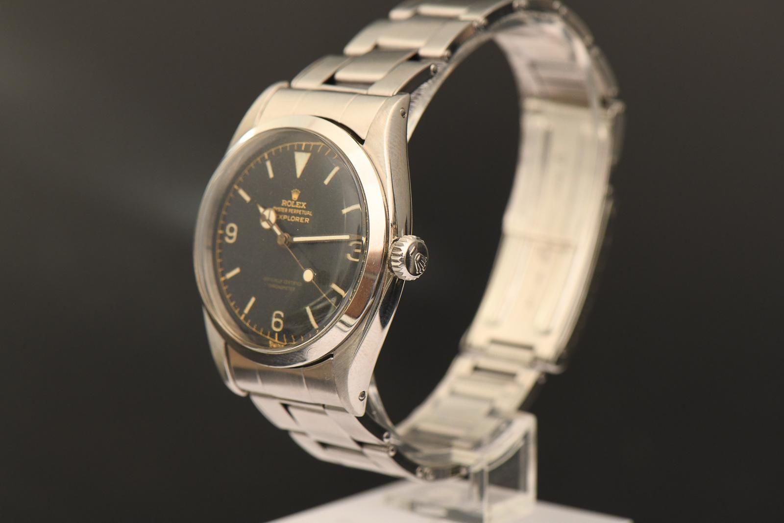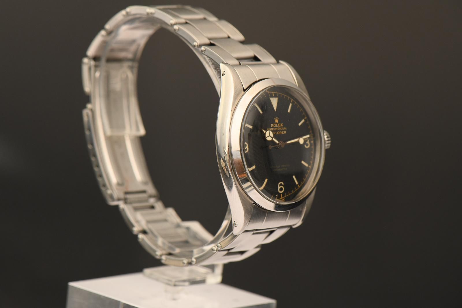 ROLEX Explorer 1 1956 Explorer der Refenz 6610. Beautiful early Rolex Explorer 6610 from 1956. This watch is now almost 70 years old, yet it has lost none of its beauty. The original gilt chapter ring dial is completely untouched, and the hands have been filled with new luminous material in a matching colour. But it still has the old gilt hand set with the large lollipop second hand, which gives the watch a fantastic look. The Rolex cal.1030 runs very well and has certainly been serviced recently, with an amplitude of 290 degrees and good accuracy. Unfortunately, we did not receive any documentation about the watch from the previous owner. Another highlight is the original riveted strap, which is in very good condition. It is a pull-through strap, all springs are working and none are broken. Finally, it is Swiss Made with a 1/57 date stamp. A wonderful watch with the rare OCC dial and original strap.