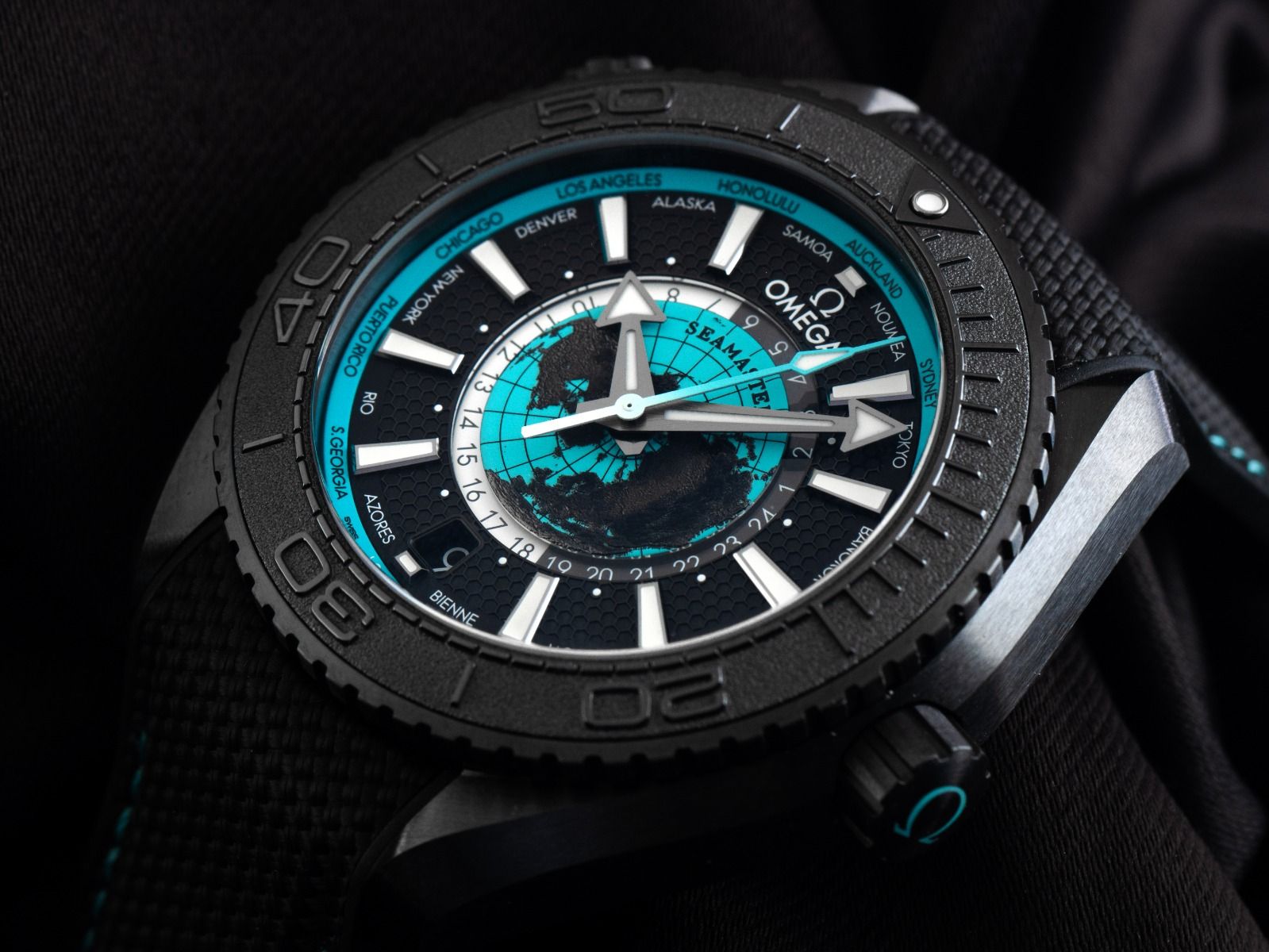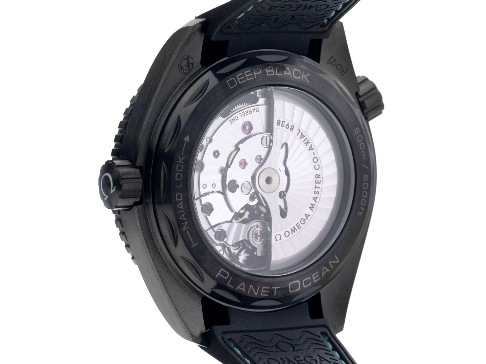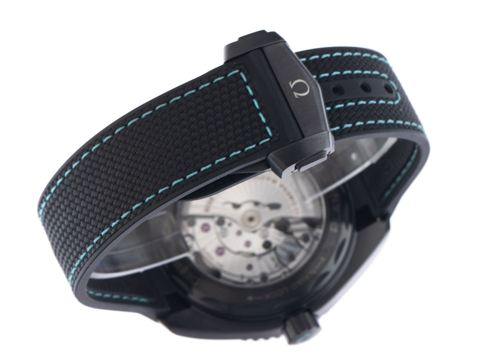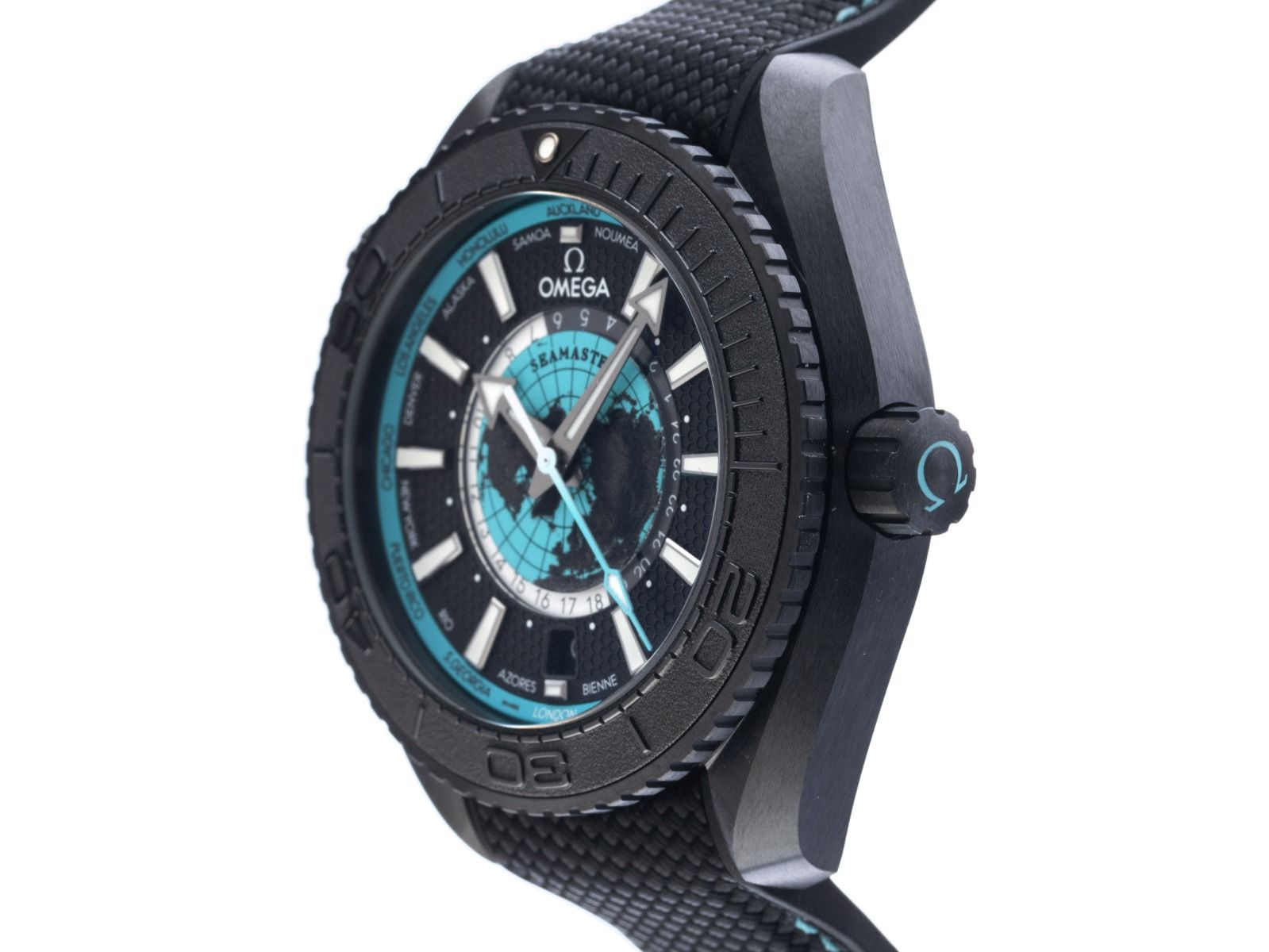 Boîtier en céramique satinée, diamètre du boîtier sans couronne 45,5 mm, hauteur du boîtier 17,3 mm. Lunette en céramique avec échelle de 60 minutes et point lumineux, unidirectionnelle. Bracelet en caoutchouc noir avec surpiqûre turquoise, largeur de l'entrecorne 22 mm, boucle déployante en titane / céramique avec logo du fabricant. Cadran noir / turquoise avec index lumineux appliqués et aiguilles lumineuses ainsi qu'une aiguille des secondes turquoise, affichage 24 heures et affichage des villes. Mouvement automatique, chronomètre avec certificat, calibre Omega 8938 avec 35 pierres précieuses, réserve de marche d'environ 60 heures. Affichage des heures, minutes et secondes par aiguilles centrales, affichage de la date avec réglage rapide à 6 heures. Verre saphir résistant aux rayures et bombé. Couronne vissée avec logo du fabricant. Fond en céramique vissé et gravé avec fenêtre en verre saphir. Poids de la montre avec bracelet 157 g. Étanche jusqu'à 60 ATM. Numéro de référence : 215.92.46.22.01.006, ID : ST5806229140925H-16200, numéro d'article : 10000082513. Boîte Omega originale avec carton d'emballage et papiers de garantie de septembre 2025 ainsi que description, ensemble complet. Non porté. Délai de livraison immédiat.