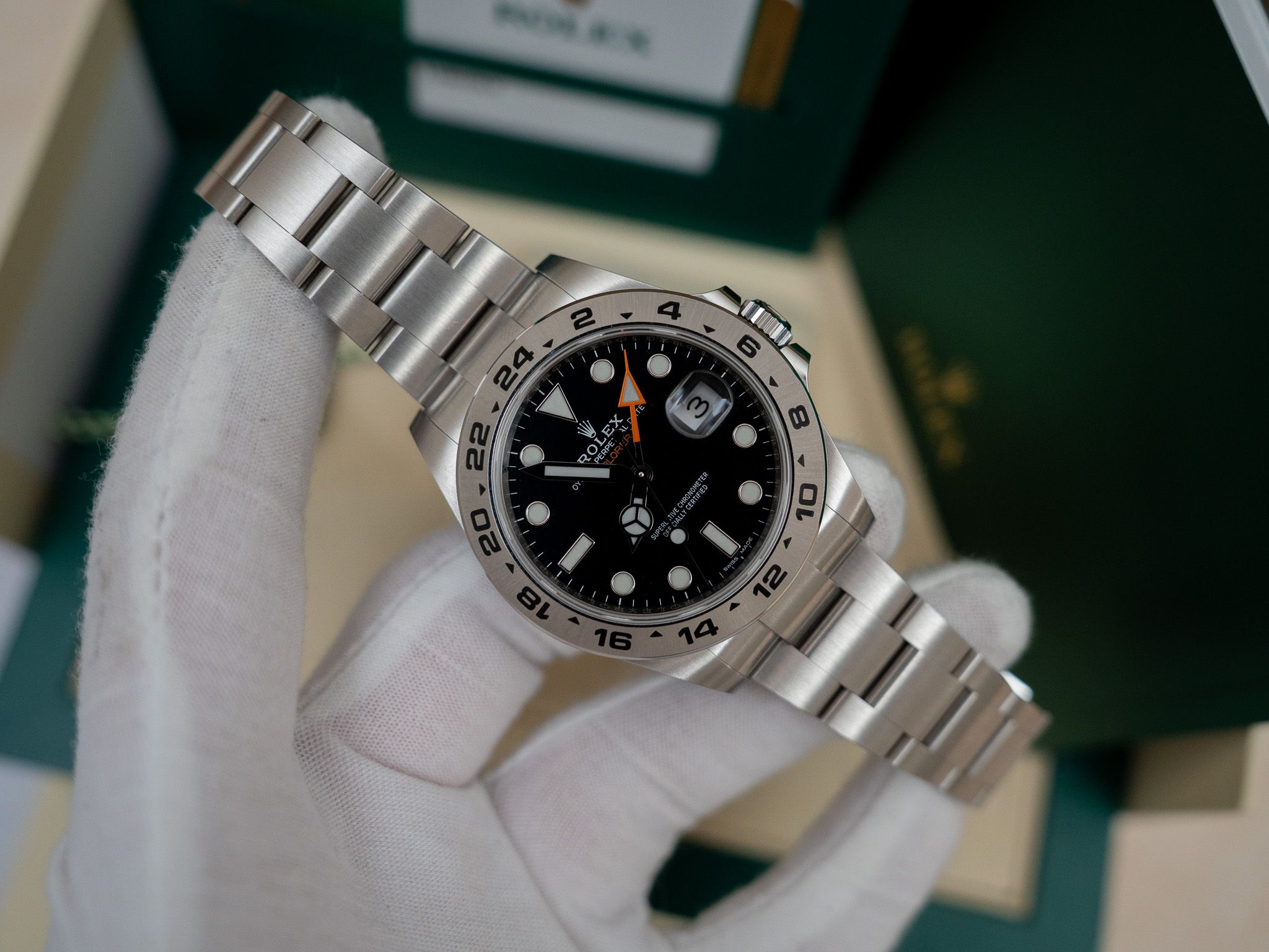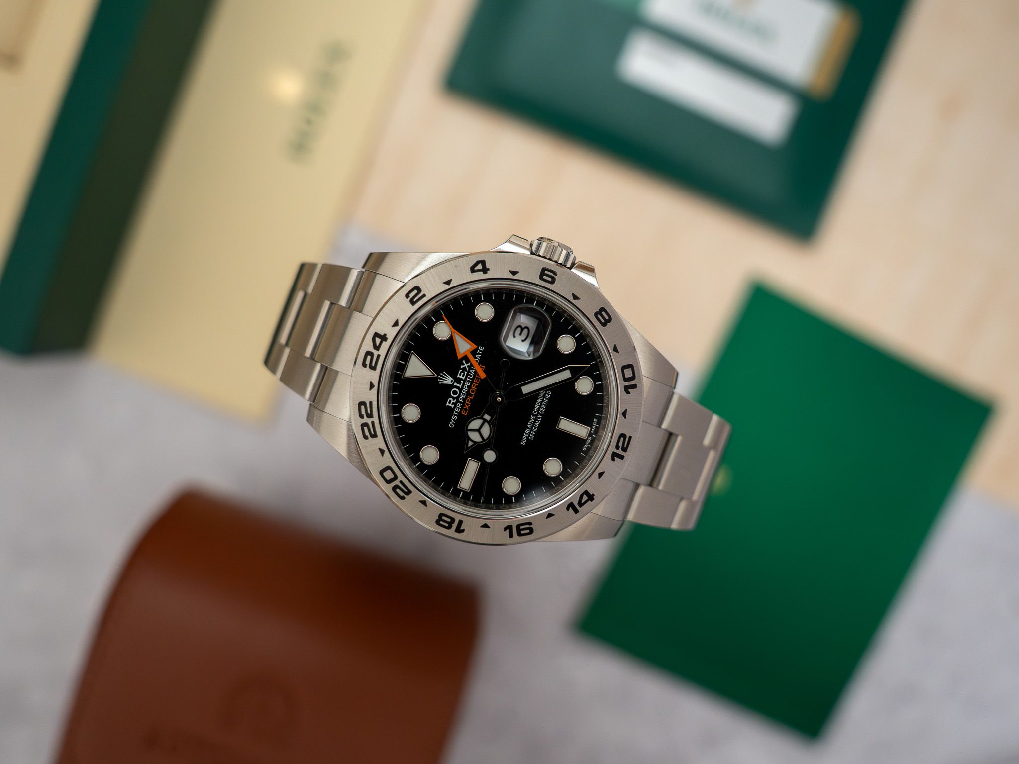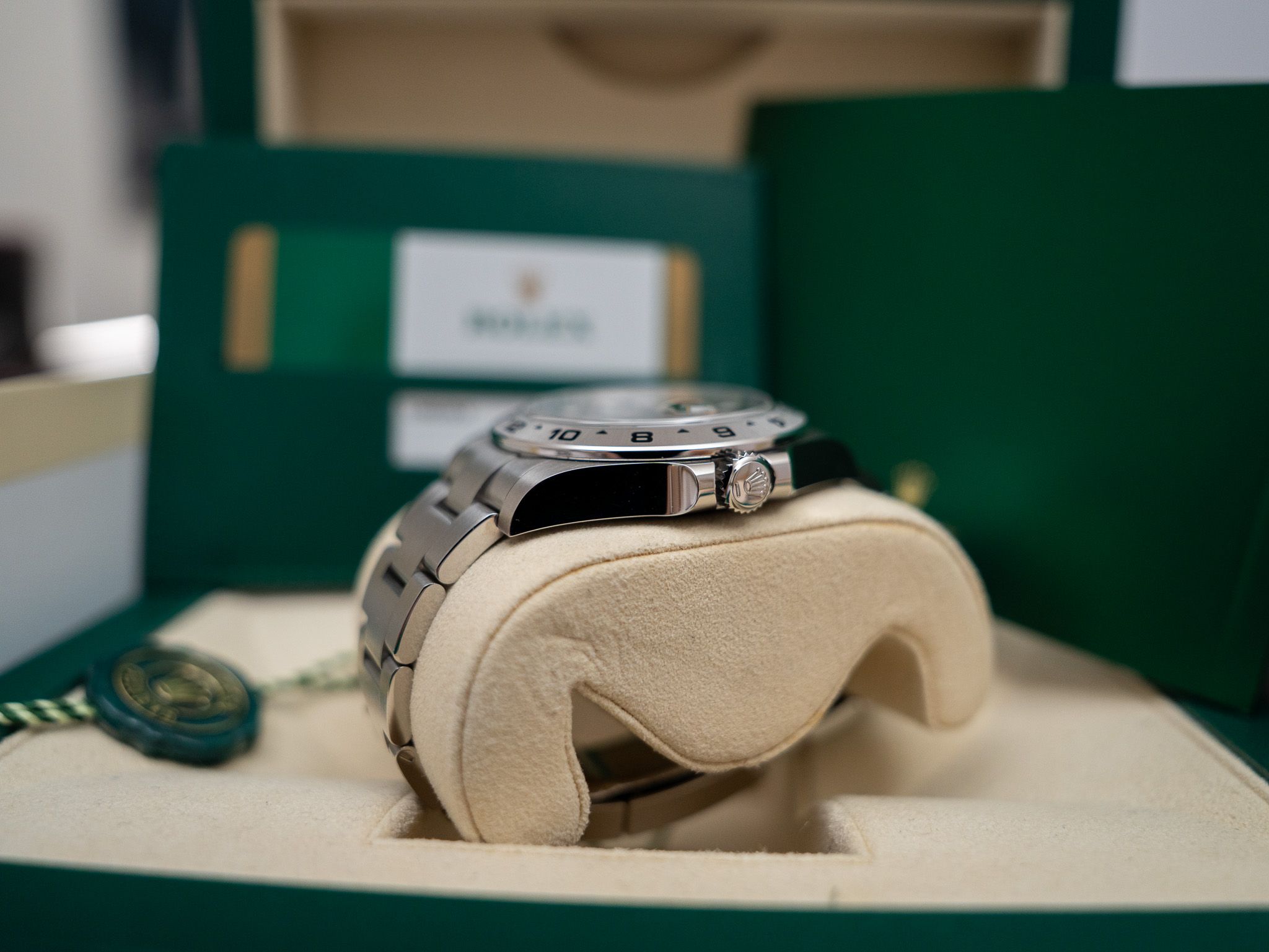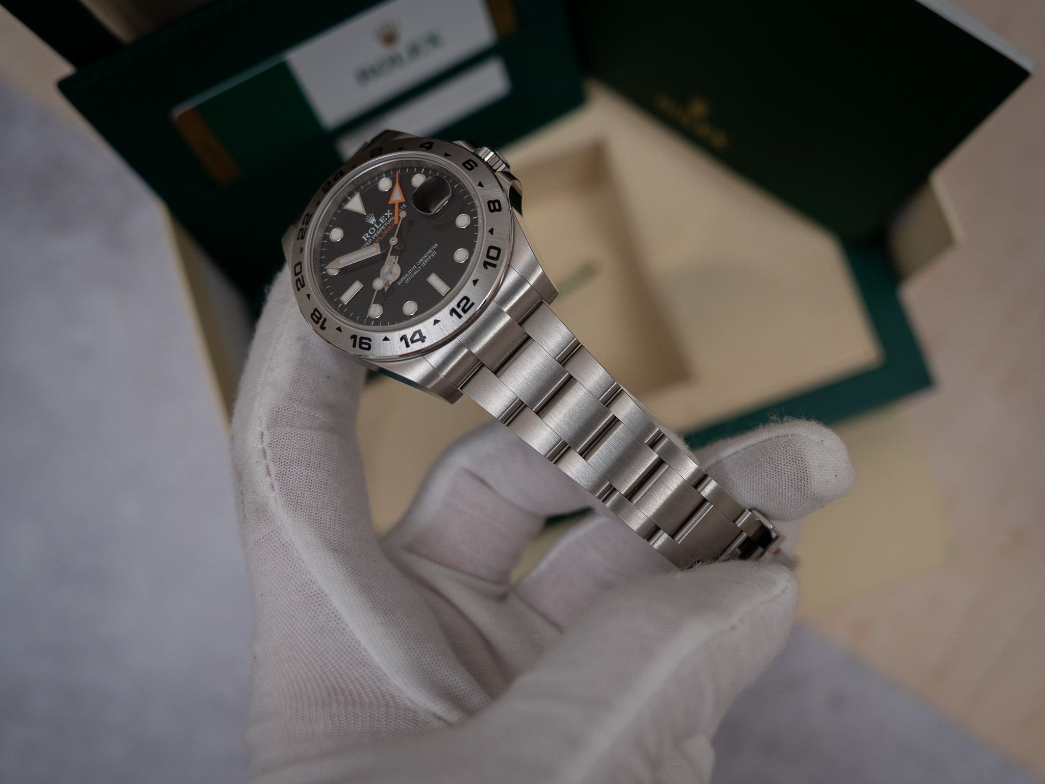Rolex Explorer II avec cadran noir. La montre est datée de 2020 et est vendue en ensemble complet avec boîte et papiers. Elle est en excellent état avec quelques autocollants d'origine encore présents sur la montre, notamment sur le fermoir et le fond de boîte. Ce garde-temps n'a été porté que quelques fois avec beaucoup de soin. Cela se reflète dans son excellent état comme le montrent les photos.