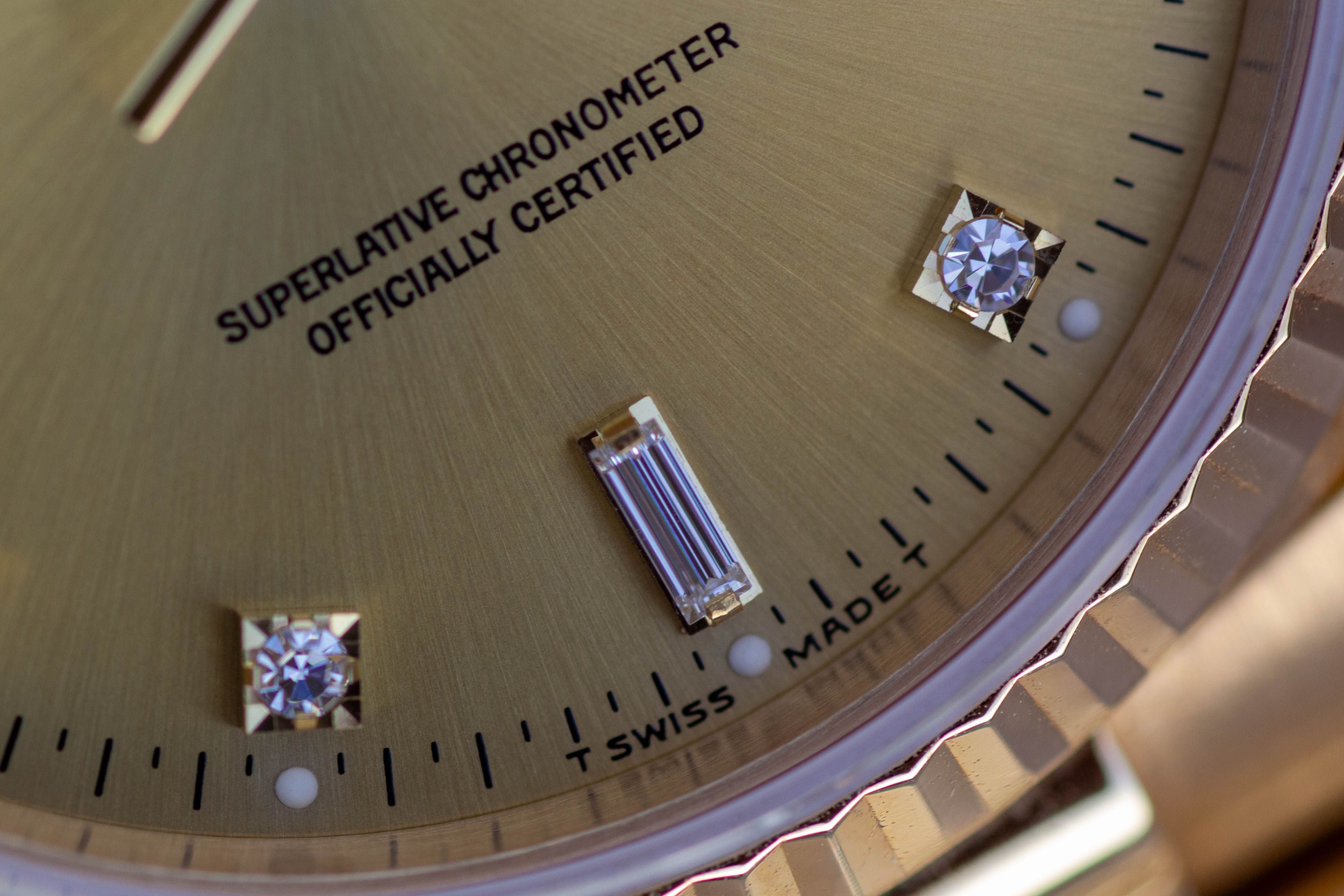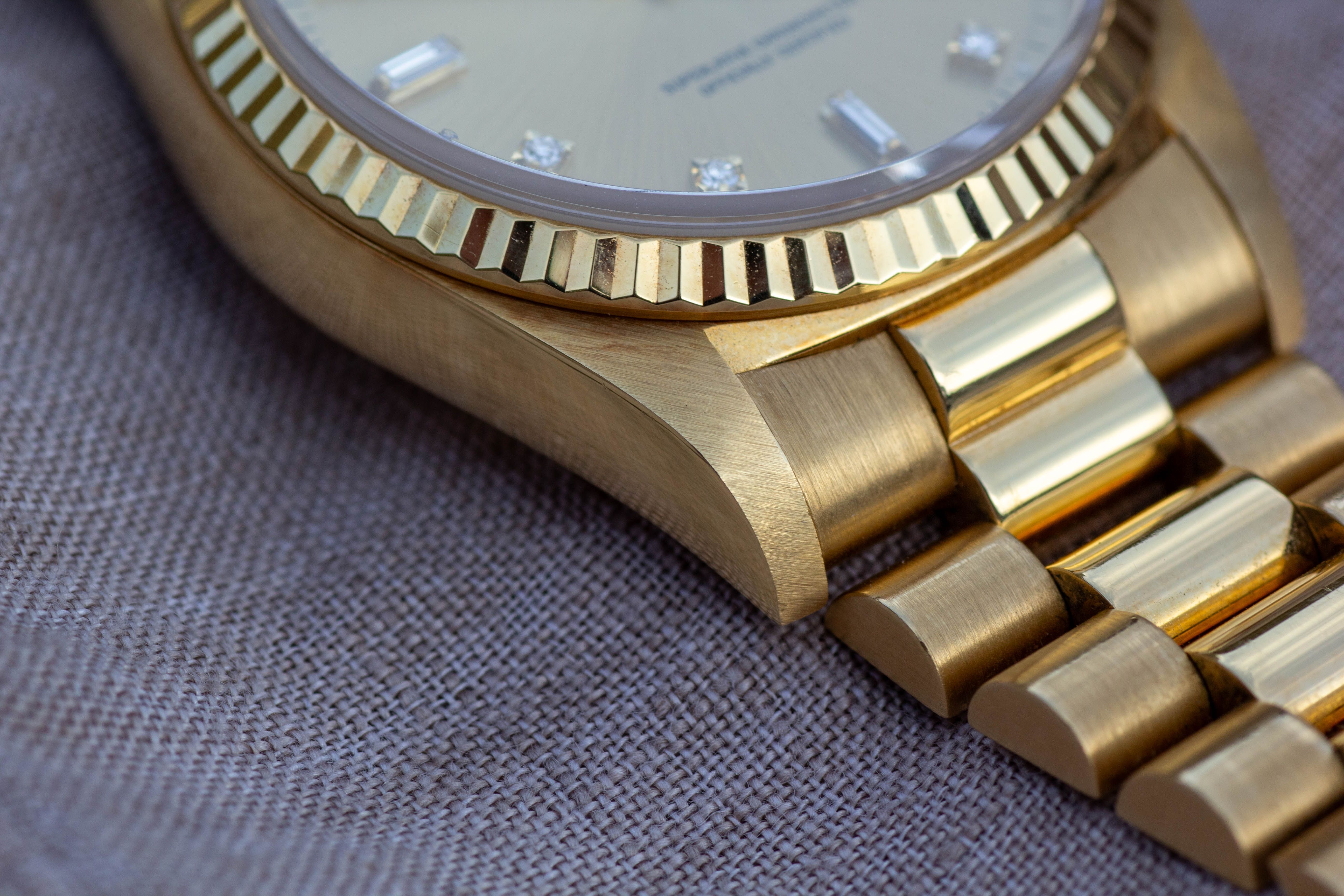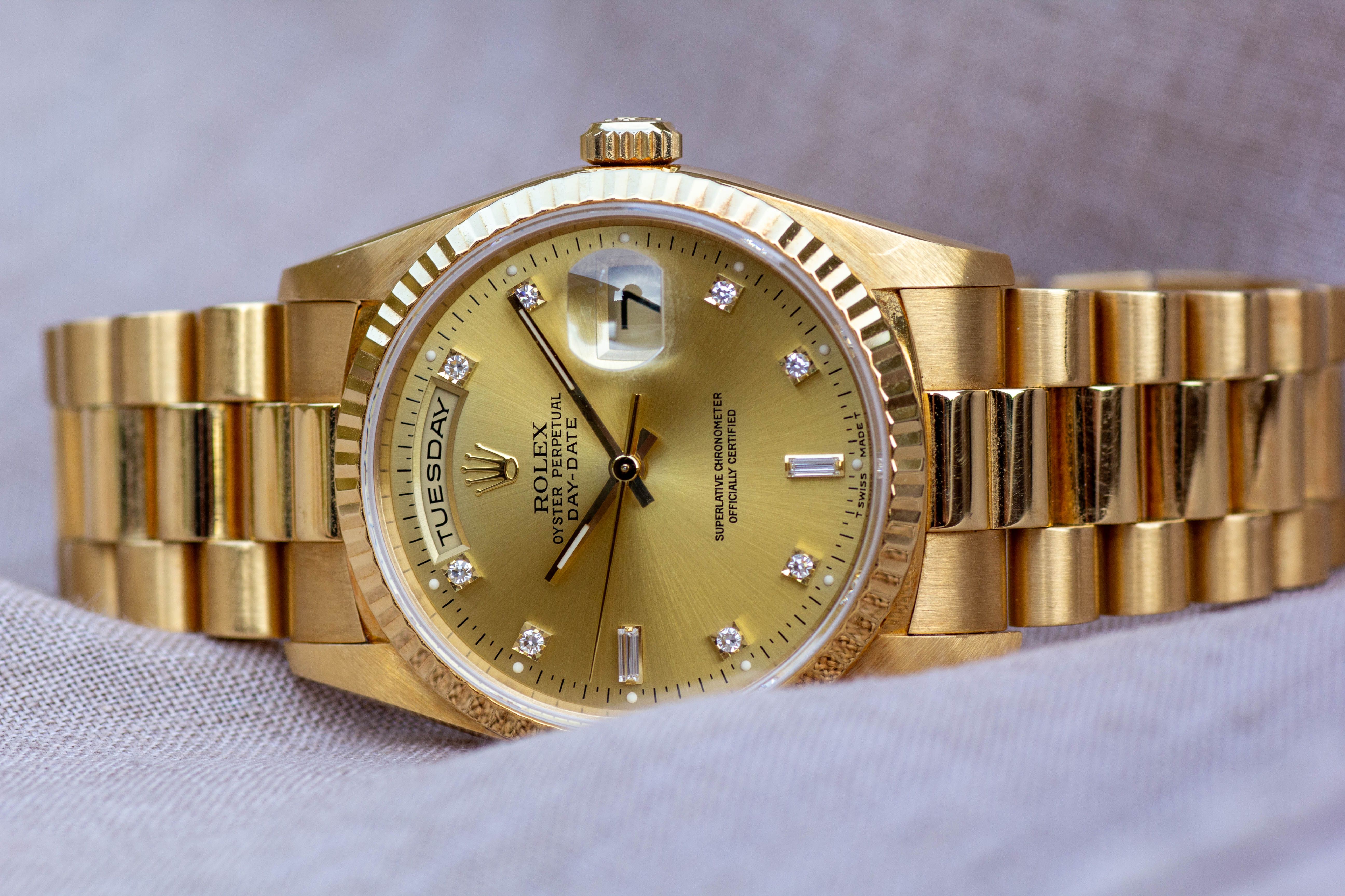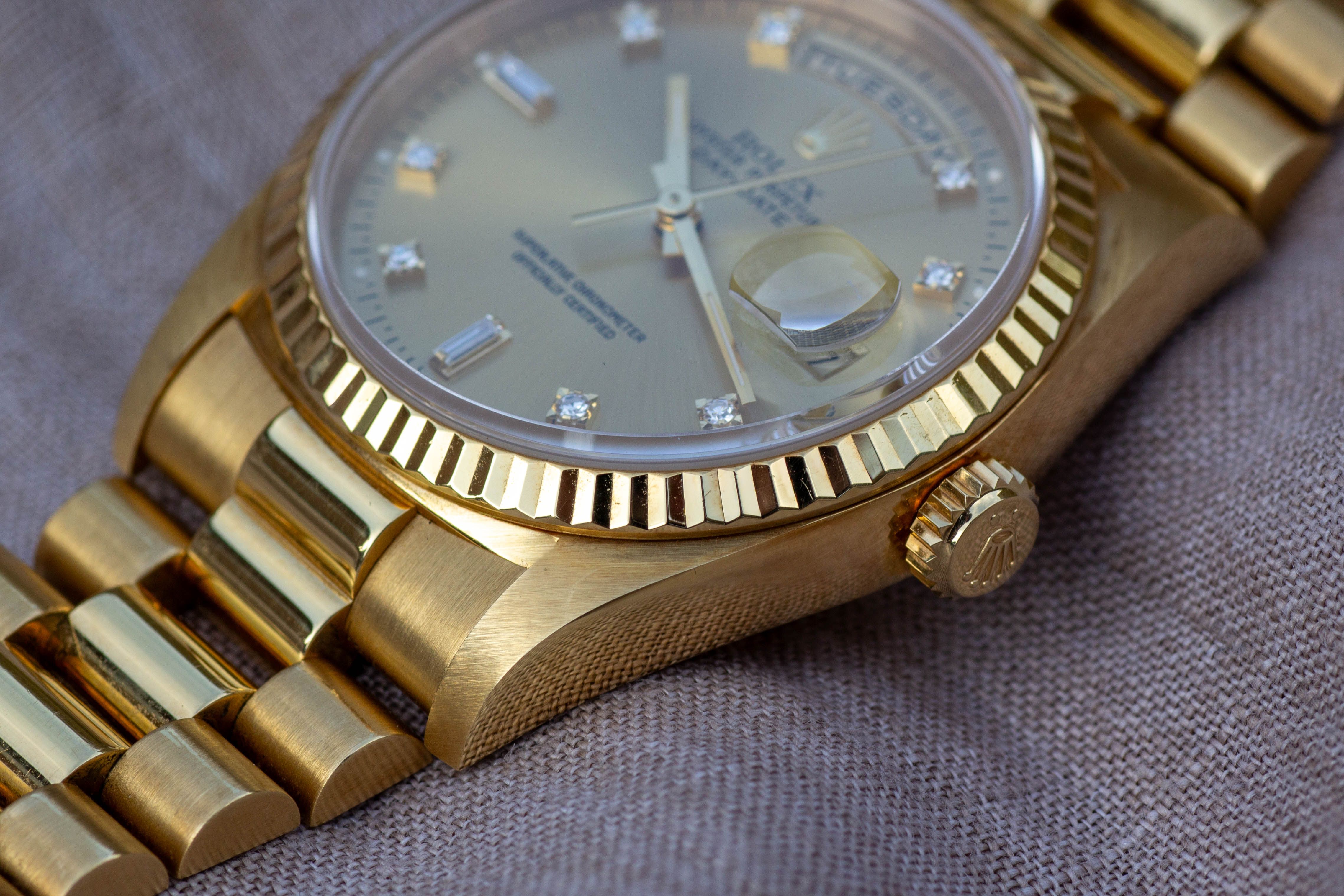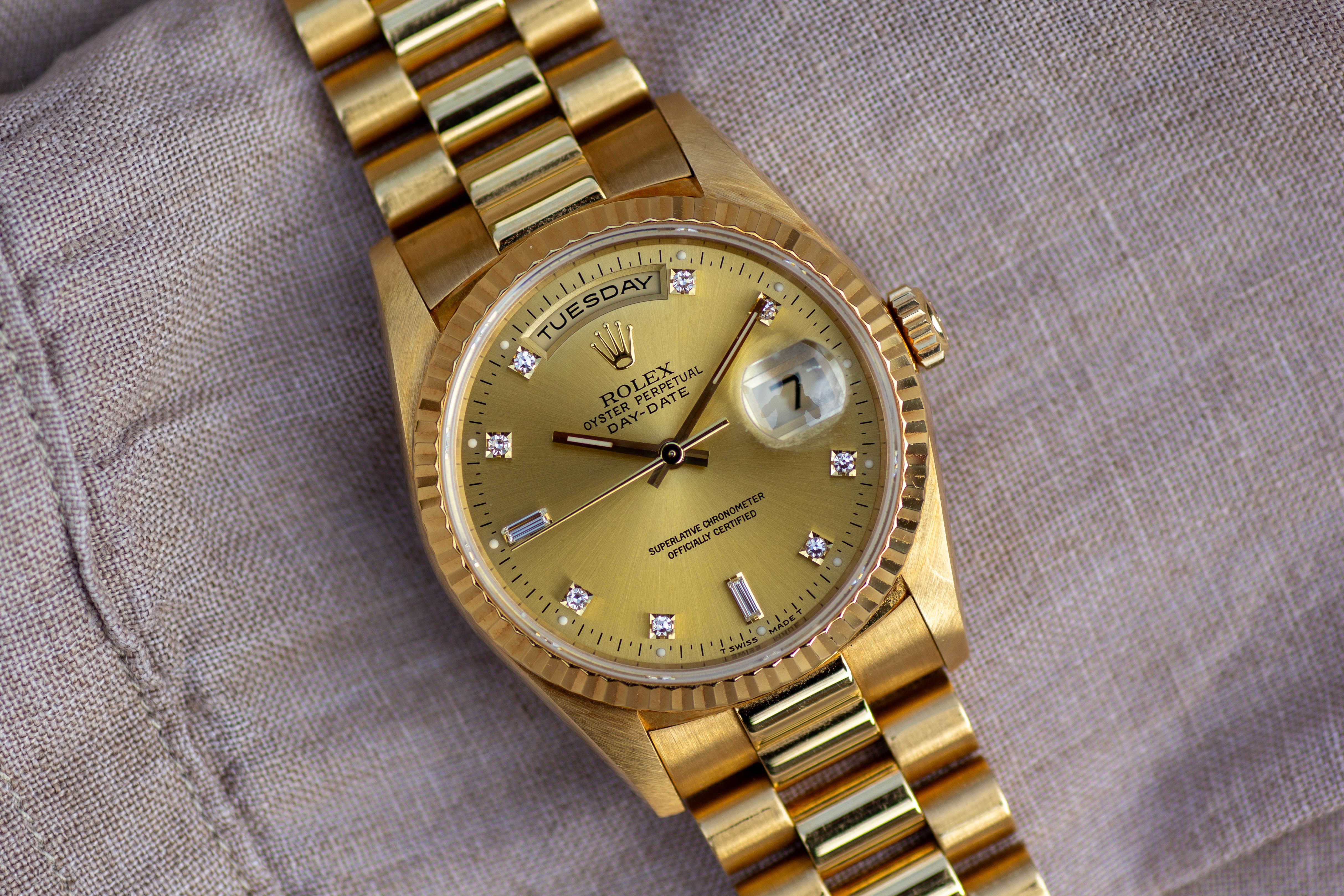 La Rolex Day-Date 18238 est pour moi l'une de ces montres sur lesquelles on ne peut s'empêcher de poser les yeux. L'or jaune chaud associé au cadran couleur champagne dégage une classe absolue. Les dix diamants, dont deux baguettes, complètent parfaitement le bracelet président. C'est une montre qui ne se contente pas d'indiquer l'heure, mais qui porte aussi un morceau de caractère et d'histoire.