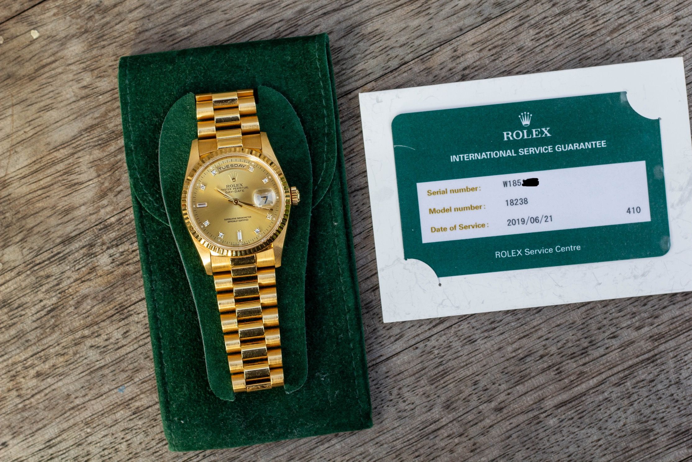 Rolex Day-Date 18238 champagne diamond | 1995 | service card