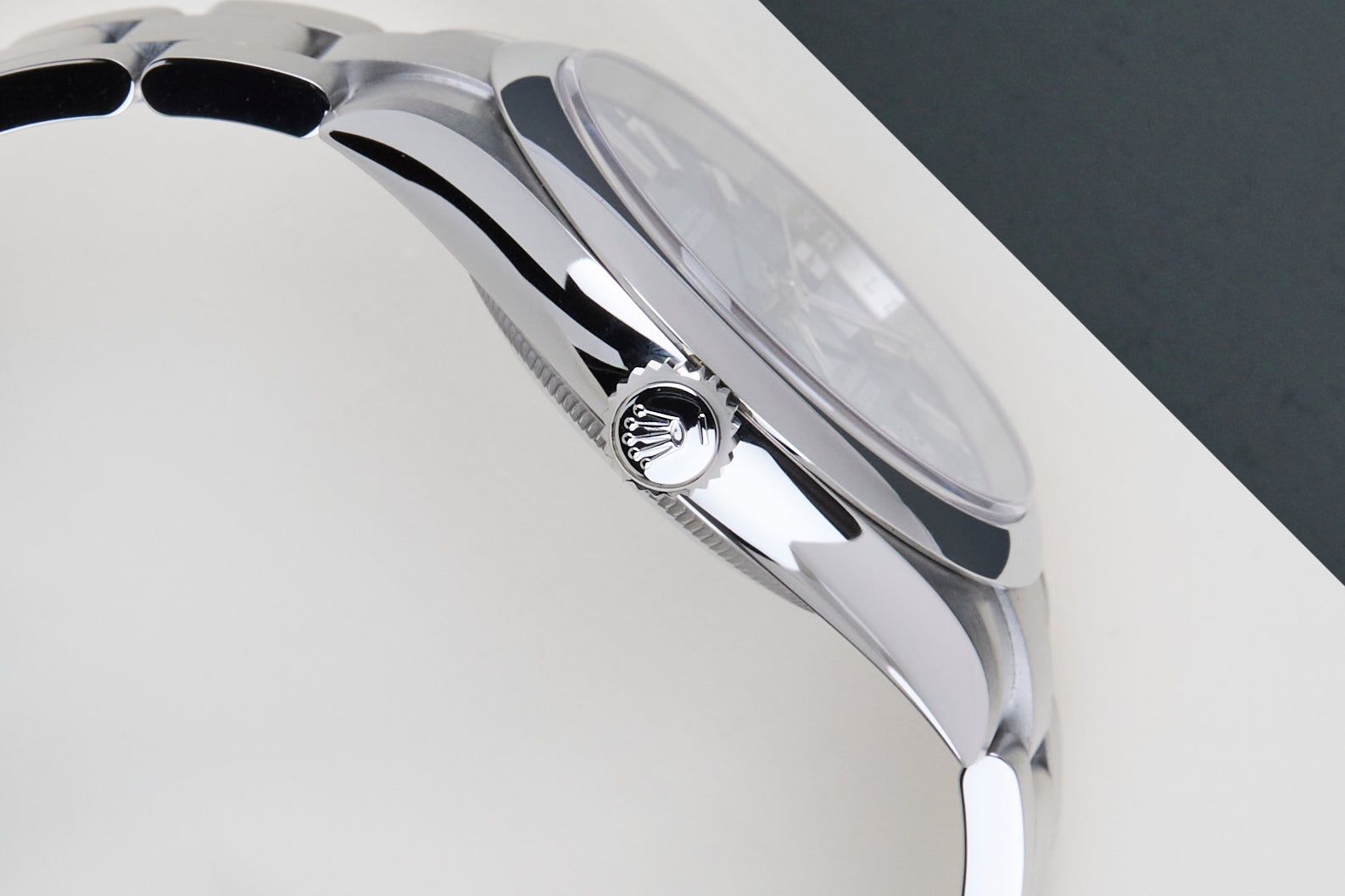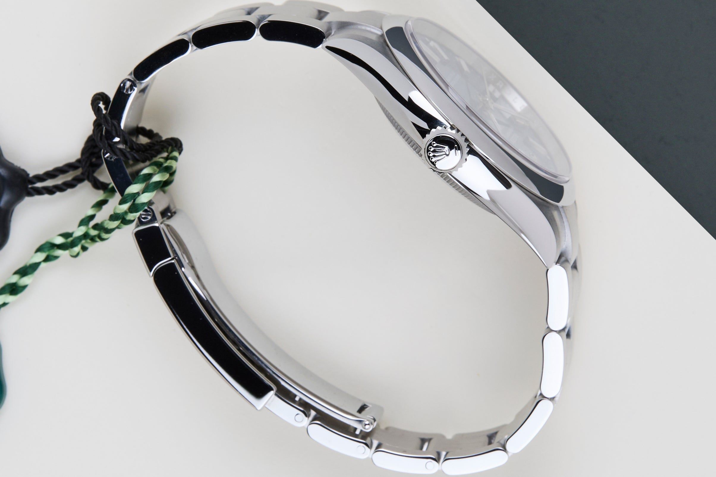 Cette Rolex Oyster Perpetual 'Cadran Bleu' a été vendue pour la première fois en juin 2025. La montre est entièrement en acier inoxydable. Rolex utilise de l'acier 904L dans ses montres en acier, qui est un superalliage extrêmement résistant et hautement poli.
