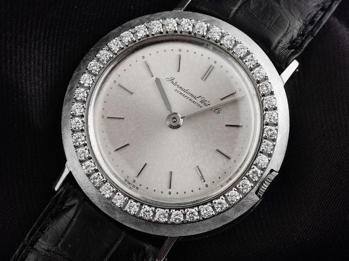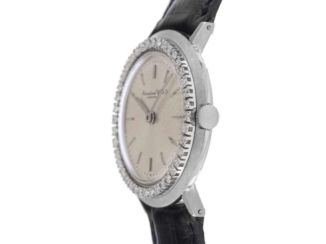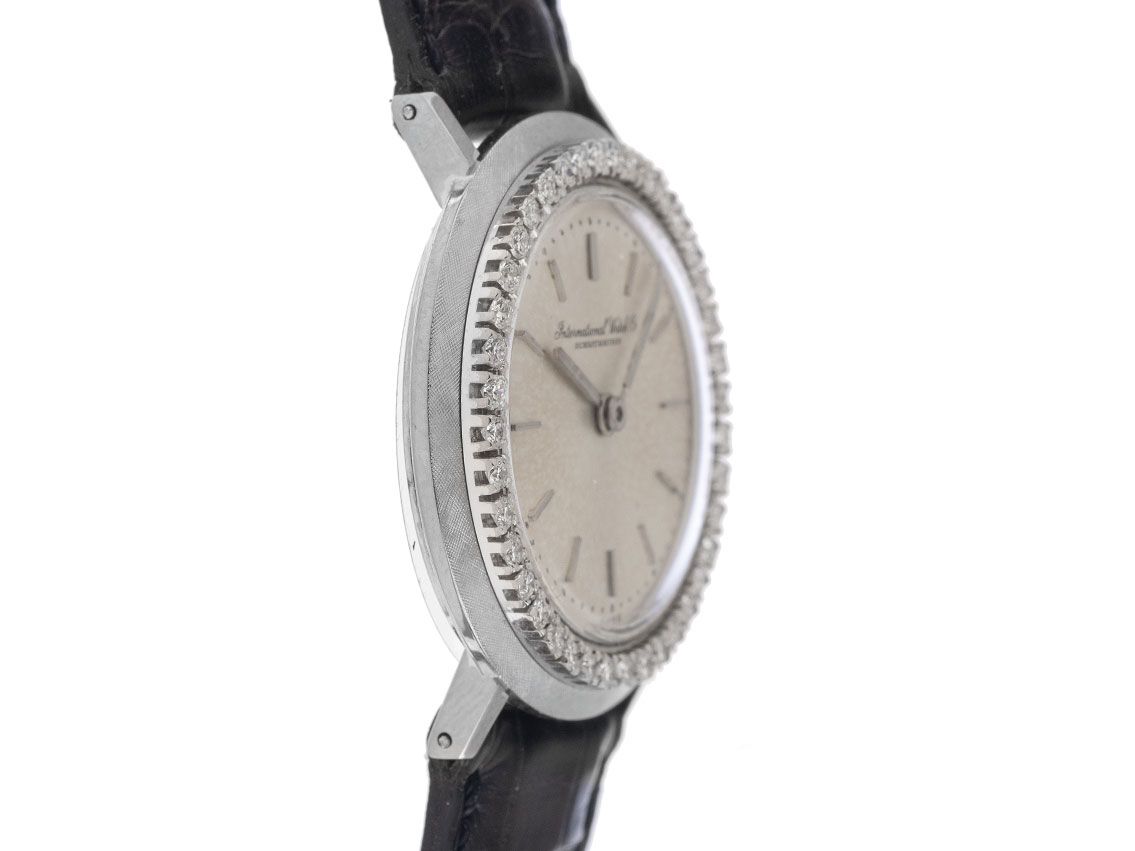 IWC Classique 18kt Weißgold Diamanten Handaufzug Armband LederGehäuse 18kt Weißgold poliert, Gehäusedurchmesser ohne Krone 33mm, Gehäusehöhe 8,2mm. Lünette 18kt Weißgold diamantiert mit Brillanten besetzt, zusammen ca. 1,4ct TW / VVSI (Feines Weiß mit sehr sehr kleinen Einschlüssen). Armband Leder schwarz, Anstoßbreite 18mm, Stiftschließe Edelstahl. Zifferblatt silberfarben mit aufgesetzten Edelstahl Indexen und Edelstahl Zeigern. Uhrwerk Handaufzug, IWC Manufakturkaliber C.421 mit 17 Edelsteinen. Anzeige von Stunde und Minute über Zeiger aus der Mitte. Plexiglas gewölbt. Krone geriffelt im Gehäuse eingelassen. Boden 18kt Weißgold. Gewicht der Uhr inklusive Armband 39g. Gehäusenummer: 1715XXX, Baujahr: 1965, ID: P171534001025H-5200, Artikelnummer: 10000082636. Mit Gangkontrolle und kompletter äußerlicher Aufarbeitung von Oktober 2025. Original IWC Box sowie Watchregister Auszug von Oktober 2025, The Watch Register Zertifikat / ohne Eintrag (Internationale Datenbank für verlorene oder gestohlene Uhren). Superschnäppchen, Kapitalanlage mit Wertsteigerungspotential, extrem seltenes Sammlerstück. Sehr guter Zustand. Lieferzeit sofort.