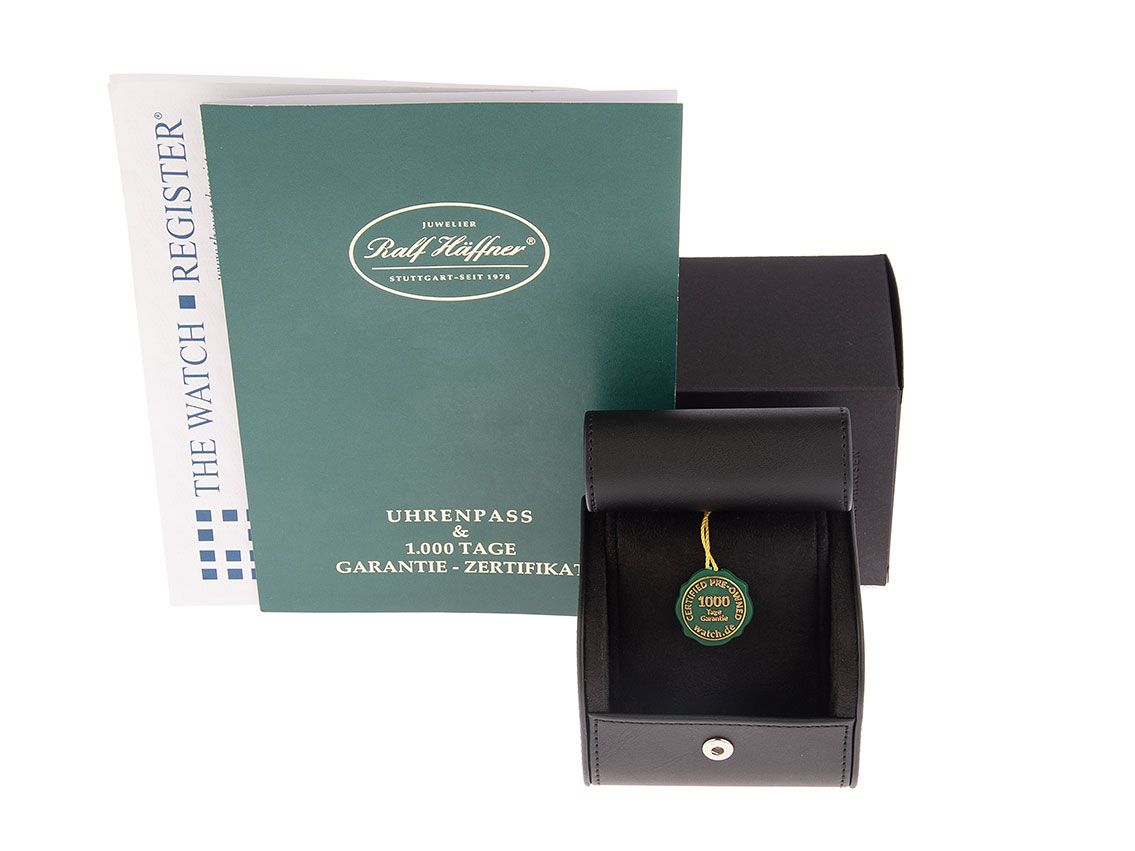 Inklusive certified pre owned Siegel / Uhrenpass mit einem Farbbild, der genauen Beschreibung sowie dem Wiederbeschaffungswert der Uhr über 5200,-€ und 1000 Tage Garantie ab Kaufdatum.