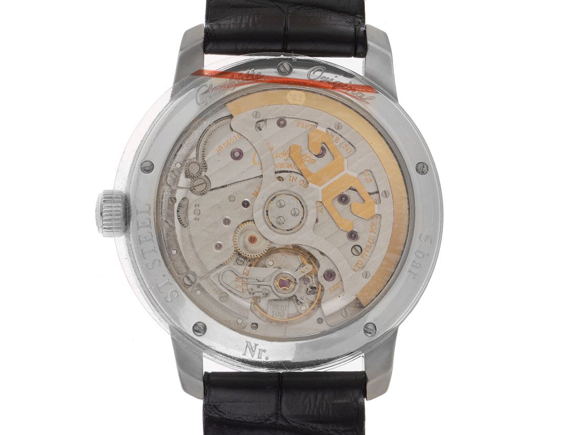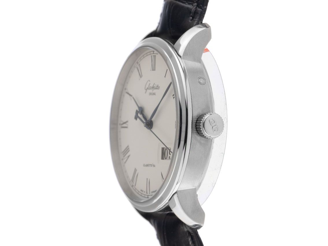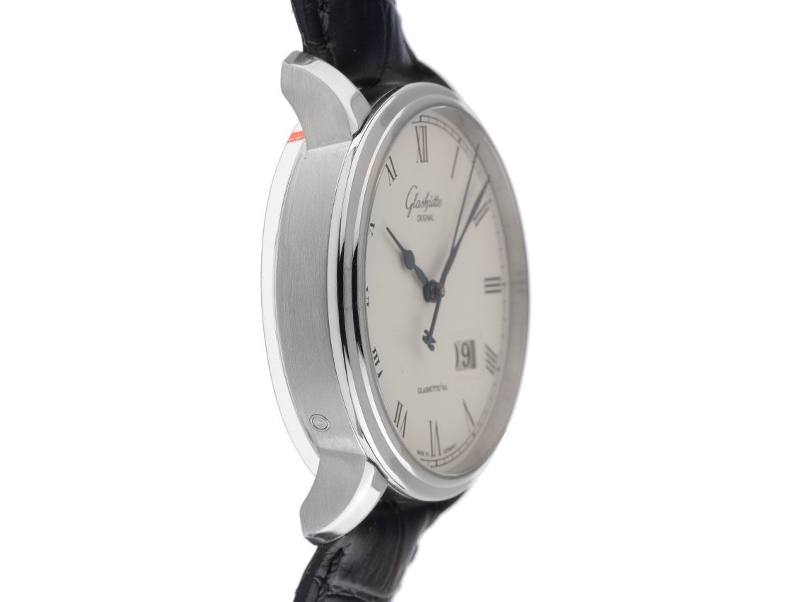 Boîtier en acier poli et satiné, diamètre du boîtier sans couronne 40mm, hauteur du boîtier 12,0mm. Lunette en acier lisse et poli. Bracelet en cuir noir avec surpiqûre, largeur de l'entrecorne 20mm, boucle déployante Glashütte Original en acier avec logo du fabricant. Cadran blanc avec chiffres romains noirs et aiguilles bleuies. Mouvement automatique, calibre manufacturé Glashütte Original GO/00 avec 51 pierres précieuses. Affichage de l'heure, des minutes et des secondes par aiguilles centrales avec stop-seconde pour un réglage précis de l'heure, affichage panoramique de la date avec réglage rapide à 4 heures. Verre saphir résistant aux rayures et bombé. Couronne avec logo du fabricant. Fond en acier vissé 5 fois et gravé avec fenêtre en verre saphir. Poids de la montre avec bracelet 80g. Numéro de référence : 1-00-03-32-42-04, numéro de boîtier : 18XXX, année de fabrication : 2016, ID : P172960721025H-8200, numéro d'article : 10000082665. Avec contrôle de marche et révision extérieure complète d'octobre 2025. Boîte Glashütte Original avec carton d'emballage et extrait du Watch Register d'octobre 2025, certificat The Watch Register / sans inscription (base de données internationale pour montres perdues ou volées). Super affaire, presque pas portée. Comme neuve. Délai de livraison immédiat.