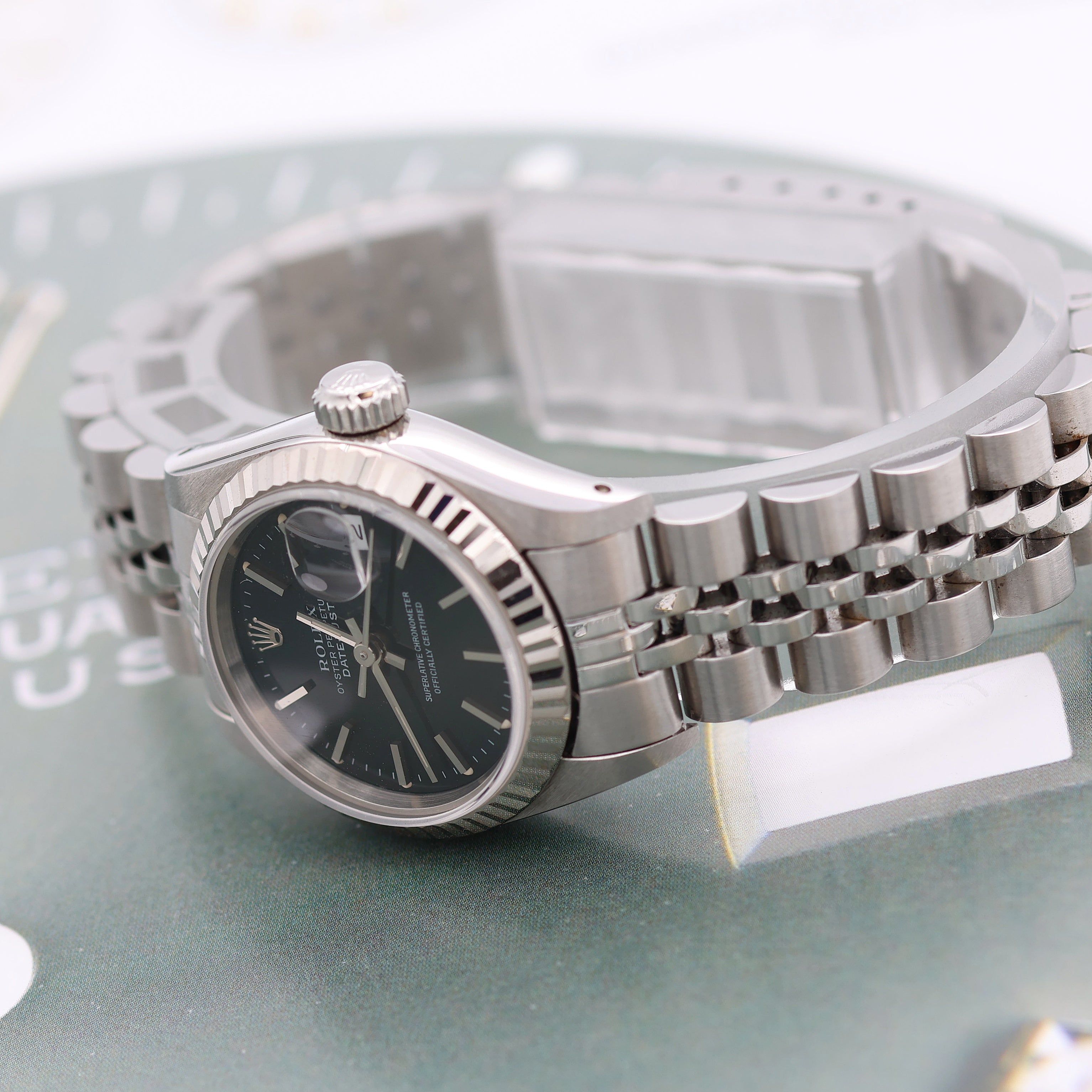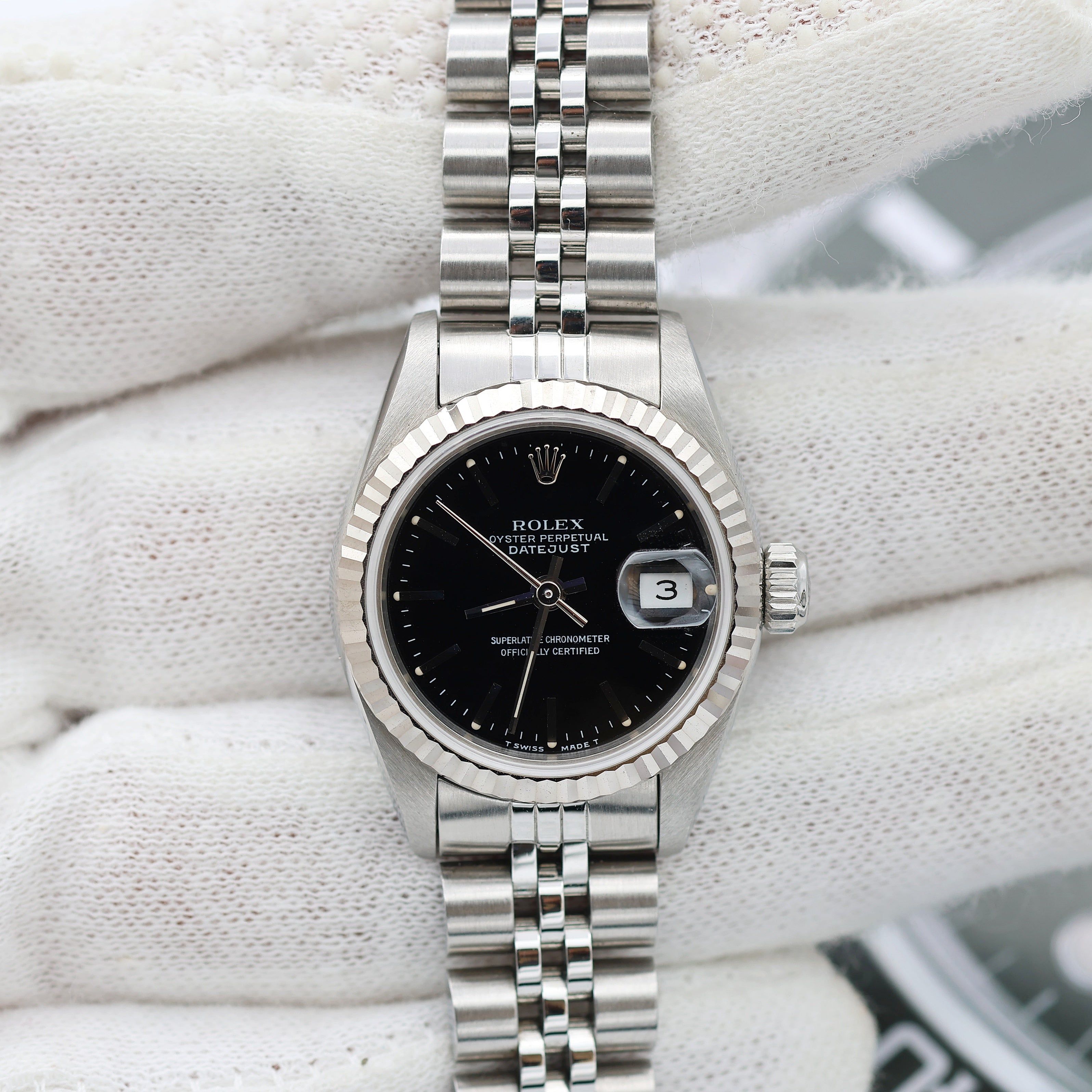For sale at Debonar Watches: pre-owned Rolex Oyster Perpetual Datejust Ref. 69174 from approximative the end of the '90s, with a black dial.Fine, center seconds, self-winding automatic, water-resistant, stainless steel and 18K white gold lady's wristwatch with date and a stainless steel Rolex Jubilee bracelet with deployant clasp.The Lady-Datejusts are all about delicacy and finesse, something to accentuate a sophisticated outfit. BRAND ROLEX MODEL DATEJUST LADY REFERENCE 69174 CASE MATERIAL STEEL MOVEMENT AUTOMATIC DIMENSION 26 MM DIAL BLACK BEZEL 18K GOLD CRYSTAL SAPPHIRE BRACELET TYPE JUBILEE BRACELET MATERIAL STEEL BRACELET LENGHT 16 CM ORIGINAL BOX YES ORIGINAL PAPERS YES YEAR APPROX. THE '90s CONDITION EXCELLENT