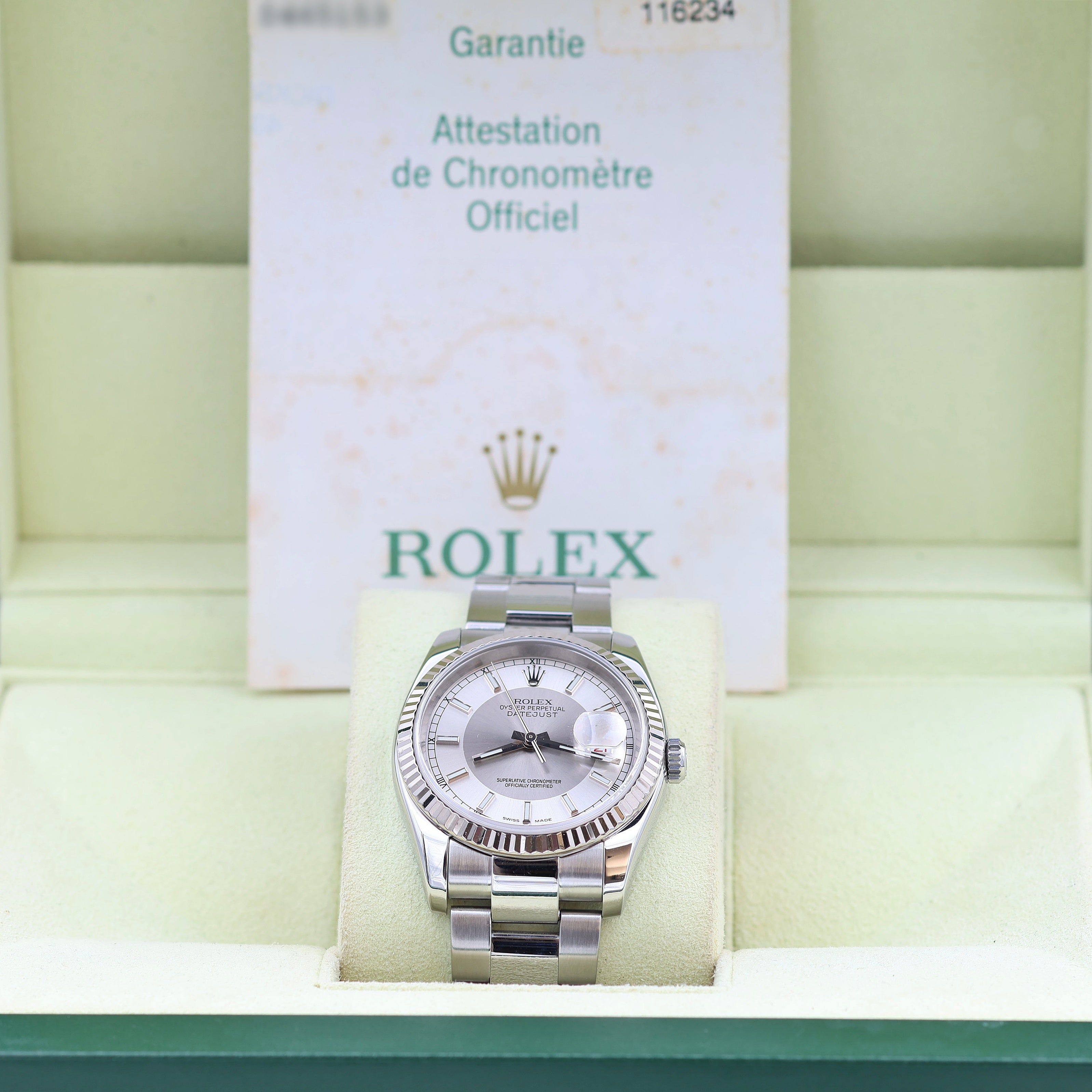 For sale at Debonar Watches: pre-owned Rolex Datejust 116234, in excellent conditions, with a peculiar silver and grey dial also called "Tuxedo".Looking for a Rolex that seamlessly transitions from formal to casual wear? The Datejust 116234 is your perfect match.This exemplar has been paired with an Oyster bracelet, the most classic option with a Datejust. If you’re only going to be wearing one watch from now on, it needs to be one that you can wear in any situation: the Rolex Datejust 36mm ref 116234. This is the modern descendent of the classic DJs of the 1950s: the one we have here is the classic 36mm size, not the 41mm Datejust II. A bit of its story:Rolex DateJust (inspired by Rolex Bubbleback) was first introduced in 1945 to celebrate the 40th anniversary of Rolex. The Datejust is one of the earliest Rolex models that survives till today.From its debut way back in 1945, a revolutionary launch that put the brand firmly on the map, it has remained at the top of the company’s bestseller list for three quarters of a century. BRAND ROLEX MODEL DATEJUST REFERENCE 116234 CASE MATERIAL STEEL MOVEMENT AUTOMATIC DIMENSION 36 MM DIAL SILVER/GREY ("TUXEDO") BEZEL WHITE GOLD CRYSTAL SAPPHIRE BRACELET TYPE OYSTER BRACELET MATERIAL STEEL BRACELET LENGHT 18 CM ORIGINAL BOX YES ORIGINAL PAPERS YES YEAR APPROX. '10s CONDITION EXCELLENT