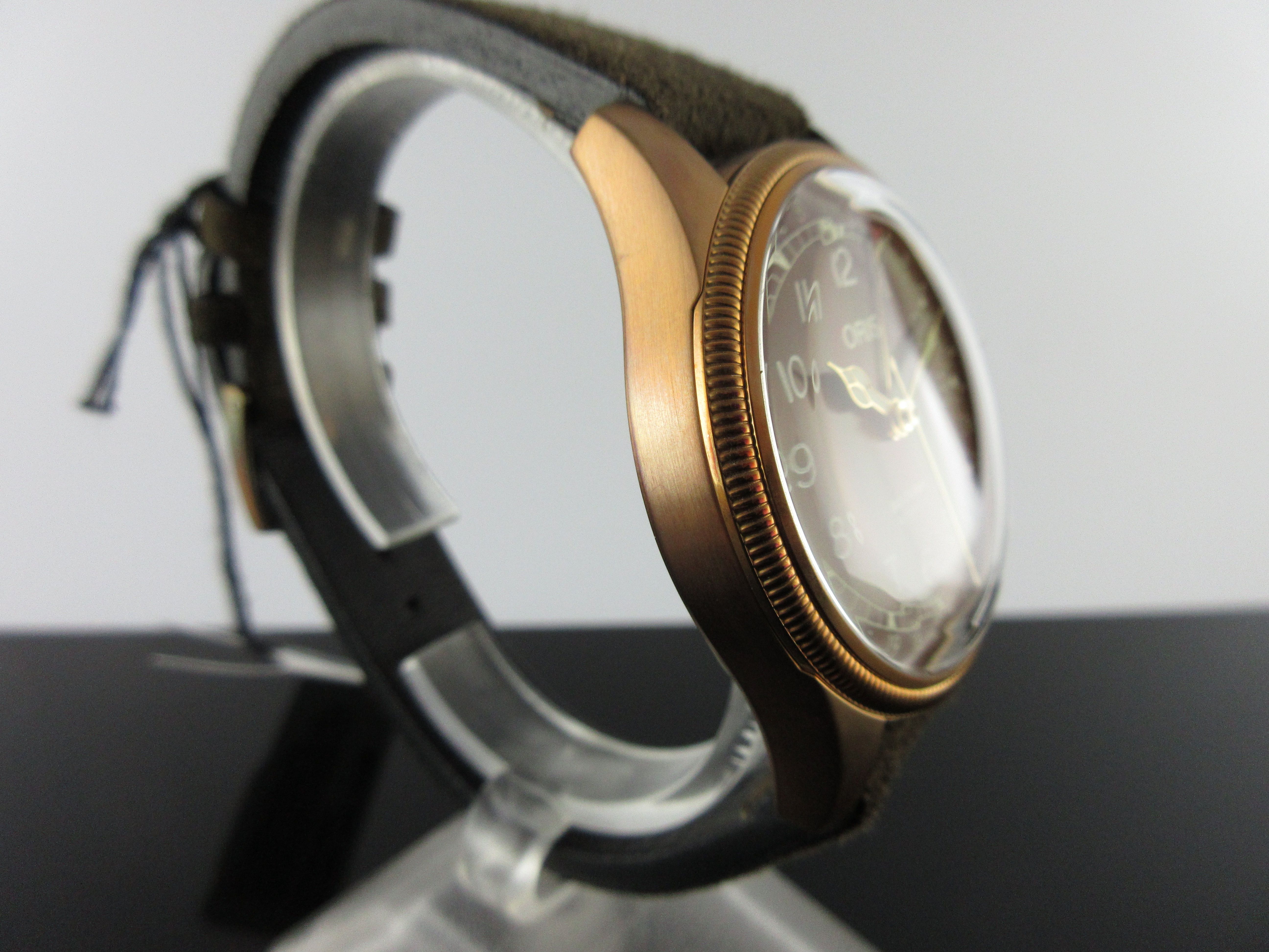 Automatik, Kaliber Oris 754, Basis SW 200-1, Bronzegehäuse im Durchmesser von 40 mm, dunkelbraunes Lederarmband mit Dornschließe aus Bronze, beidseitig gewölbtes und innen entspiegeltes Saphirglas, echtes Bronze-Zifferblatt, Datumszeiger aus der Mitte mit roter Spitze, arabische Ziffern mit Superluminova, verschraubter Gehäuseboden aus Edelstahl mit Mineralglas, 5 bar wasserdicht