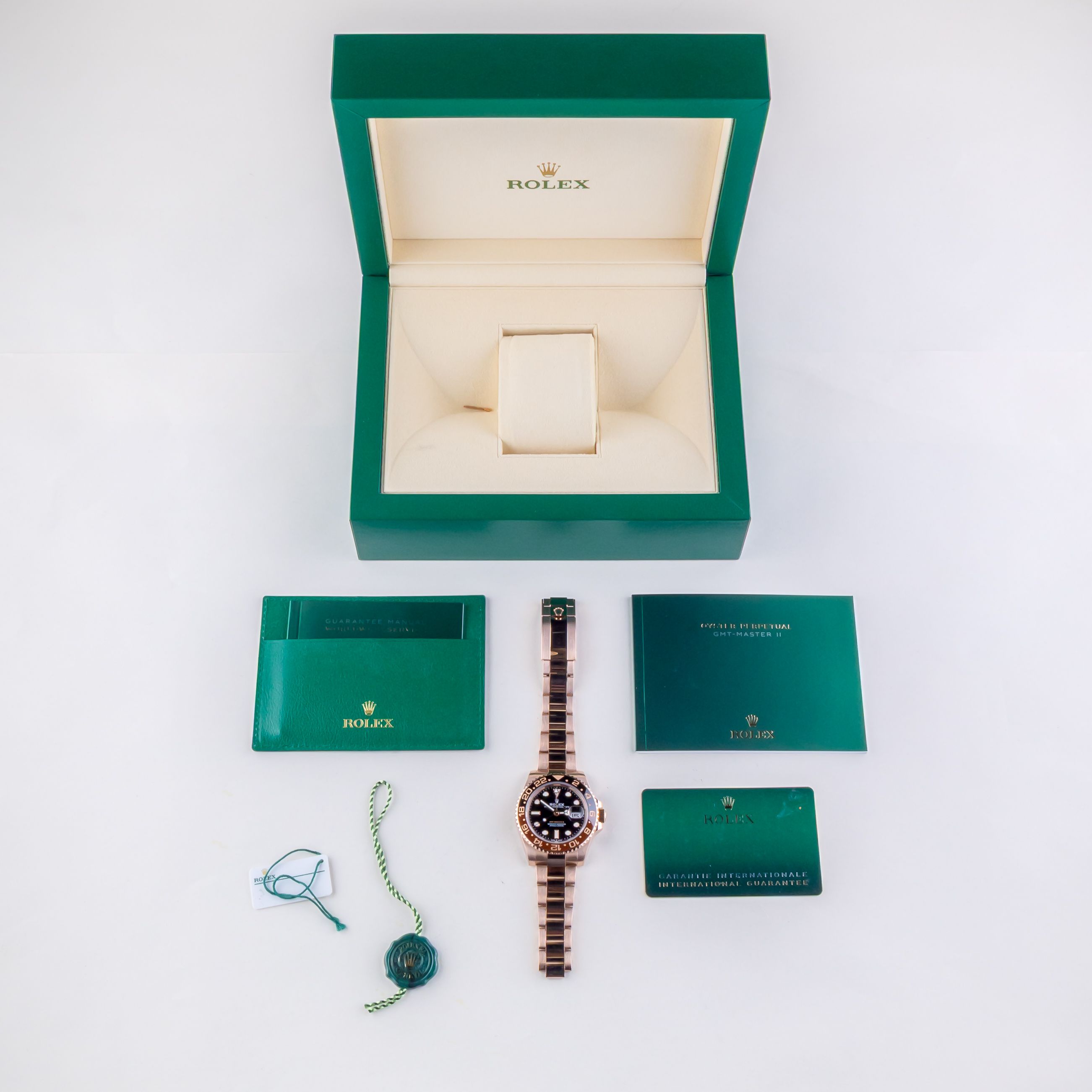 Rolex GMT-Master II référence 126715CHNR de 2023, comprenant l'ensemble complet. Le GMT-Master II 126715CHNR mesure un boîtier en or rose de 40 mm, un bracelet Oyster en or rose avec fermoir Oyster et une lunette en céramique. Le GMT-Master II 126715CHNR est équipé d'un calibre automatique 3285 avec fonction de date rapide, d'un verre saphir résistant aux rayures et d'un cadran noir avec affichage Chromalight.