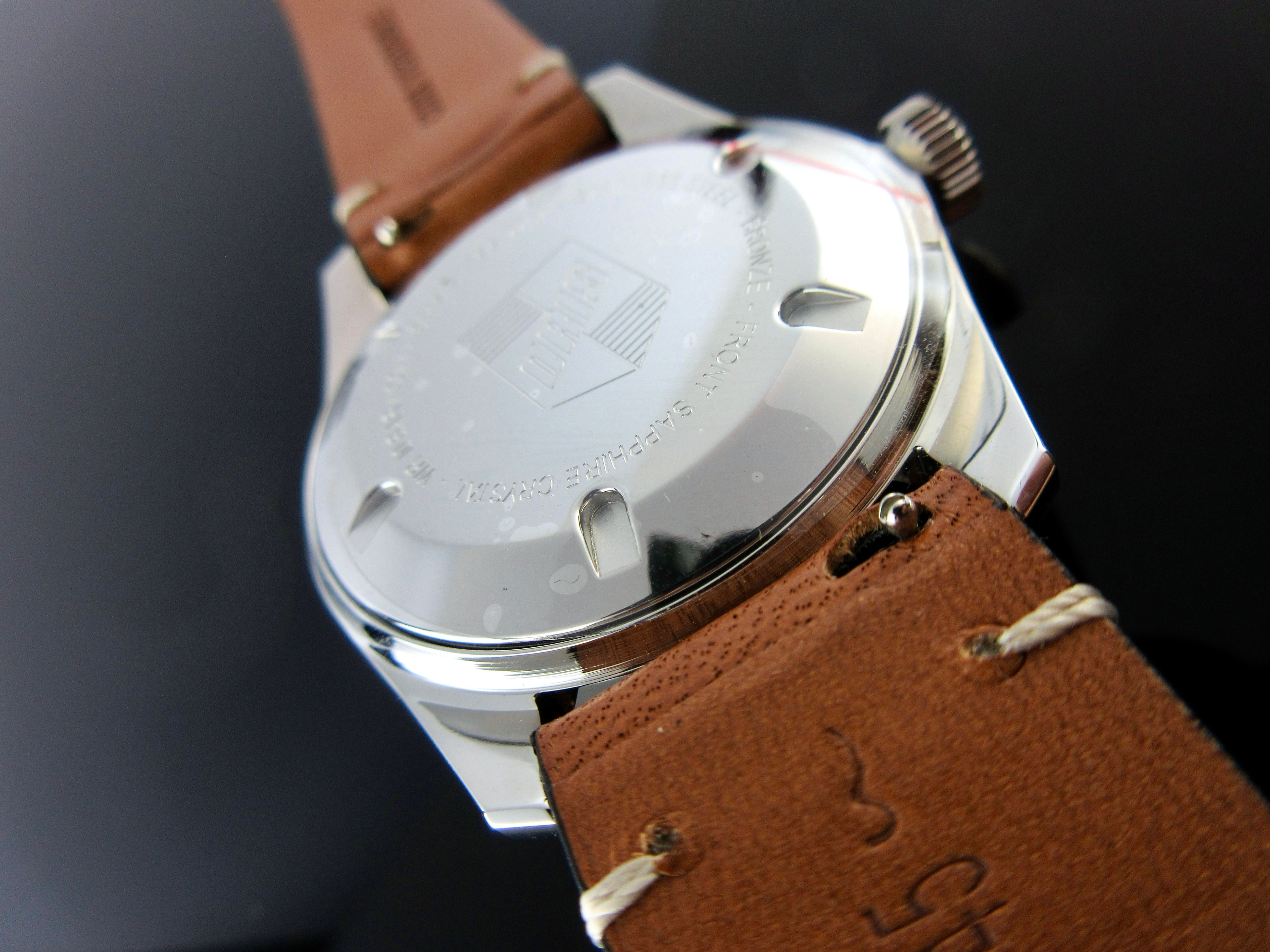 Boîtier en acier/bronze multi-pièces, lunette avec échelle des minutes, saphir, bombé des deux côtés, intérieur antireflet. Acier inoxydable, gravure spéciale, vissé.