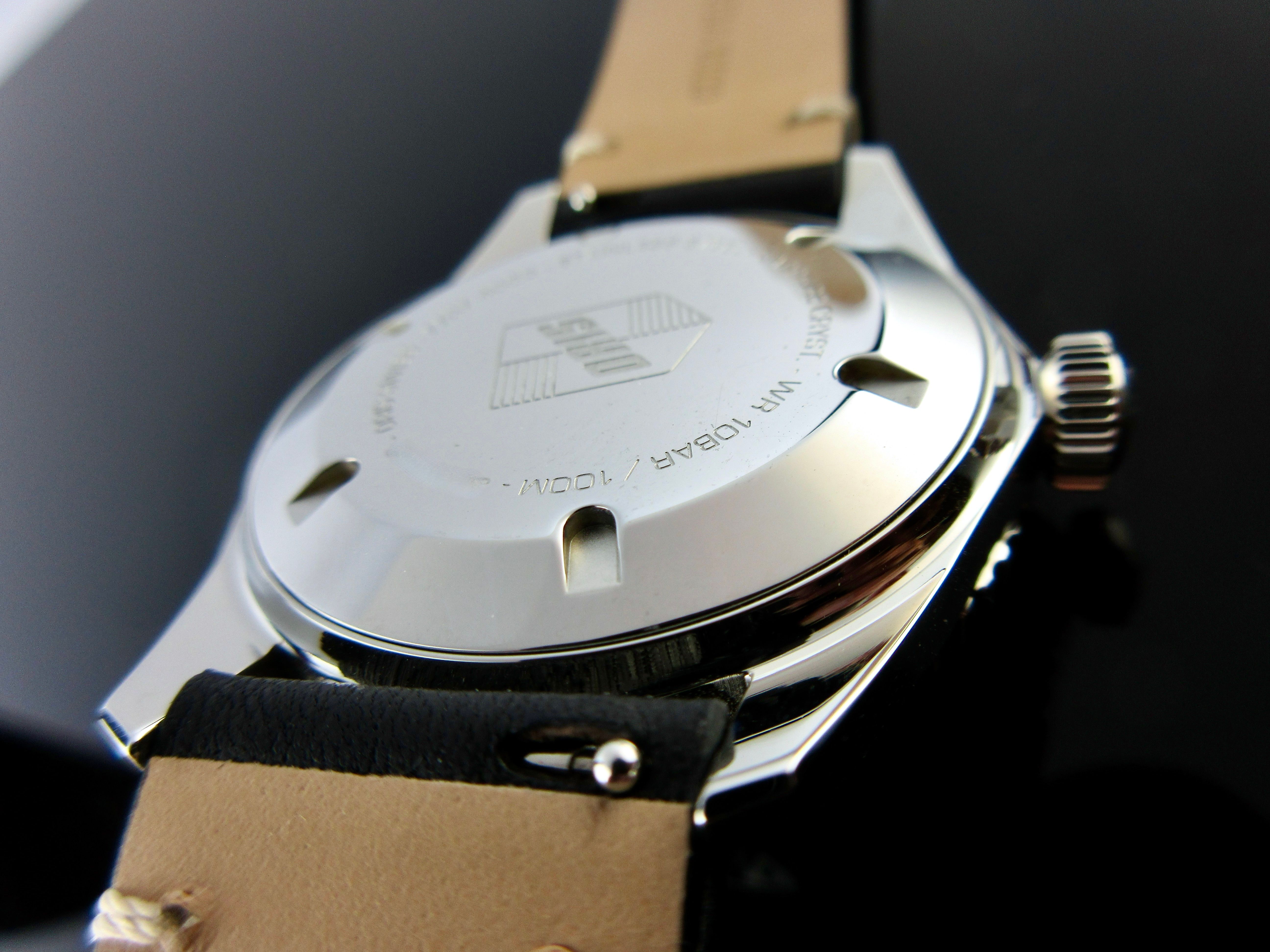 Mehrteiliges Edelstahlgehäuse, Lünette mit Minutenskala, Saphir, beidseitig gewölbt, Innenseite entspiegelt. Edelstahl, Spezialgravur, verschraubt.