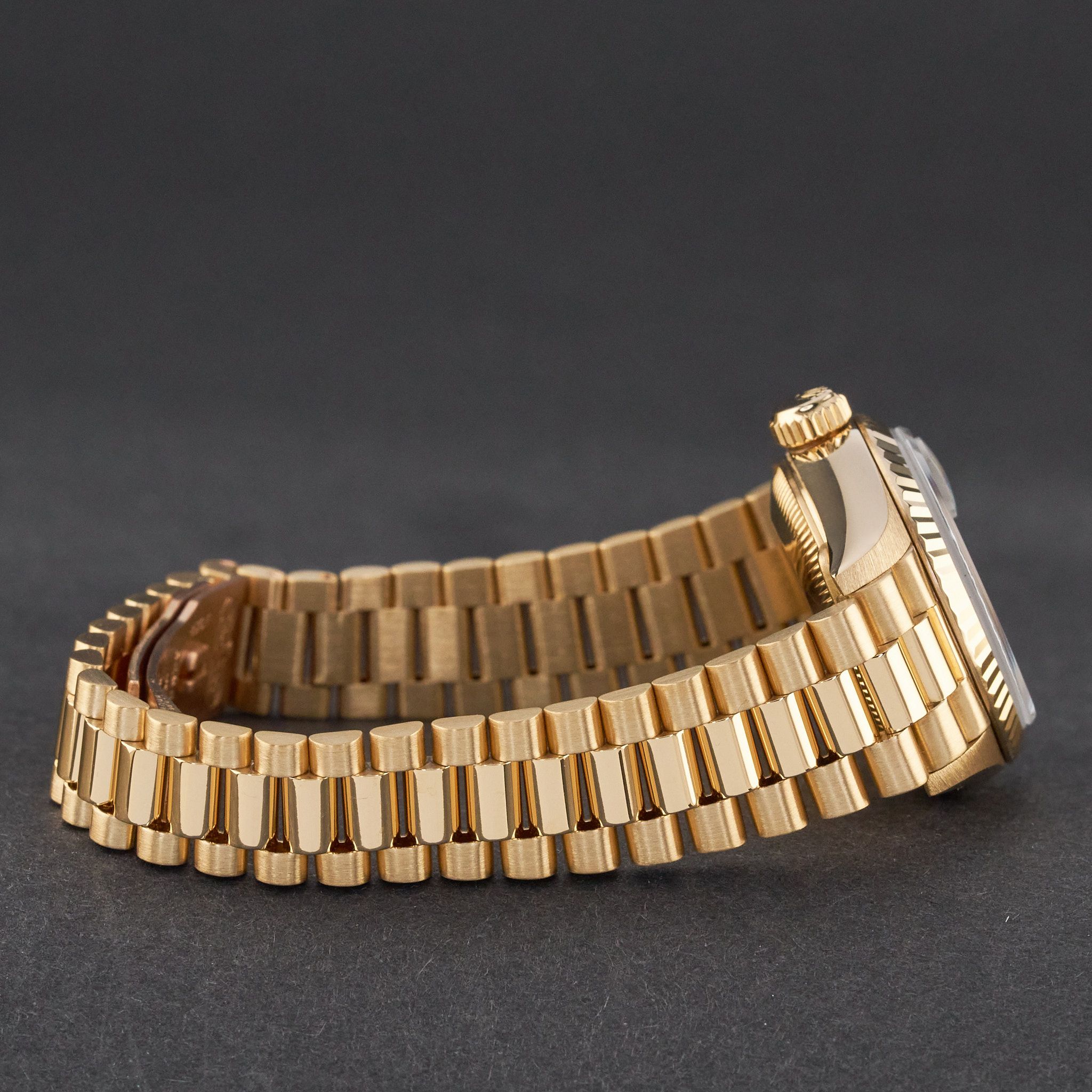 Cette Rolex Lady-Datejust 69178 présente un œil de tigre et est fabriquée en or jaune 18K, avec une année de production de 1986.