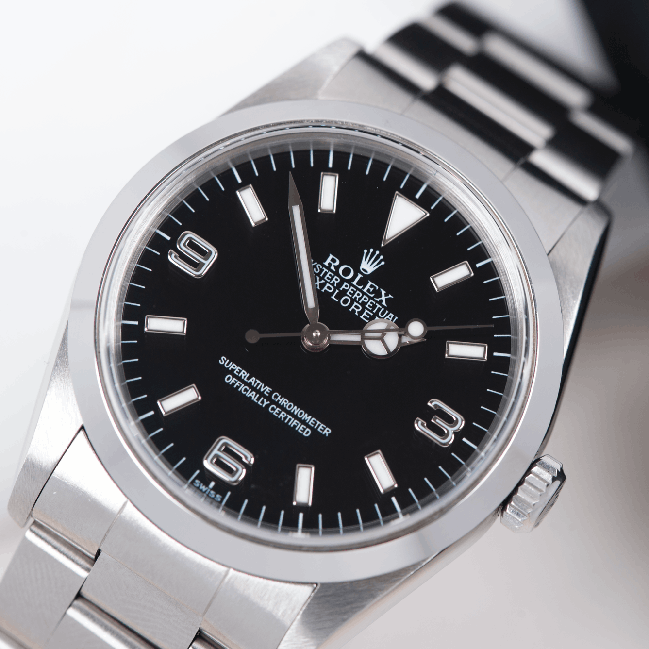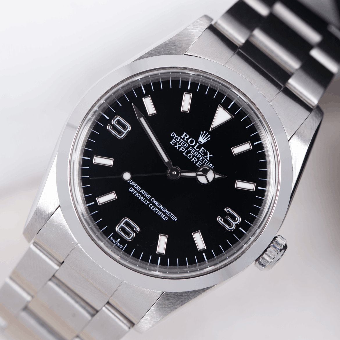 Original Rolex Oyster Perpetual Explorer 14270 Black Dial from 1999. First introduced in 1953, the Rolex Explorer is one of the most iconic models in the Rolex collection. Known for its simple yet rugged design, the 3-6-9 dial makes this watch an ideal companion for adventurers and professionals alike. Whether scaling Mount Everest or attending a business meeting, the Explorer is versatile and reliable.The dial features the signature “Rolex Oyster Perpetual Explorer Superlative Chronometer Officially Certified” text, along with the Swiss Only marking, indicating the use of Luminova in the original 18K white gold hands and hour markers. This Rolex Explorer 14270 is powered by the Rolex 3000 automatic movement and protected by a durable sapphire crystal.