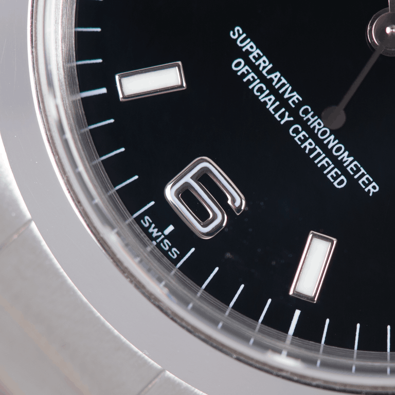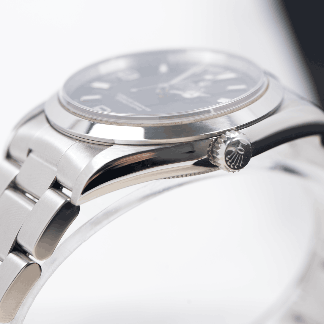 Le cadran arbore le texte signature “Rolex Oyster Perpetual Explorer Superlative Chronometer Officially Certified”, ainsi que la mention Swiss Only, indiquant l'utilisation de Luminova dans les aiguilles et les index en or blanc 18K d'origine. Cette Rolex Explorer 14270 est animée par le mouvement automatique Rolex 3000 et protégée par un verre saphir durable.