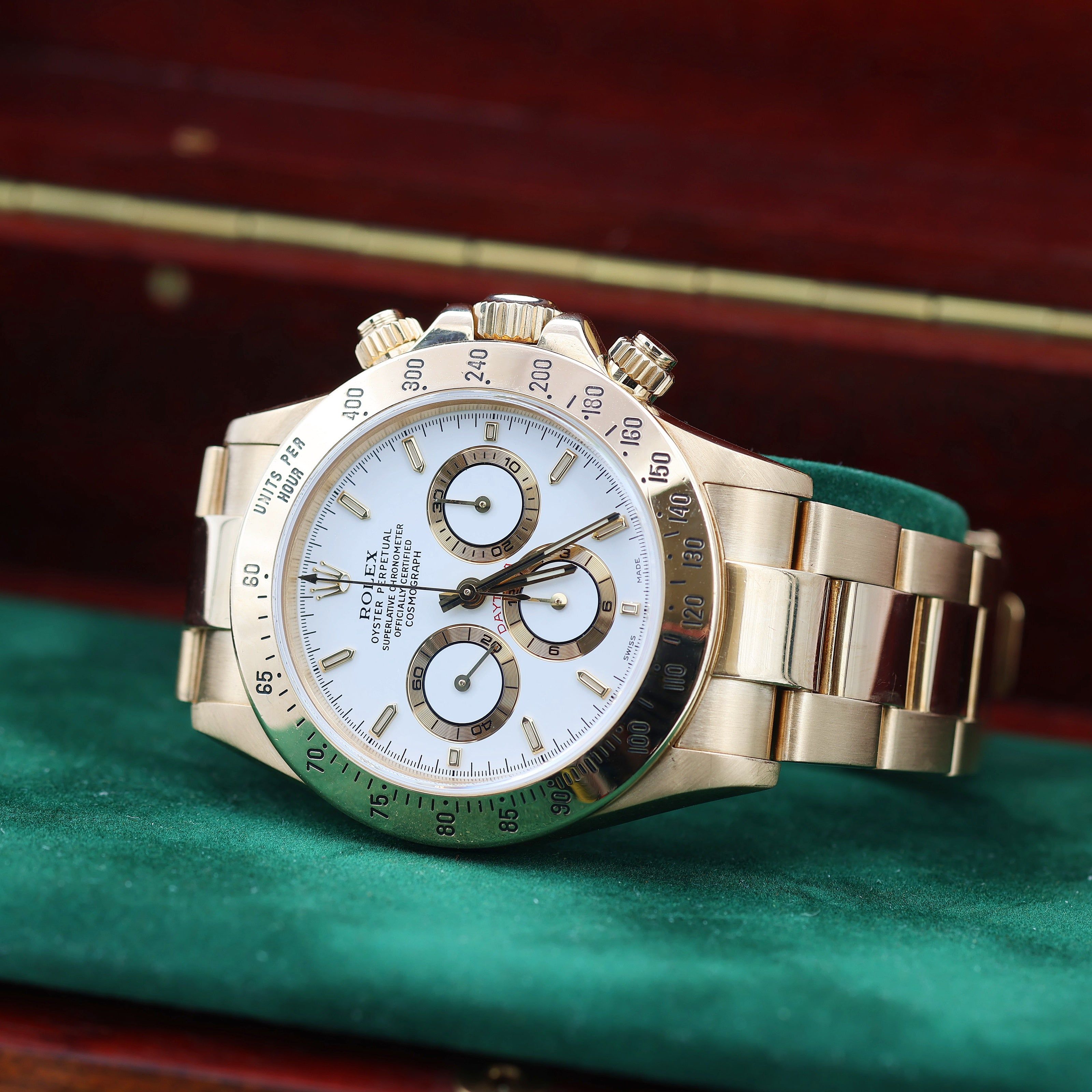 À vendre chez Debonar Watches : Rolex Daytona 16528 d'occasion en excellent état, avec une incroyable cadran blanc. La Rolex Cosmograph Daytona réf. 16528 est une déclaration de luxe, de performance et de design intemporel. Faite en or jaune 18 carats massif, ce chronographe emblématique allie l'héritage de la course de Rolex à une élégance inégalée. Ce modèle présente un magnifique cadran blanc avec des sous-cadrans noirs contrastants qui assurent une excellente lisibilité, tandis que la lunette tachymétrique met en avant l'ADN sportif de la Daytona. Animée par le légendaire mouvement automatique Rolex Calibre 4030 basé sur le Zenith El Primero, la Daytona 16528 offre à la fois précision et valeur de collection. Avec son boîtier Oyster de 40 mm, ses poussoirs vissés et son bracelet Oyster en or jaune 18 carats assorti, elle dégage une présence et un prestige au poignet. MARQUE ROLEX MODÈLE DAYTONA RÉFÉRENCE 16528 MATÉRIAU DU BOÎTIER OR MOUVEMENT AUTOMATIQUE DIMENSION 40 MM CADRAN BLANC LUNETTE OR CRISTAL SAPHIR TYPE DE BRACELET BRACELET MATÉRIAU DU BRACELET OR LONGUEUR DU BRACELET 17 CM BOÎTE D'ORIGINE NON PAPIERS D'ORIGINE NON ANNÉE ENVIRON LES ANNÉES 90 ÉTAT EXCELLENT