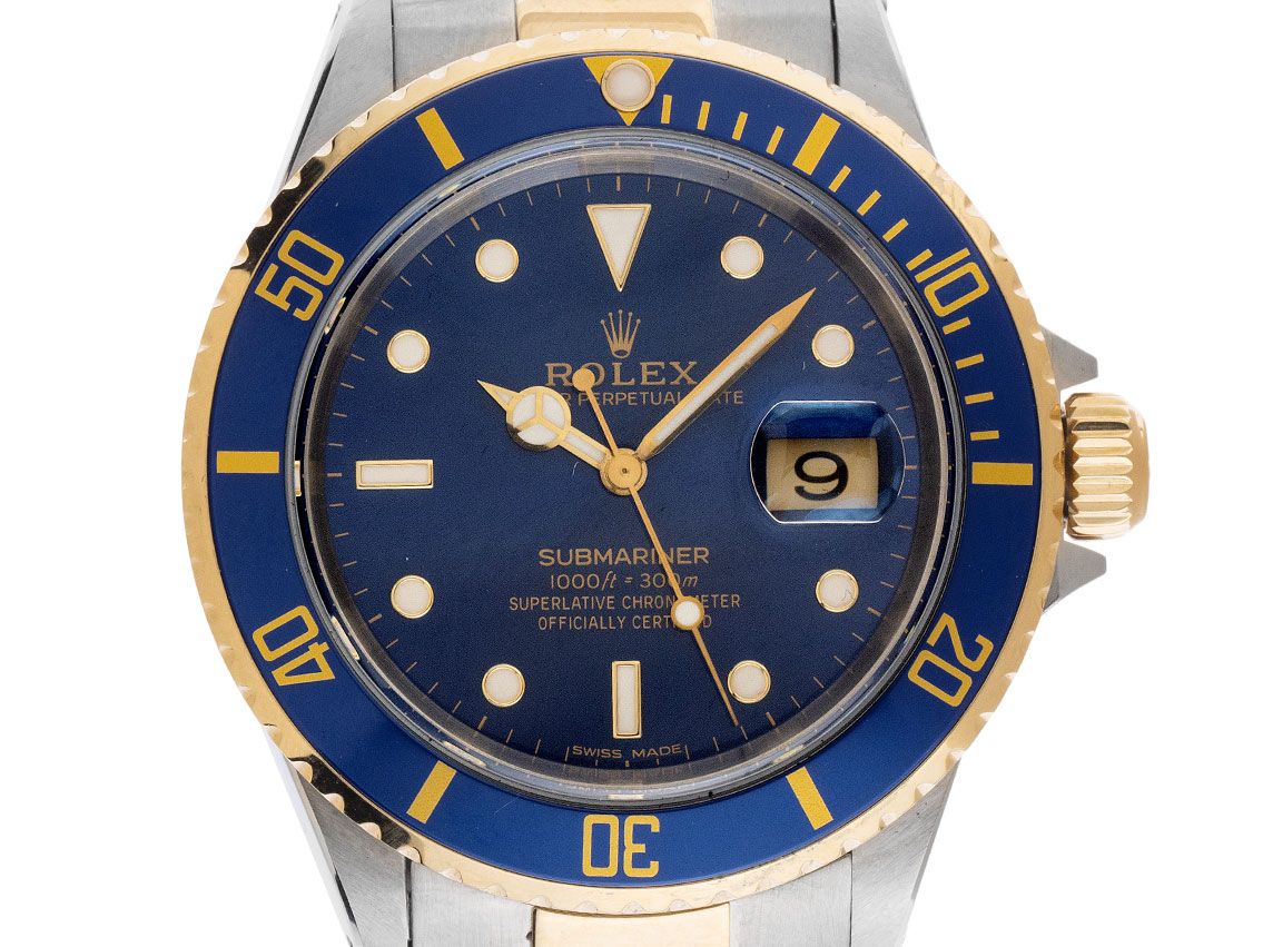 Boîtier en acier poli et satiné, diamètre du boîtier sans couronne 40mm, hauteur du boîtier 12,8mm. Lunette en or jaune 18kt avec insert bleu et échelle de 60 minutes, unidirectionnelle. Bracelet Oyster en acier / or jaune 18kt poli et satiné, fermoir déployant de sécurité en acier avec logo du fabricant. Cadran bleu avec index et points en or jaune appliqués ainsi que des aiguilles en or jaune. Mouvement automatique, chronomètre avec certificat, calibre Rolex 3135 avec 31 rubis. Affichage des heures, minutes et secondes par aiguilles centrales avec stop seconde pour un réglage précis de l'heure, affichage de la date avec réglage rapide sous verre loupe à 3 heures. Verre saphir résistant aux rayures. Couronne vissée avec protection latérale et logo du fabricant. Fond en acier vissé. Poids de la montre y compris le bracelet 146g, longueur du bracelet y compris le boîtier 175mm. Numéro de référence : 16613, numéro de boîtier : M563XXX, année de fabrication : 2007, ID : KB1681210001025H-14600, numéro d'article : 10000082917. Avec contrôle de marche et révision extérieure complète d'octobre 2025. Boîte Rolex d'origine avec carton d'emballage et papiers de garantie de septembre 2010, LC 100 / Allemagne UE ainsi que description, étui en cuir, sceau de chronomètre Rolex, extrait du registre des montres d'octobre 2025, certificat The Watch Register / sans inscription (base de données internationale pour montres perdues ou volées), Full Set. Super affaire, investissement avec potentiel de valorisation, pièce de collection très rare. Comme neuf. Délai de livraison immédiat.