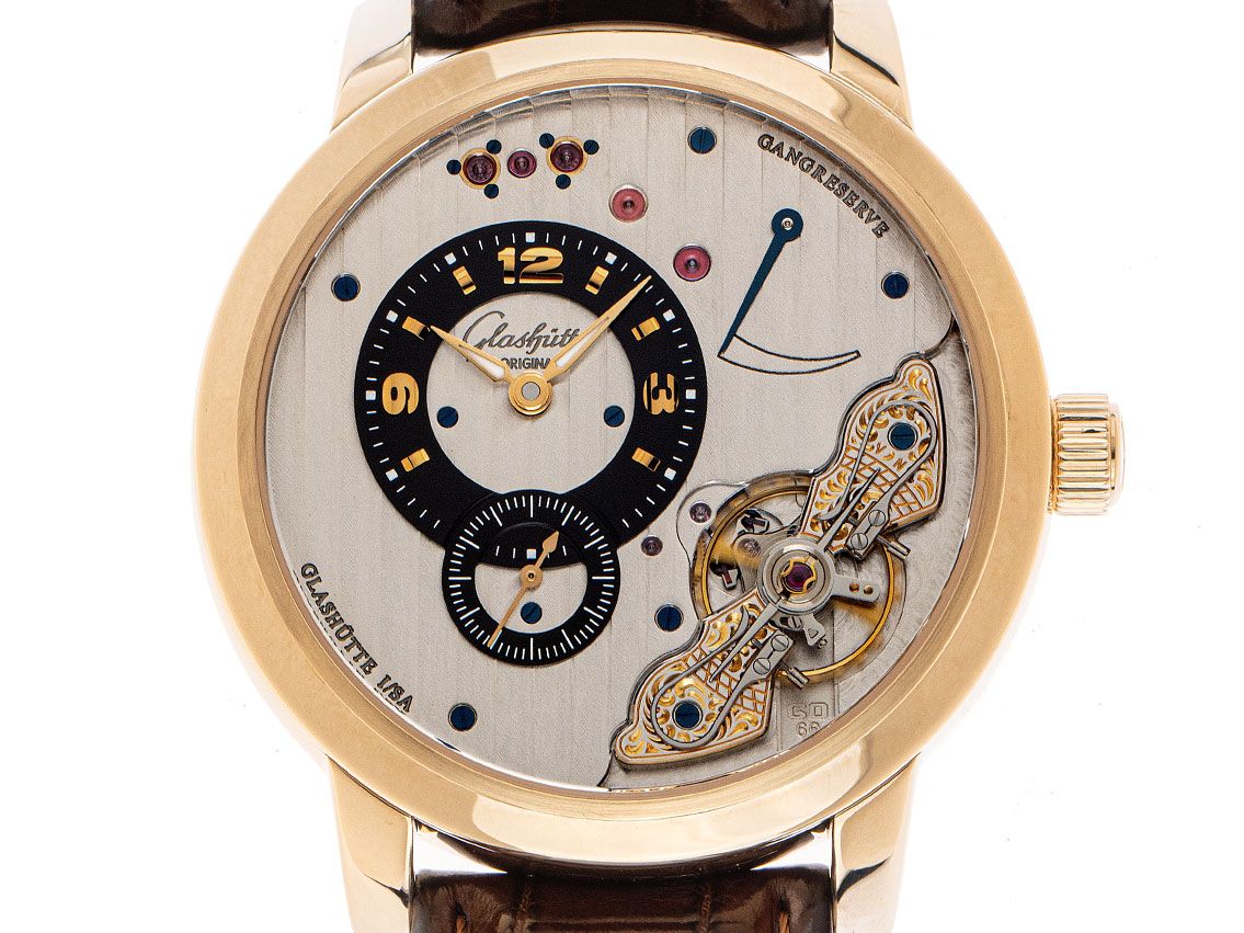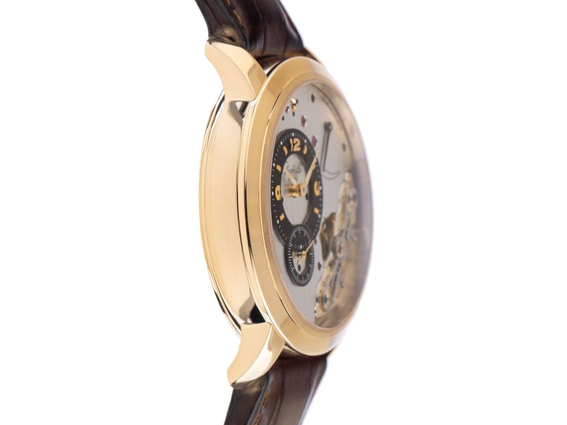 Boîtier en or rose 18kt poli, diamètre du boîtier sans couronne 42mm, hauteur du boîtier 11,7mm. Bracelet en cuir crocodile marron avec couture décorative, largeur de l'attache 20mm, boucle déployante à double sécurité en or rose 18kt avec logo du fabricant. Cadran argenté avec chiffres arabes et index en or rose appliqués ainsi que des aiguilles en or rose. Mouvement remontage manuel, calibre 66-01 avec 31 pierres précieuses. Affichage de l'heure et des minutes décentralisé par aiguilles, petite seconde par aiguille avec stop seconde pour un réglage précis de l'heure entre 7 et 8 heures, affichage de la réserve de marche à 1 heure par aiguille bleue, réglages fins visibles/squelettés à double col de cygne. Verre saphir résistant aux rayures et bombé. Couronne avec logo du fabricant. Fond en or rose 18kt vissé 5 fois et gravé avec fenêtre en verre saphir. Poids de la montre avec bracelet 147g. Numéro de référence : 66-01-01-01-05, numéro de boîtier : 0XXX, ID : P1492180000925H-20500, numéro d'article : 10000082217. Avec contrôle du mouvement et révision extérieure complète de septembre 2025. Boîte Glashütte Original avec carton d'emballage et extrait du Watch Register de septembre 2025, certificat The Watch Register / sans inscription (base de données internationale pour montres perdues ou volées). Investissement avec potentiel d'appréciation. Comme neuf. Délai de livraison immédiat.