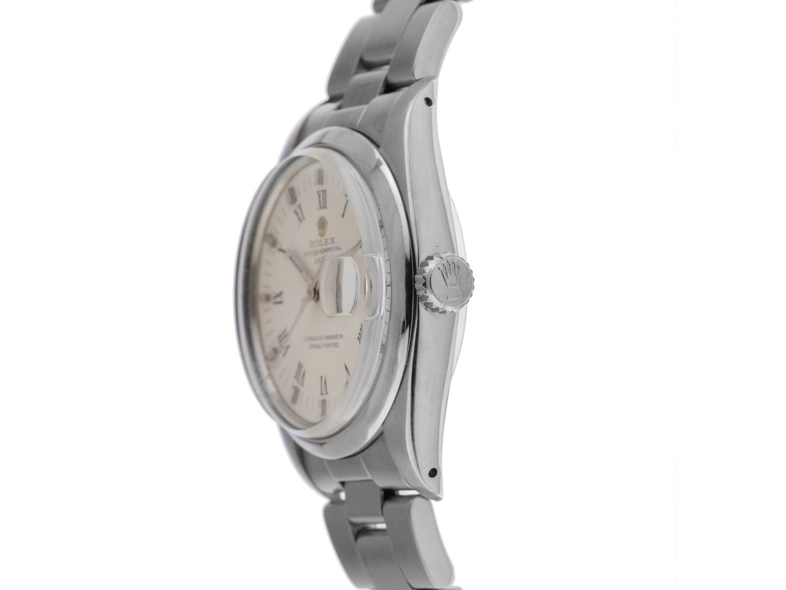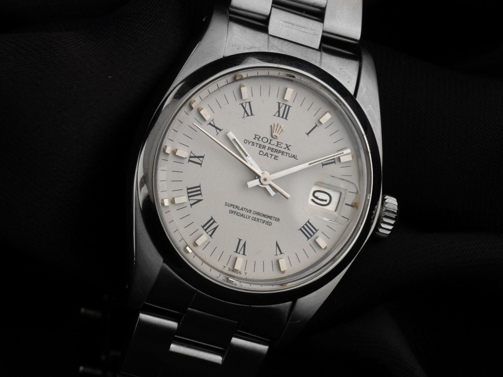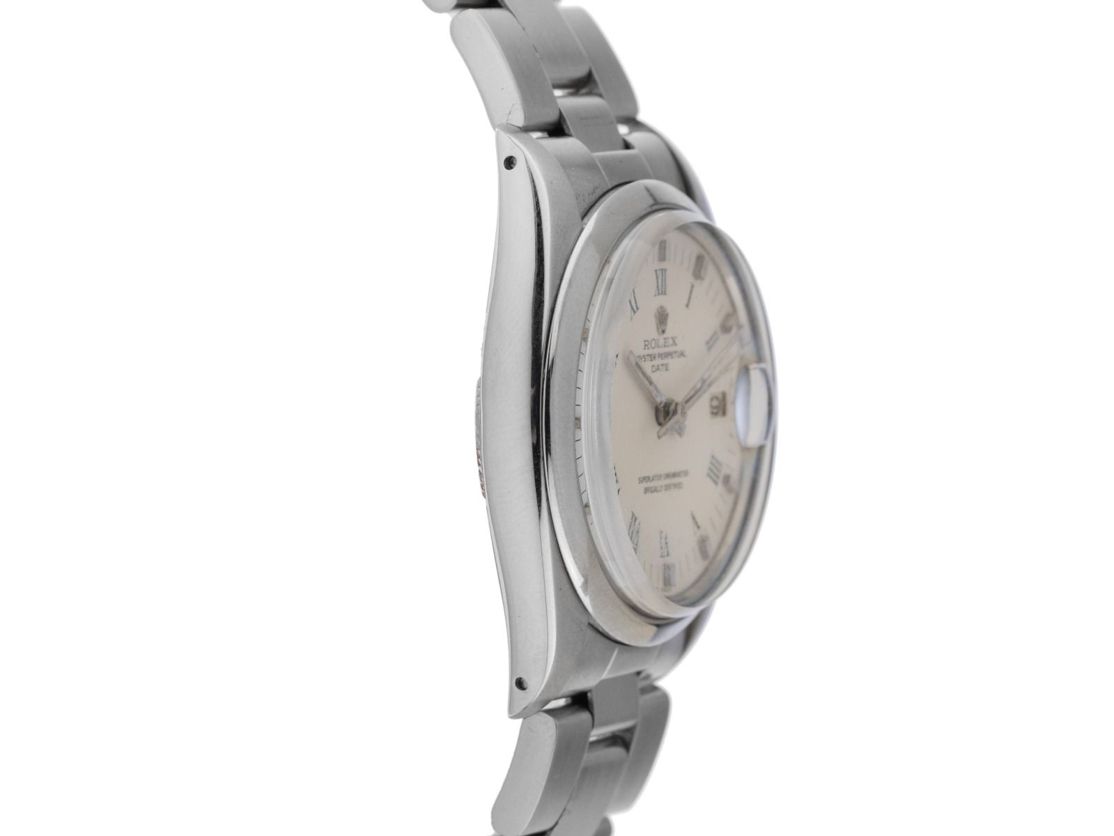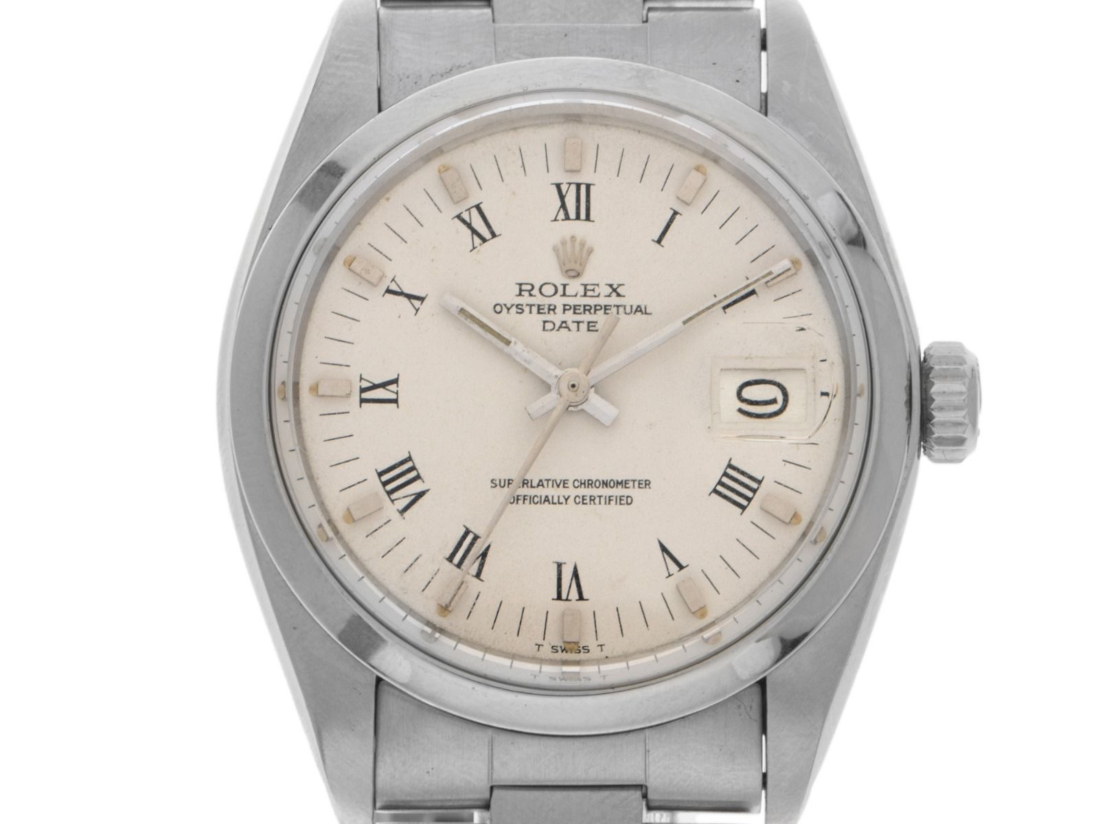 Rolex Oyster Perpetual Date Stahl Automatik Armband OysterGehäuse Edelstahl poliert und satiniert, Gehäusedurchmesser ohne Krone 34mm, Gehäusehöhe 12,5mm. Lünette Edelstahl glatt und poliert. Armband Oyster Edelstahl poliert und satiniert, Rolex Faltschließe Edelstahl mit Hersteller-Logo. Zifferblatt weiß mit schwarzen römischen Ziffern und weißgoldenen Zeigern. Uhrwerk Automatik, Chronometer, Rolex Manufakturkaliber 1570 mit 26 Edelsteinen. Anzeige von Stunde, Minute und Sekunde über Zeiger aus der Mitte mit Sekundenstopp zur sekundengenauen Einstellung der Uhrzeit, Datumsanzeige unter Glaslupe bei 3 Uhr, open 6/9 (offene 6 und 9 in der Datumsanzeige). Plexiglas. Krone verschraubbar mit Hersteller-Logo. Boden Edelstahl verschraubt. Gewicht der Uhr inklusive Armband 86g, Länge des Armbandes inklusive Gehäuse 190mm. Referenznummer: 1500, Baujahr: Gehäusenummer: 6478XXX, Baujahr: 1980, ID: P182760001025H-6800, Artikelnummer: 10000082943. Mit Gangkontrolle und kompletter äußerlicher Aufarbeitung von November 2025. Original Rolex Box mit Umkarton und Beschreibung, Ledermäppchen, Übersetzungsheft, Rolex Chronometer-Siegel sowie Watchregister Auszug von November 2025, The Watch Register Zertifikat / ohne Eintrag (Internationale Datenbank für verlorene oder gestohlene Uhren), Full Set. Kapitalanlage mit Wertsteigerungspotenzial, sehr seltenes Sammlerstück. Sehr guter Zustand. Lieferzeit sofort.