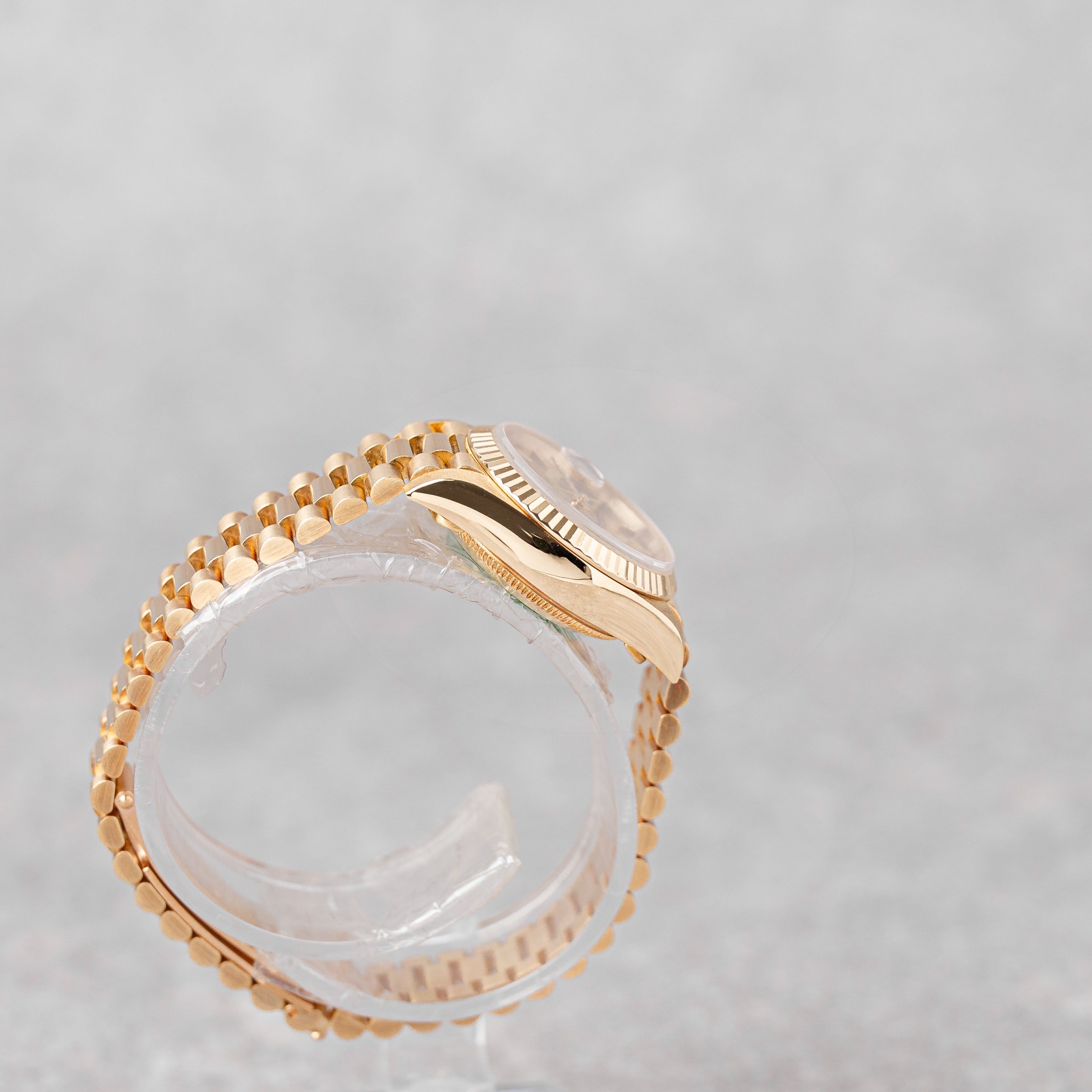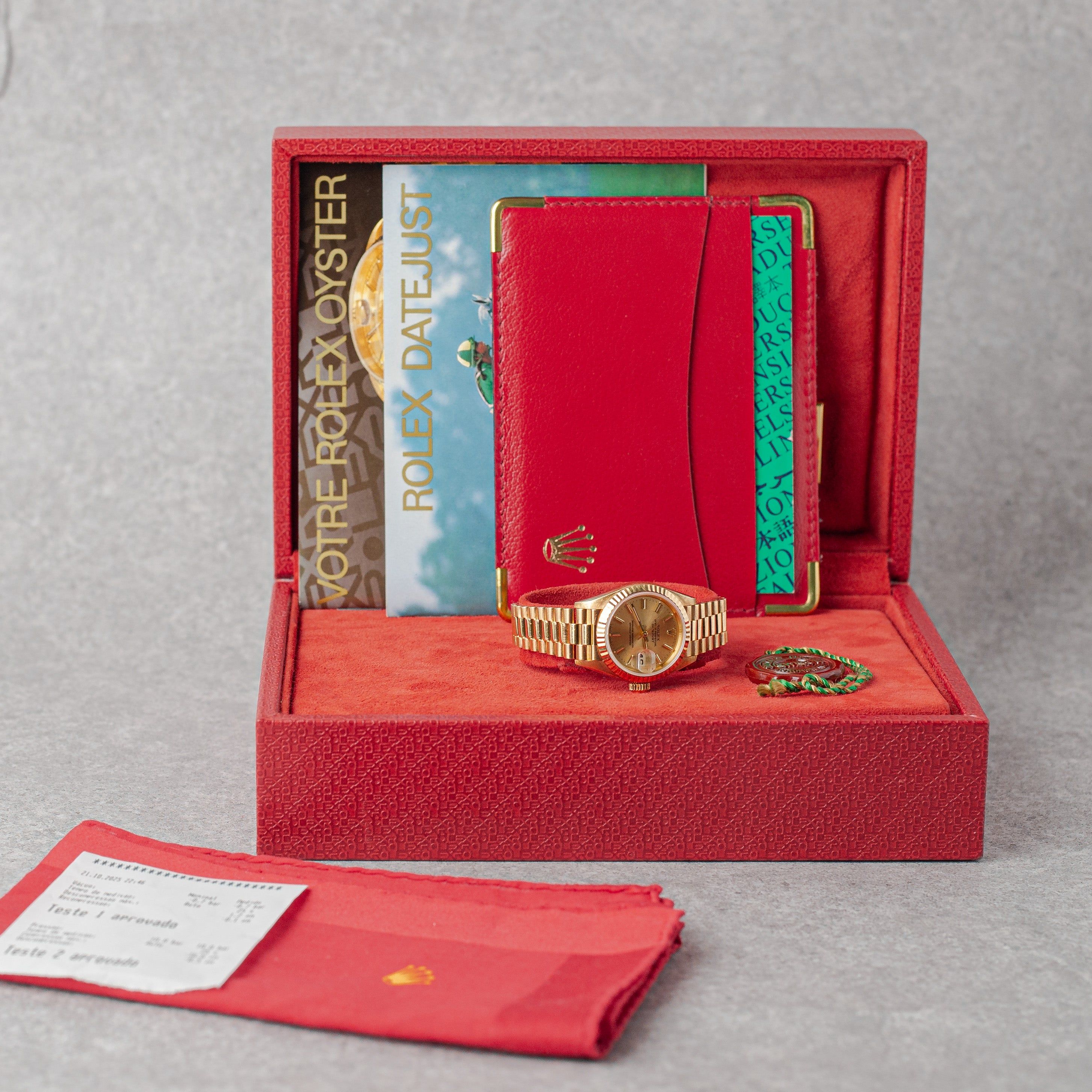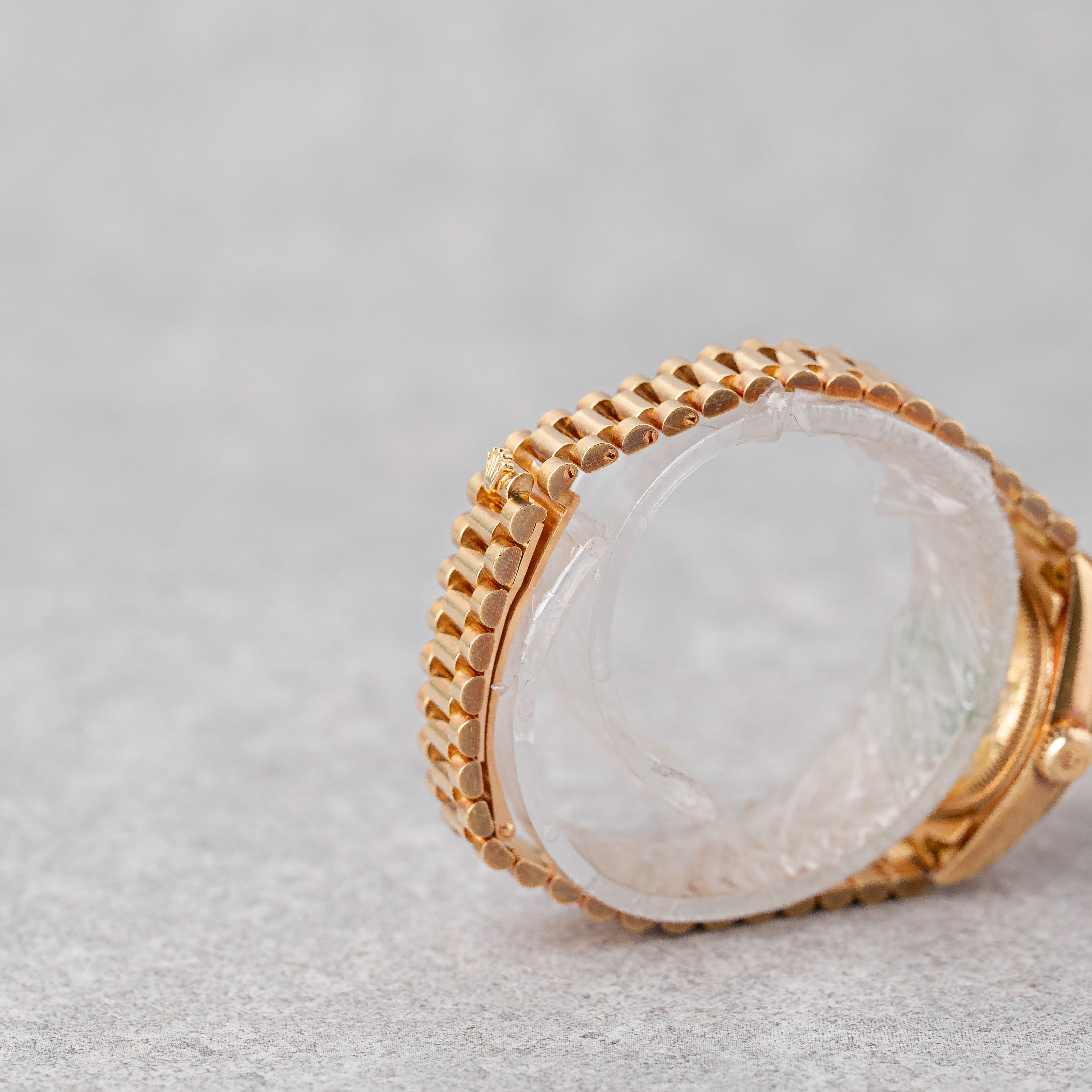 A timeless symbol of elegance, this Rolex Lady-Datejust 26 in 18k yellow gold features a classic champagne dial, exuding warmth and sophistication. Delivered as a Full Set, the watch remains unpolished, preserving its original shape, with a tight President bracelet showing no stretch and in excellent overall condition. It has been fully serviced by our watchmaker in 11/2025 and comes ready to wear. a beautiful example of Rolex craftsmanship and enduring luxury.