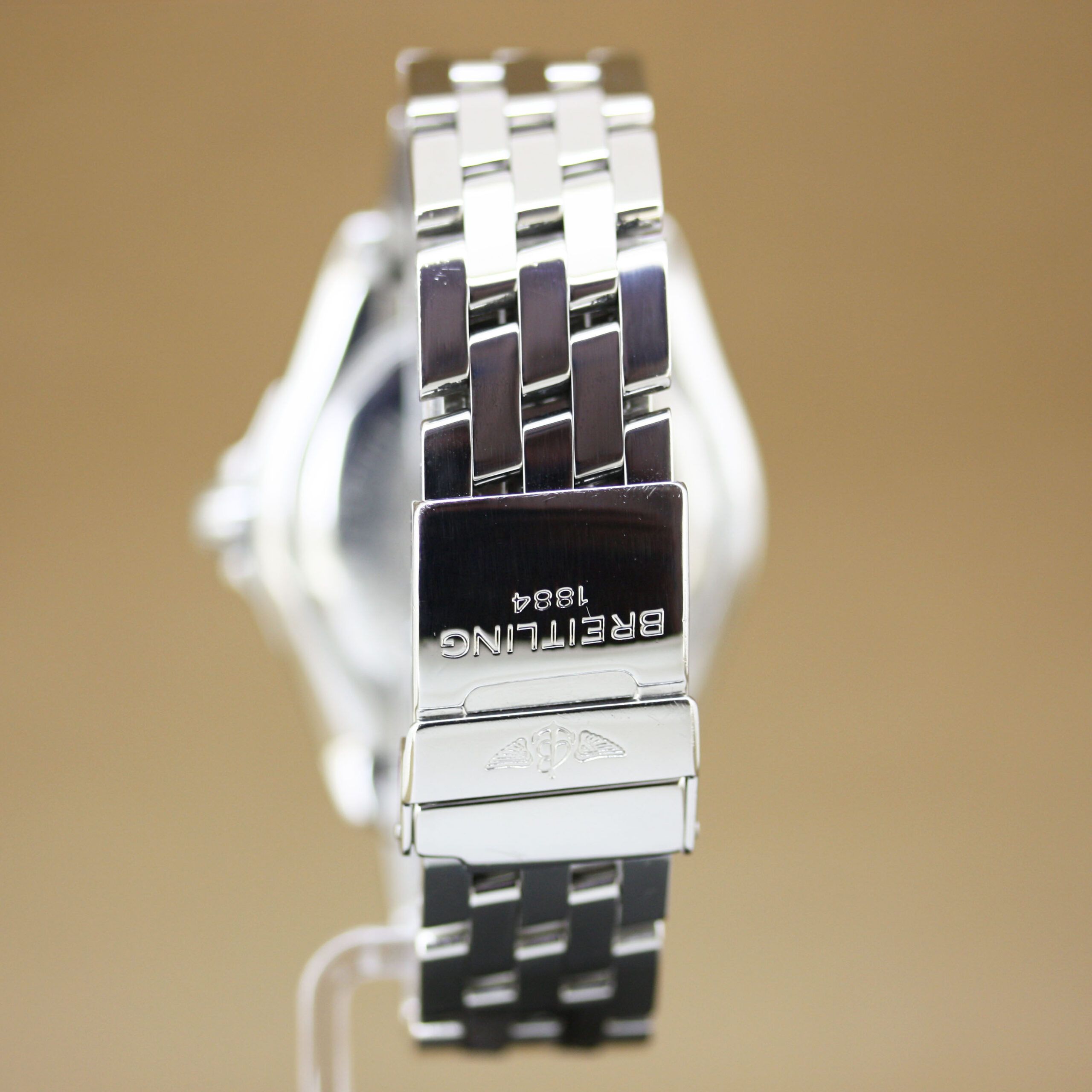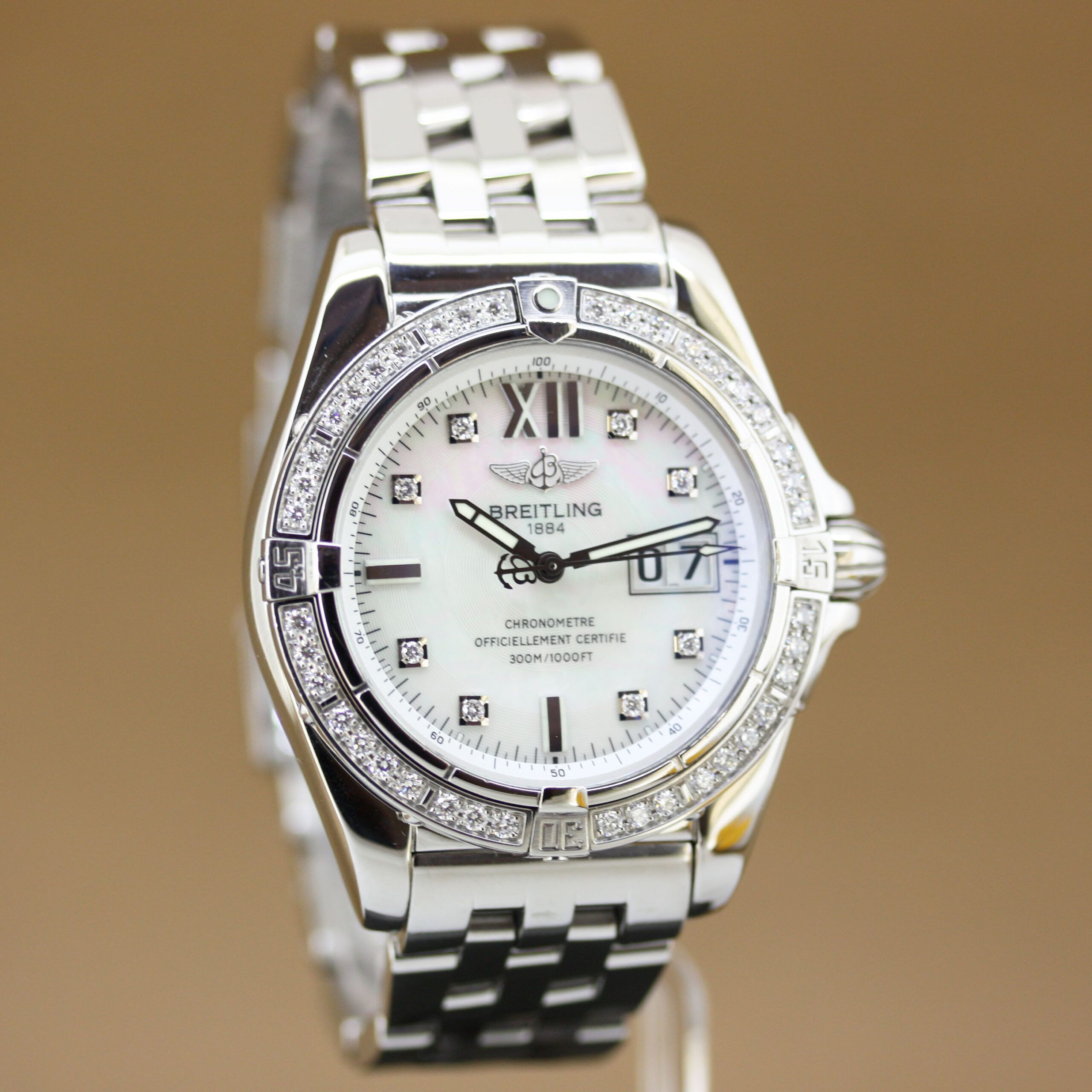 Breitling Galactic 41 – Ref. A49350 This stunning Breitling Galactic 41 is in excellent condition, perfectly combining luxury with sportiness.The watch features a stainless steel case and a bezel richly set with natural diamonds in original factory setting. The elegant white mother-of-pearl dial, also adorned with diamond indexes, gives this timepiece a refined and exclusive look. The stainless steel Pilot bracelet with folding clasp ensures both comfort and style. Powered by a reliable automatic movement with date function, this watch delivers both precision and durability, as expected from Breitling. Features & Scope of Delivery:✔ Reference: A49350✔ Case: Stainless steel✔ Bezel: Set with natural diamonds (original factory setting)✔ Dial: White mother-of-pearl with diamond indexes✔ Bracelet: Stainless steel Pilot bracelet with folding clasp✔ Movement: Automatic with date function✔ Diameter: 41 mm✔ Condition: Excellent✔ Delivered with Breitling travel case, certificate of authenticity & valuation report A remarkable Breitling Galactic 41 that perfectly blends elegance and sportiness.