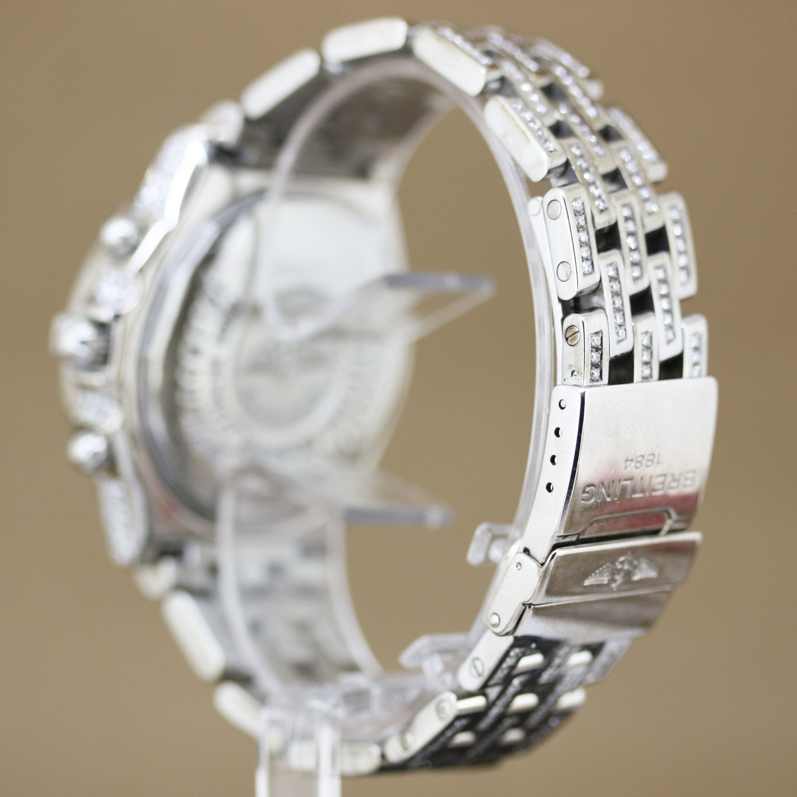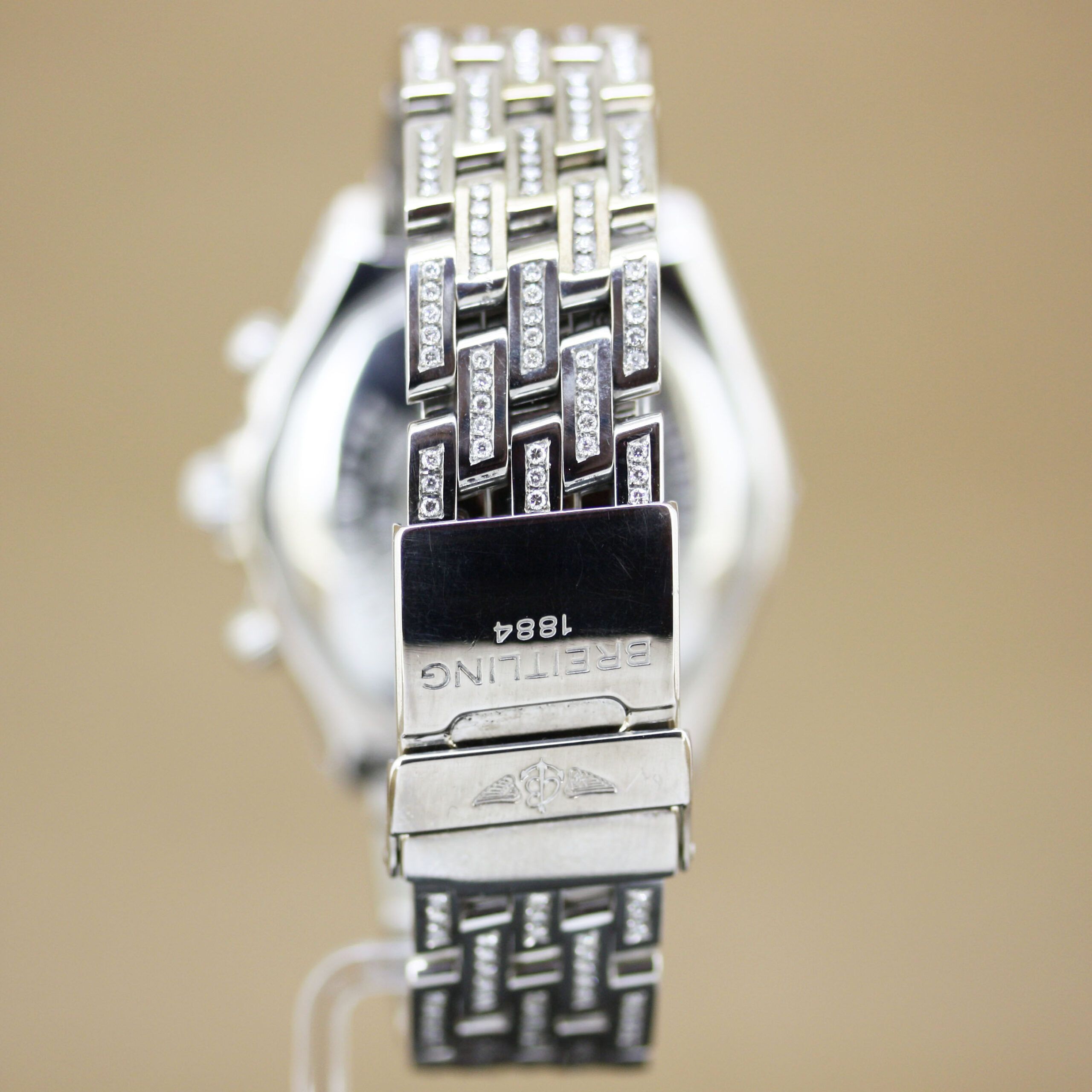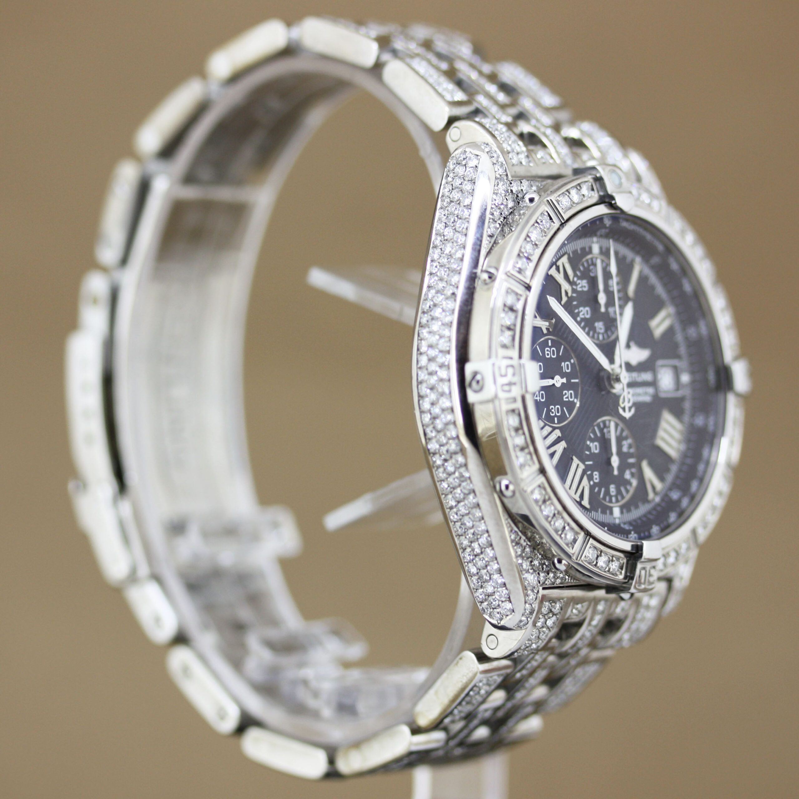 Breitling Crosswind A13355 en très bon état, équipée d'un boîtier et d'une lunette entièrement sertis de diamants. La montre a un cadran noir avec des chiffres romains. Ce modèle dispose d'un mouvement automatique avec fonction date et chronographe. Ce Crosswind est équipé d'un bracelet pilote serti de diamants avec boucle déployante. La montre est livrée avec sa boîte et ses papiers. (environ 600 diamants au total)