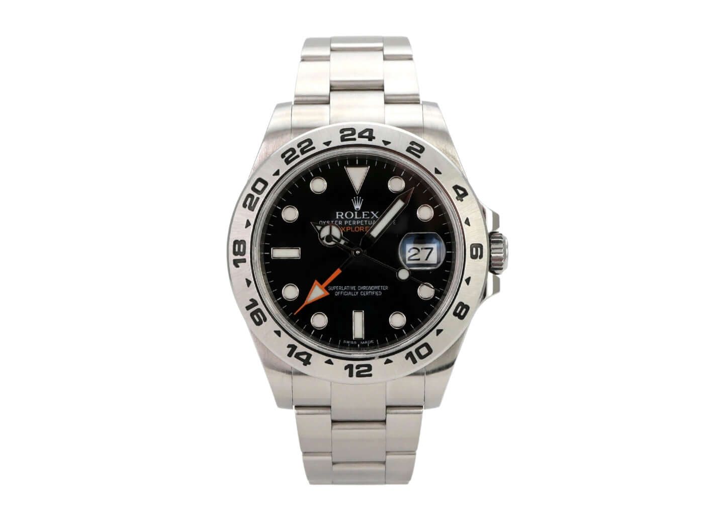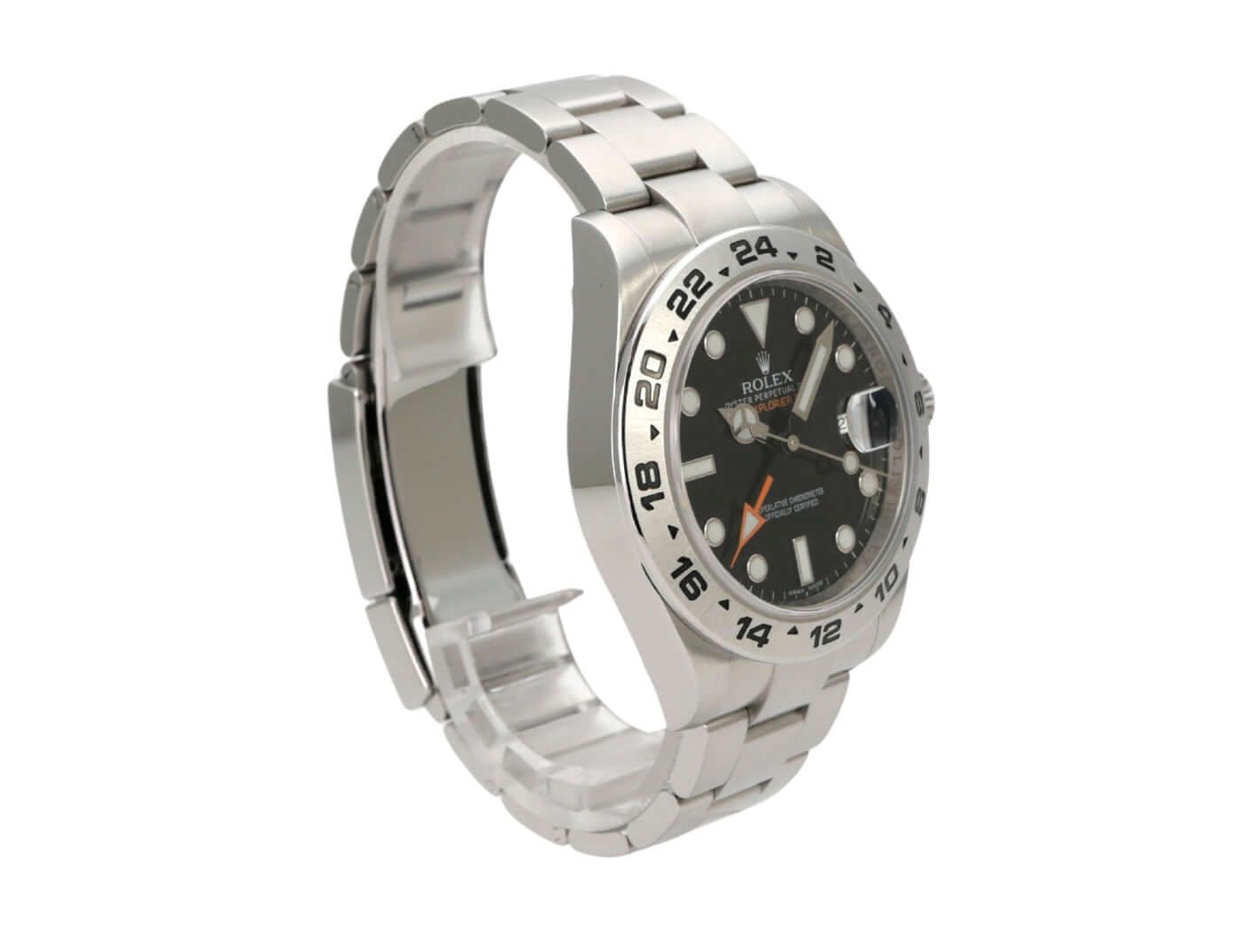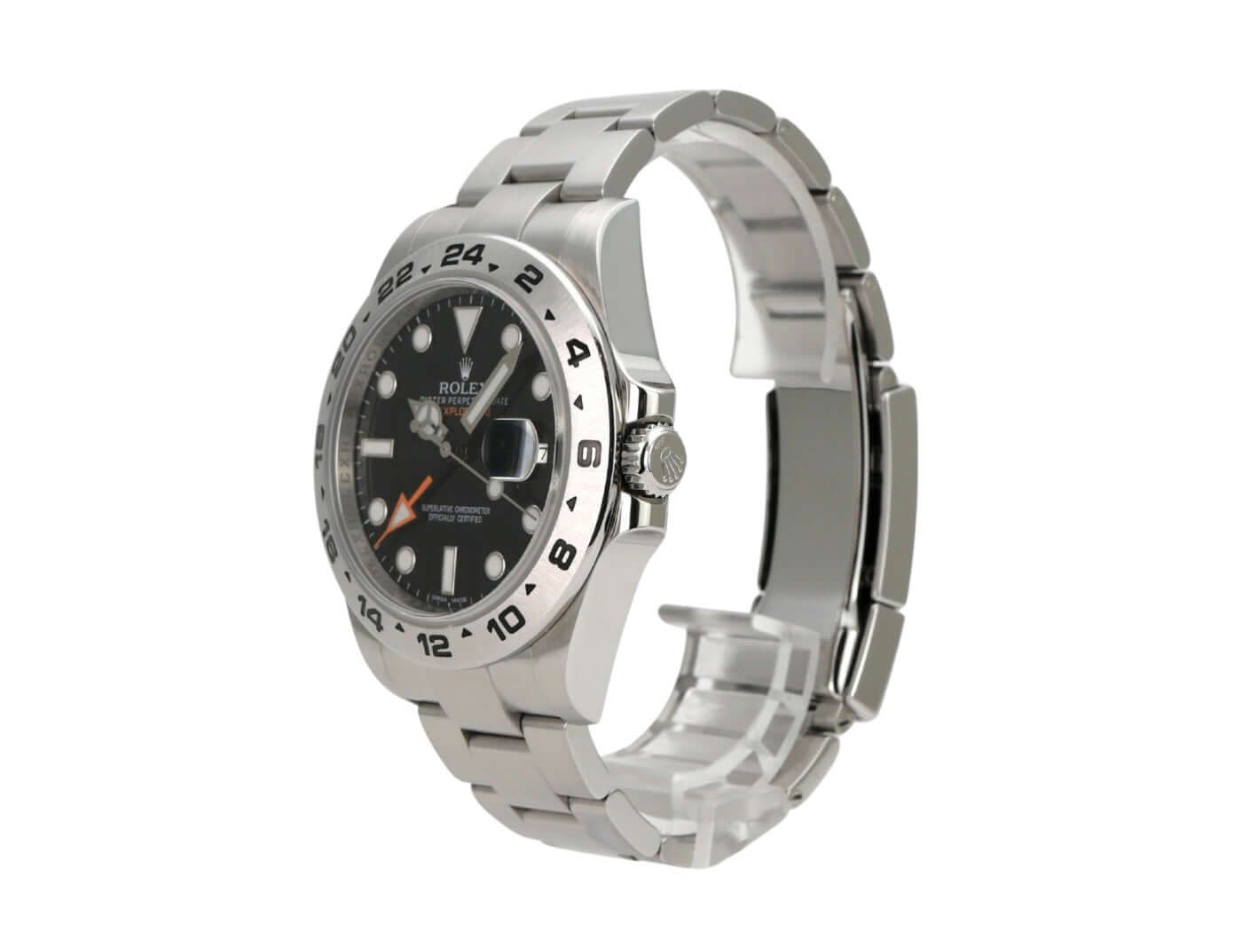 Rolex Explorer II 42 stainless steel Ref. 216570 black dialPolished and satin-finished stainless steel case, case diameter 42 mm, case height 12.5 mm, satin-finished stainless steel bezel with 24-hour scale, satin-finished Oyster stainless steel bracelet with safety folding clasp, black dial with applied luminous indices and luminous dots, luminous hands, automatic movement, Rolex manufacture caliber 3187 with 31 jewels, 28,800 A/h, date display, second time zone, chronometer, screw-down crown with flank protection, sapphire crystal, screwed stainless steel back, water-resistant up to 10 bar.