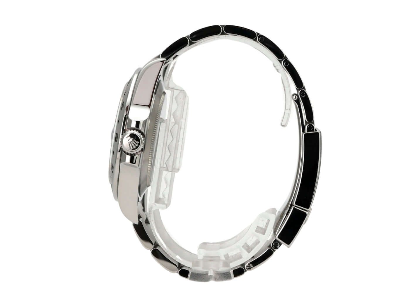 Boîtier en acier inoxydable poli et satiné, diamètre du boîtier 42 mm, hauteur du boîtier 12,5 mm, lunette en acier inoxydable satinée avec échelle 24 heures, bracelet Oyster en acier inoxydable satiné avec fermoir déployant de sécurité, cadran noir avec index lumineux appliqués et points lumineux, aiguilles lumineuses, mouvement automatique, calibre Rolex 3187 avec 31 rubis, 28 800 A/h, affichage de la date, deuxième fuseau horaire, chronomètre, couronne vissée avec protection latérale, verre saphir, fond en acier inoxydable vissé, étanche jusqu'à 10 bars.