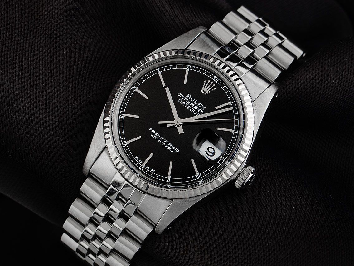 Boîtier en acier poli et satiné, diamètre du boîtier sans couronne 36mm, hauteur du boîtier 13,0mm. Lunette en or blanc 18kt striée et polie. Bracelet Jubilé en acier poli et satiné, boucle déployante en acier avec logo du fabricant. Cadran noir avec index en or blanc appliqués et aiguilles en or blanc. Mouvement automatique, chronomètre, calibre de manufacture Rolex 3035 avec 27 pierres précieuses. Affichage des heures, minutes et secondes par aiguilles centrales avec stop-seconde pour un réglage précis de l'heure, affichage de la date avec réglage rapide sous verre loupe à 3 heures avec 6/9 ouvert (6 et 9 ouverts dans l'affichage de la date). Verre acrylique bombé. Couronne vissée avec logo du fabricant. Fond en acier vissé. Poids de la montre incluant le bracelet 86g, longueur du bracelet incluant le boîtier 170mm. Numéro de référence : 16014, numéro de boîtier : 8041XXX, ID : P187682001125H-8700, année de fabrication : 1983, numéro d'article : 10000083112. Avec contrôle de marche et remise en état extérieure de novembre 2025. Boîte Rolex d'origine et description ainsi que pochette en cuir, livret de traduction, certificat de chronomètre Rolex et carte de service de décembre 2020 ainsi qu'extrait du registre des montres de novembre 2025, certificat The Watch Register / sans inscription (base de données internationale pour montres perdues ou volées). Investissement avec potentiel de valorisation, pièce de collection rare. Très bon état. Délai de livraison immédiat.