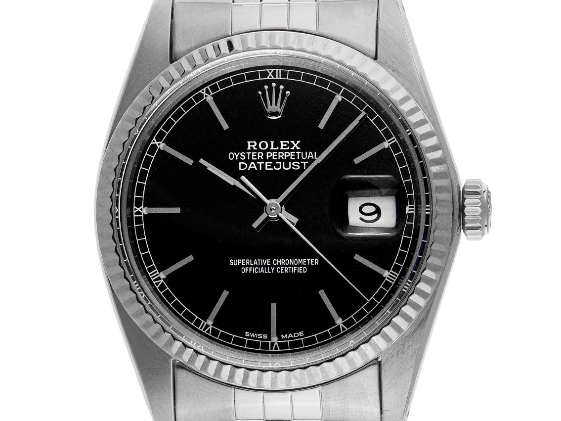 Rolex Datejust Stahl 18kt Weißgold Automatik Armband JubiléGehäuse Edelstahl poliert und satiniert, Gehäusedurchmesser ohne Krone 36mm, Gehäusehöhe 13,0mm. Lünette 18kt Weißgold geriffelt und poliert. Armband Jubilé Edelstahl poliert und satiniert, Faltschließe Edelstahl mit Hersteller-Logo. Zifferblatt schwarz mit aufgesetzten weißgoldenen Indexen und weißgoldenen Zeigern. Uhrwerk Automatik, Chronometer, Rolex Manufakturkaliber 3035 mit 27 Edelsteinen. Anzeige von Stunde, Minute und Sekunde über Zeiger aus der Mitte mit Sekundenstopp zur sekundengenauen Einstellung der Uhrzeit, Datumsanzeige mit Schnellverstellung unter Glaslupe bei 3 Uhr mit open 6/9 (offene 6 und 9 in der Datumsanzeige). Plexiglas gewölbt. Krone verschraubbar mit Hersteller-Logo. Boden Edelstahl verschraubt. Gewicht der Uhr inklusive Armband 86g, Länge des Armbandes inklusive Gehäuse 170mm. Referenznummer: 16014, Gehäusenummer: 8041XXX, ID: P187682001125H-8700, Baujahr: 1983, Artikelnummer: 10000083112. Mit Gangkontrolle und äußerlicher Aufarbeitung von November 2025. Original Rolex Box und Beschreibung sowie Ledermäppchen, Übersetzungsheft, Rolex Chronometer-Siegel und Service Card von Dezember 2020 sowie Watchregister Auszug von November 2025, The Watch Register Zertifikat / ohne Eintrag (Internationale Datenbank für verlorene oder gestohlene Uhren). Kapitalanlage mit Wertsteigerungspotential, seltenes Sammlerstück. Sehr guter Zustand. Lieferzeit sofort.