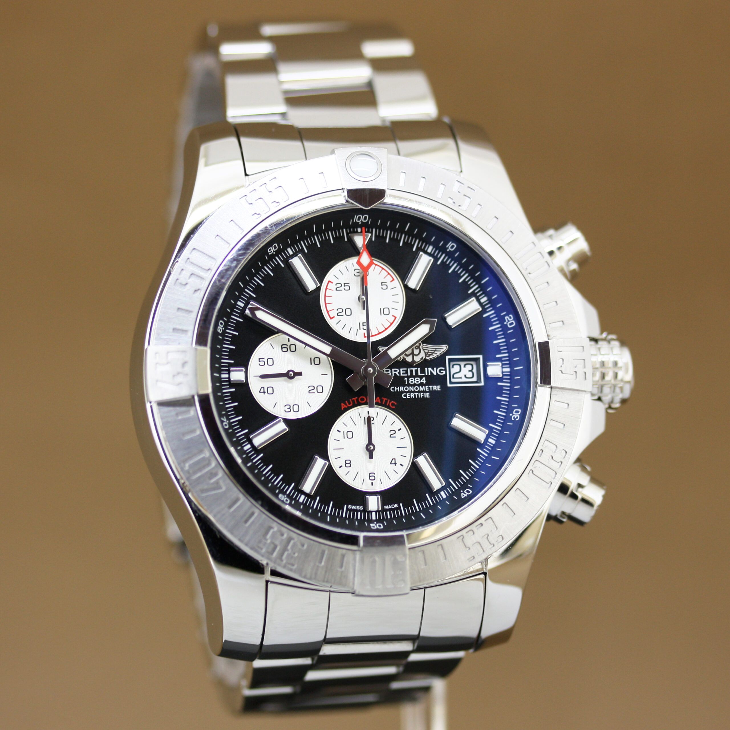 For sale: a Breitling Super Avenger II Chronograph, reference A13371, in very good condition.This bold and impressive model features a stainless-steel case and a black dial with silver chronograph subdials, giving the watch a powerful and sporty appearance.