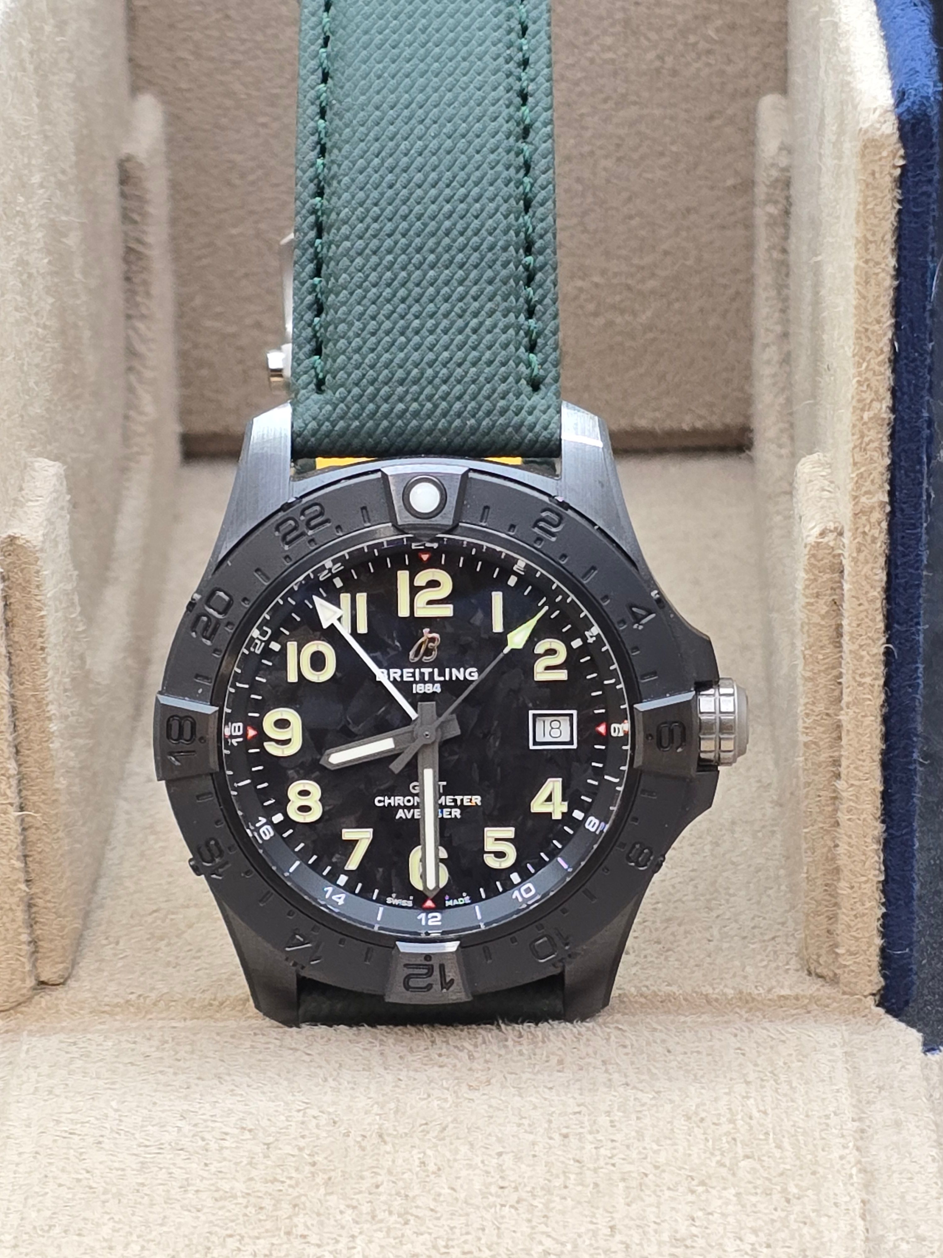 The Avenger GMT 44 Night Mission stands as one of Breitling’s most distinctive modern tool watches — merging aviation heritage with precision-engineered strength. Its 44 mm black DLC-coated titanium case delivers exceptional durability with minimal weight, while the carbon-pattern dial offers depth, stealth, and a refined tactical presence.Powered by the COSC-certified Breitling Caliber 32, this automatic movement provides dual-time-zone capability, a 42-hour power reserve, and a proven track record of accuracy trusted by pilots worldwide. Super-LumiNova numerals and hands ensure legibility even in the darkest cockpit or night mission.