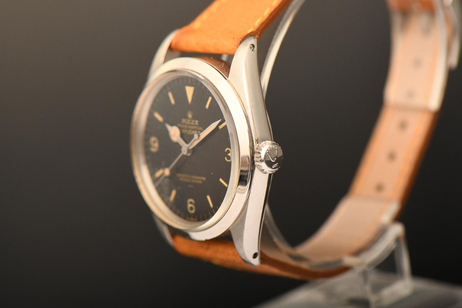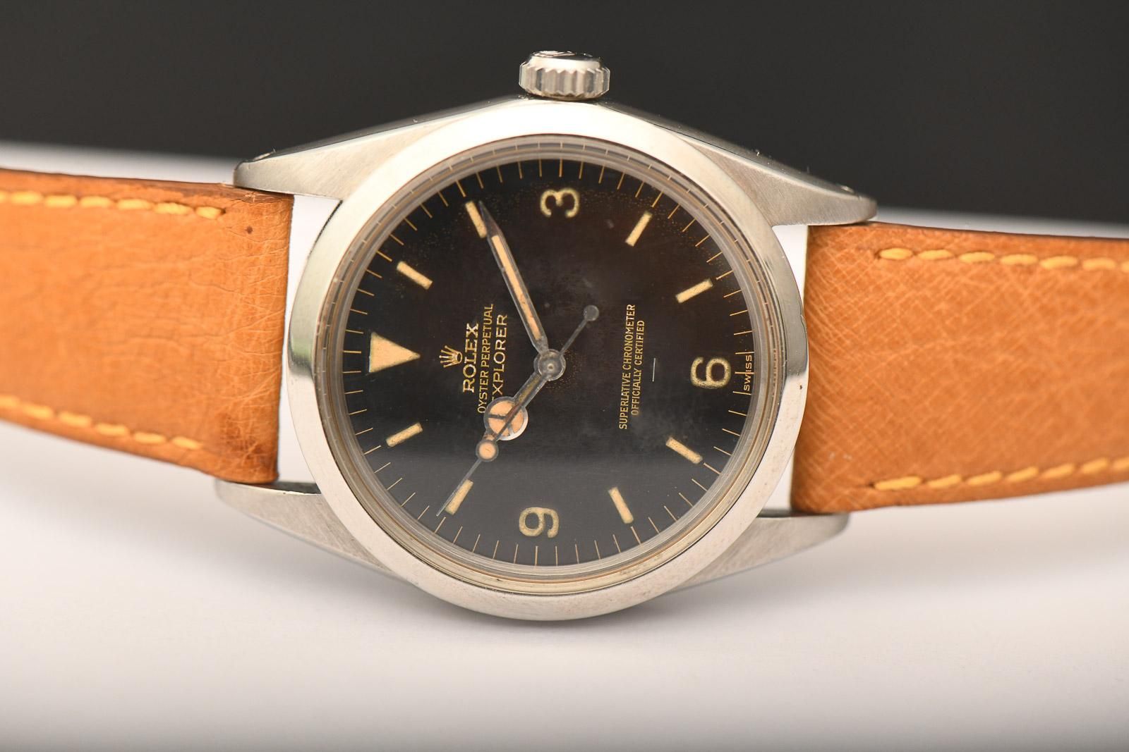 ROLEX 1016 Explorer 1963 Gilt Underline Tropical Dial. Rare Rolex Explorer 1, reference 1016, with a gilt underline dial. This variant was only produced for a short time during the transition from radium to tritium. Here we have a variant in which the dial has already browned slightly and reveals its full charm in sunlight. The watch dates from 1963, the serial number and caseback match perfectly, and the dial is also original in this configuration. The hands were probably replaced in the 1980s or 1990s during servicing, but they are tritium and also match in colour. The movement oscillates with an amplitude of 275 degrees and does not currently require servicing. The watch can be worn without any problems and is in good working order.