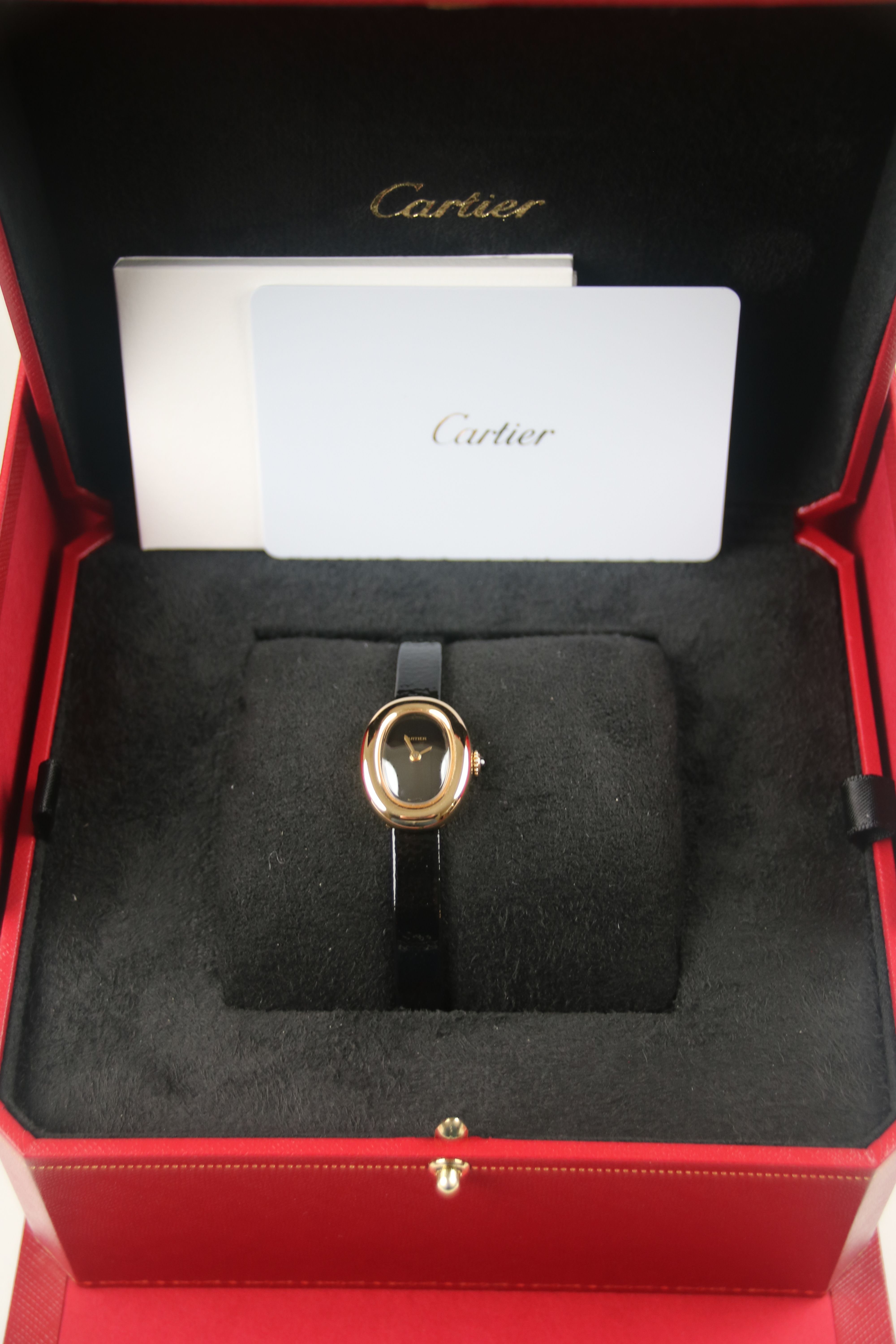 À vendre, une Cartier Baignoire neuve et jamais portée, en or jaune avec un cadran noir et un bracelet en cuir noir. La montre est vendue en ensemble complet, achetée chez un détaillant agréé en septembre 2025. Garantie mondiale Cartier jusqu'en 2033.